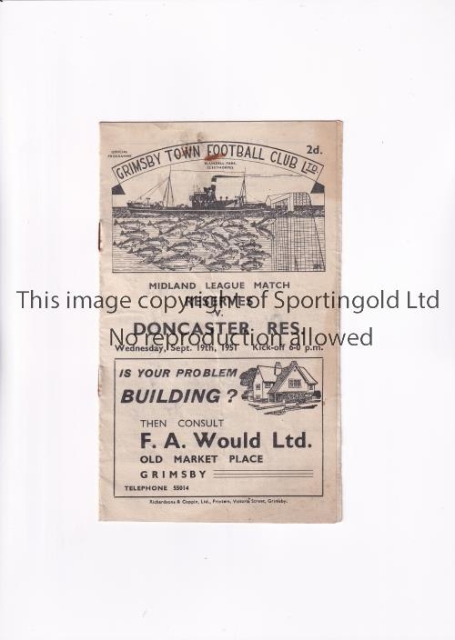 GRIMSBY TOWN V DONCASTER ROVERS 1951 Programme for the Midland League match at Grimsby 19/9/1951, slightly creased and very slight rust marks. Generally good