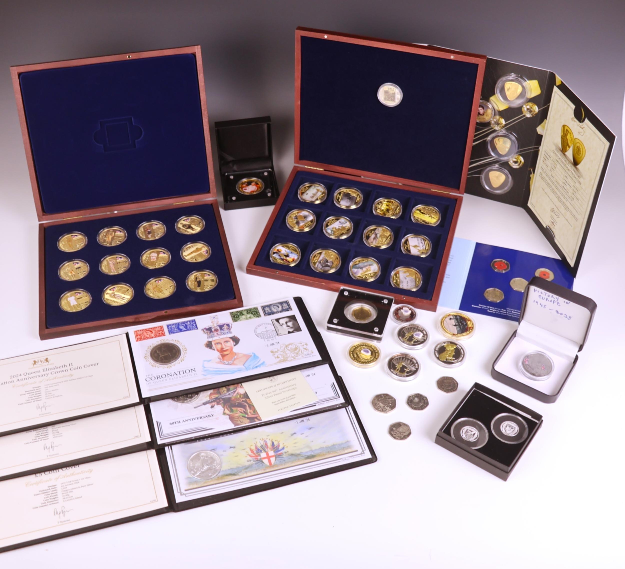 A large collection of commemorative and proof coin sets, some silver coloured, some cased including 'Elvis Presley The Official plectrum coin collection' 'Royal British Legion centenary 50p collection' and further examples (qty) (at fault) (some cased examples are incomplete or empty)