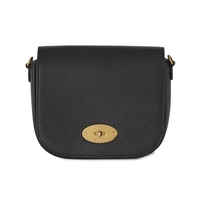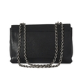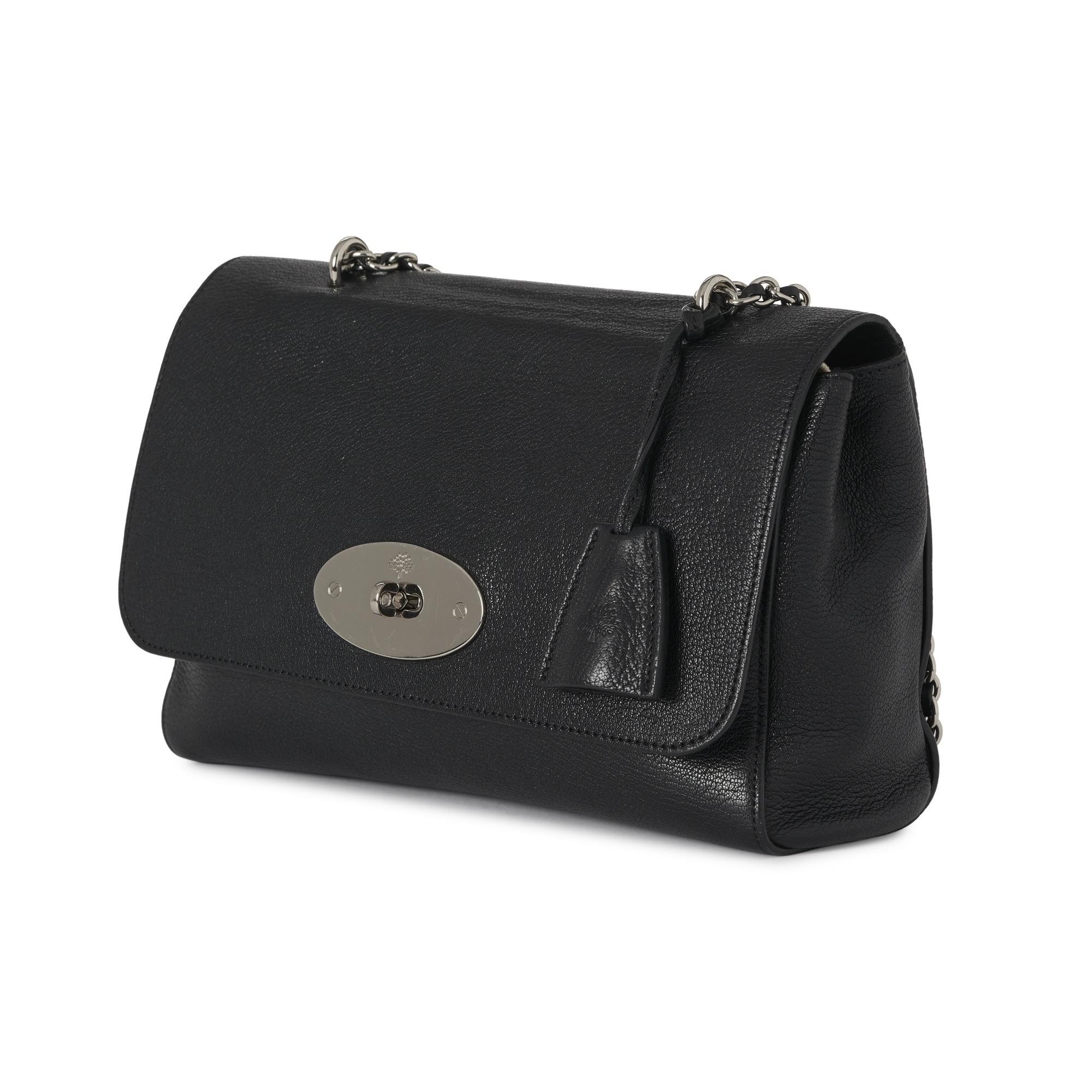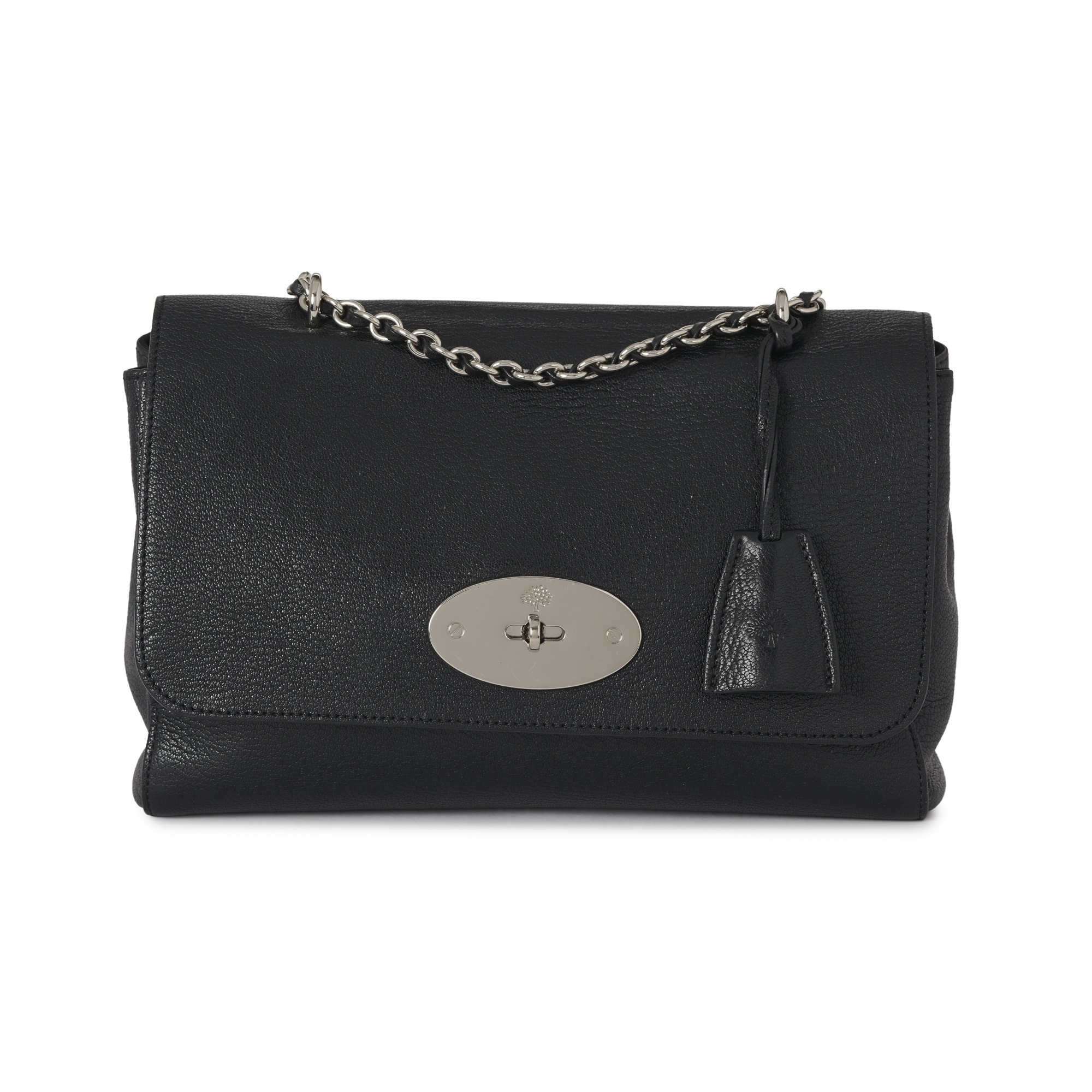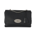 Mulberry, a medium black leather Lily handbag, featuring polished silver-tone hardware, chain and interwoven leather shoulder strap, detachable clochette with concealed padlock, signature postman's lock fastening, and one interior zip pocket, measuring 9 by 20 by 28cm, with maker's dust bag and care guide