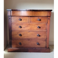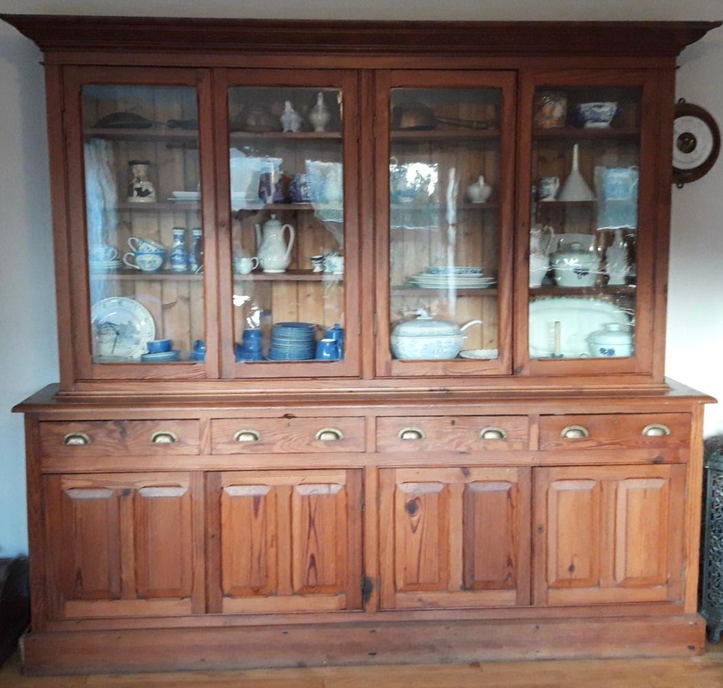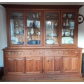A LATE 19TH CENTURY IRISH PITCH PINE FOUR DOOR BOOKCASE, with cornice over four glass panelled doors with shelved interior, above four drawers with brass cup handles, above cupboards, all raised on platform base. Dimensions: 242cm long x 223cm high x 45cm deep approx