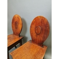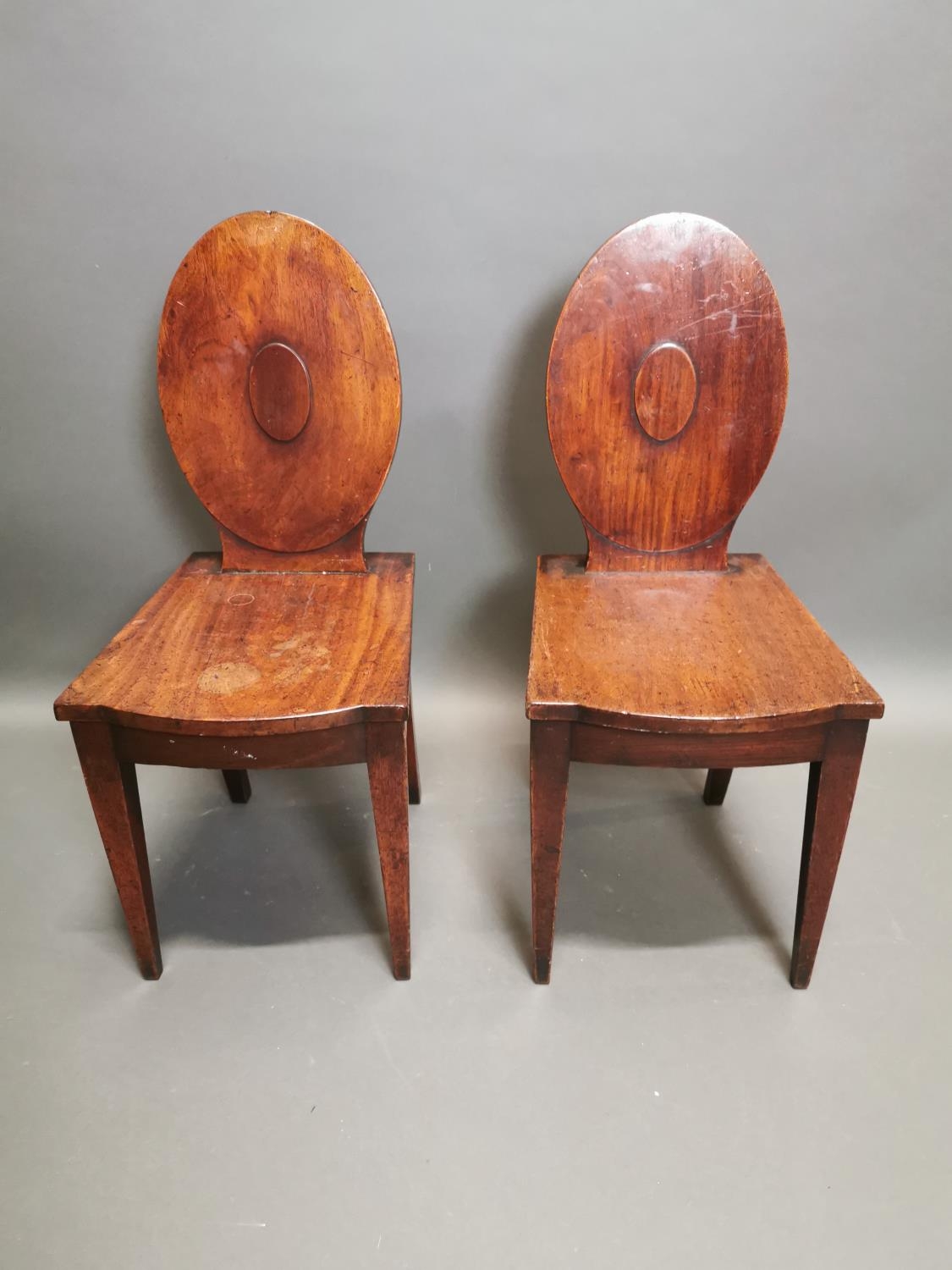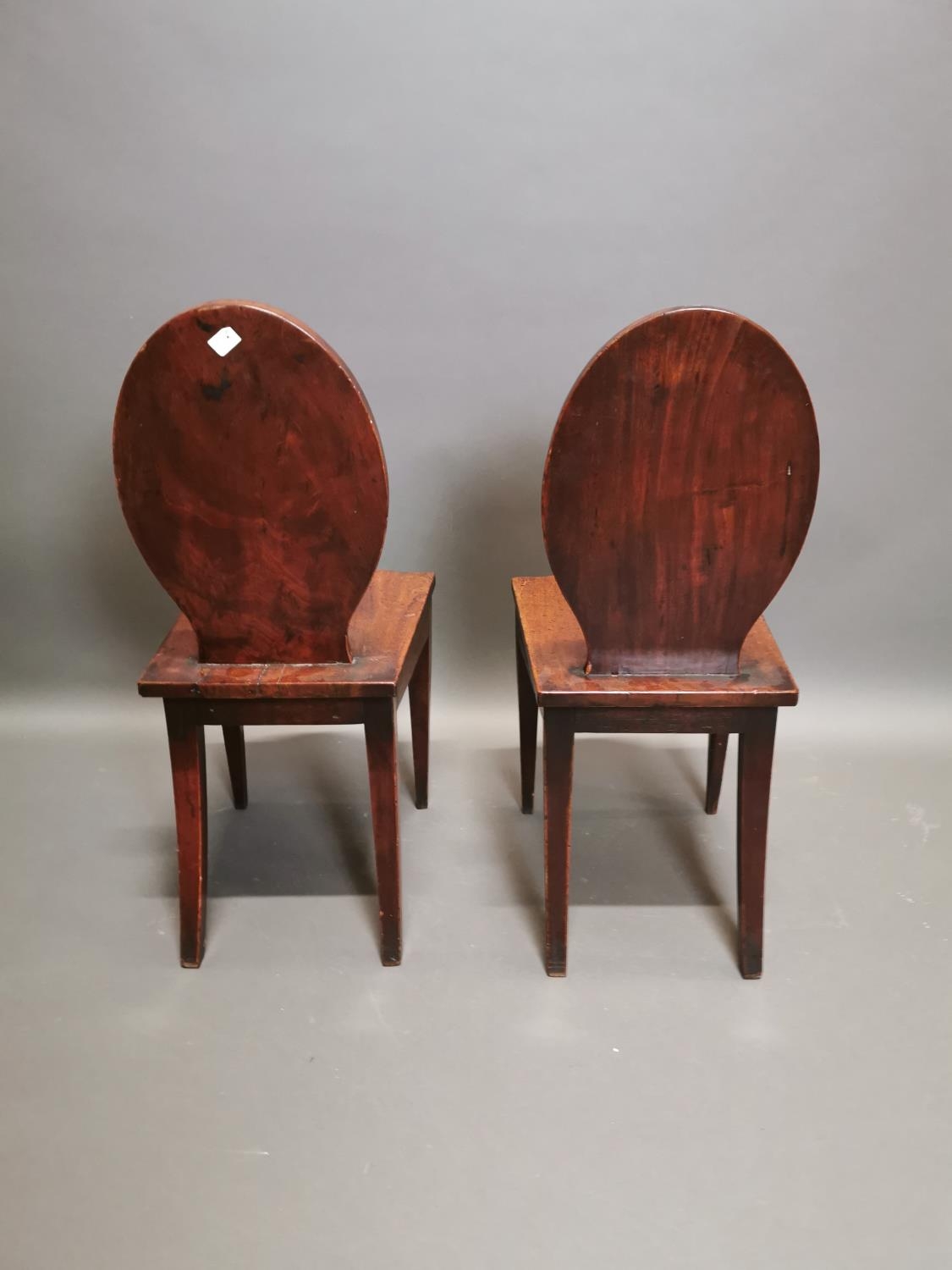 Pair of Irish Georgian mahogany shield back hall chairs on square tapered legs {90 cm H x 39 cm W x 51 cm D}.