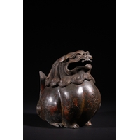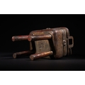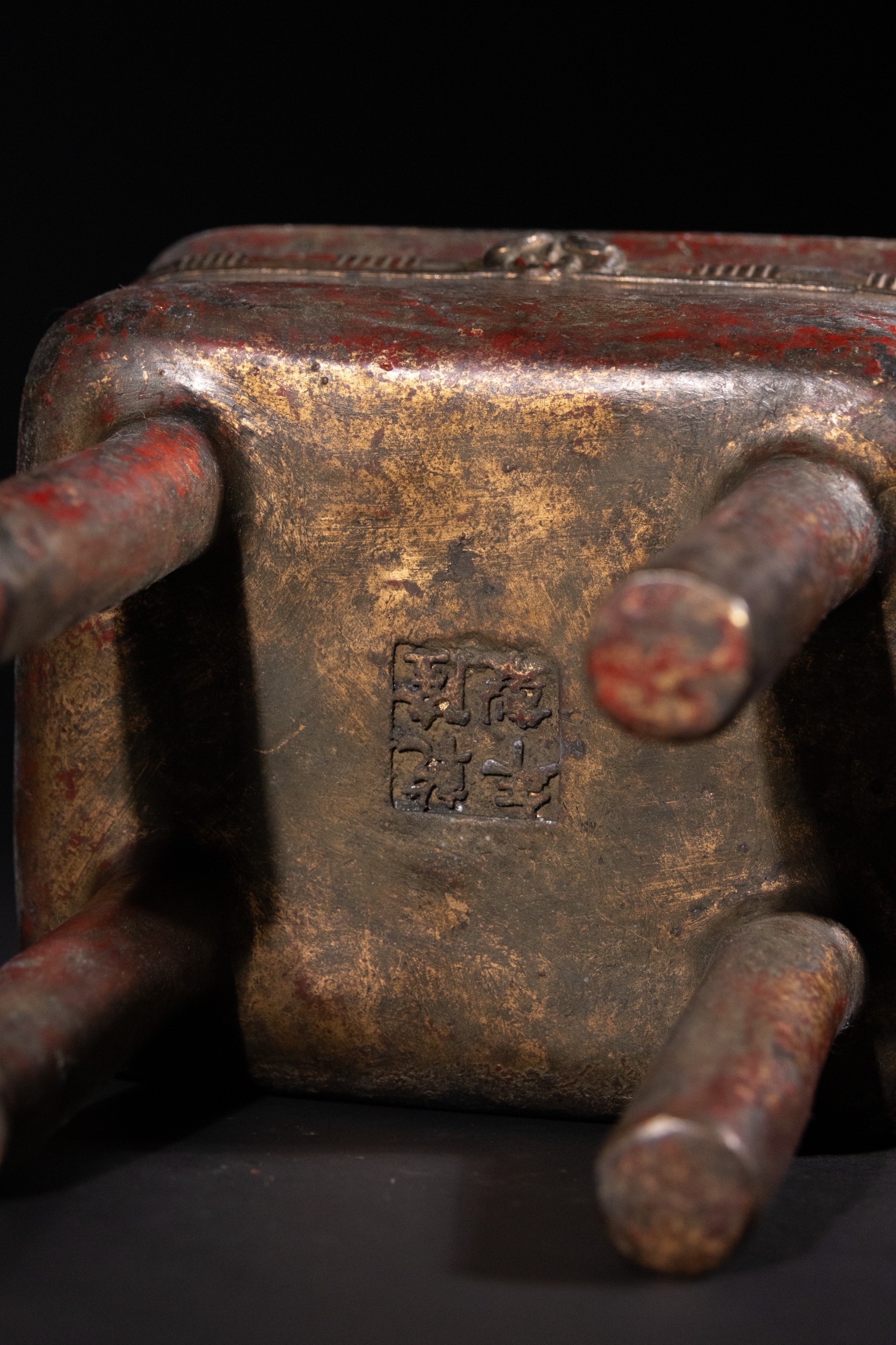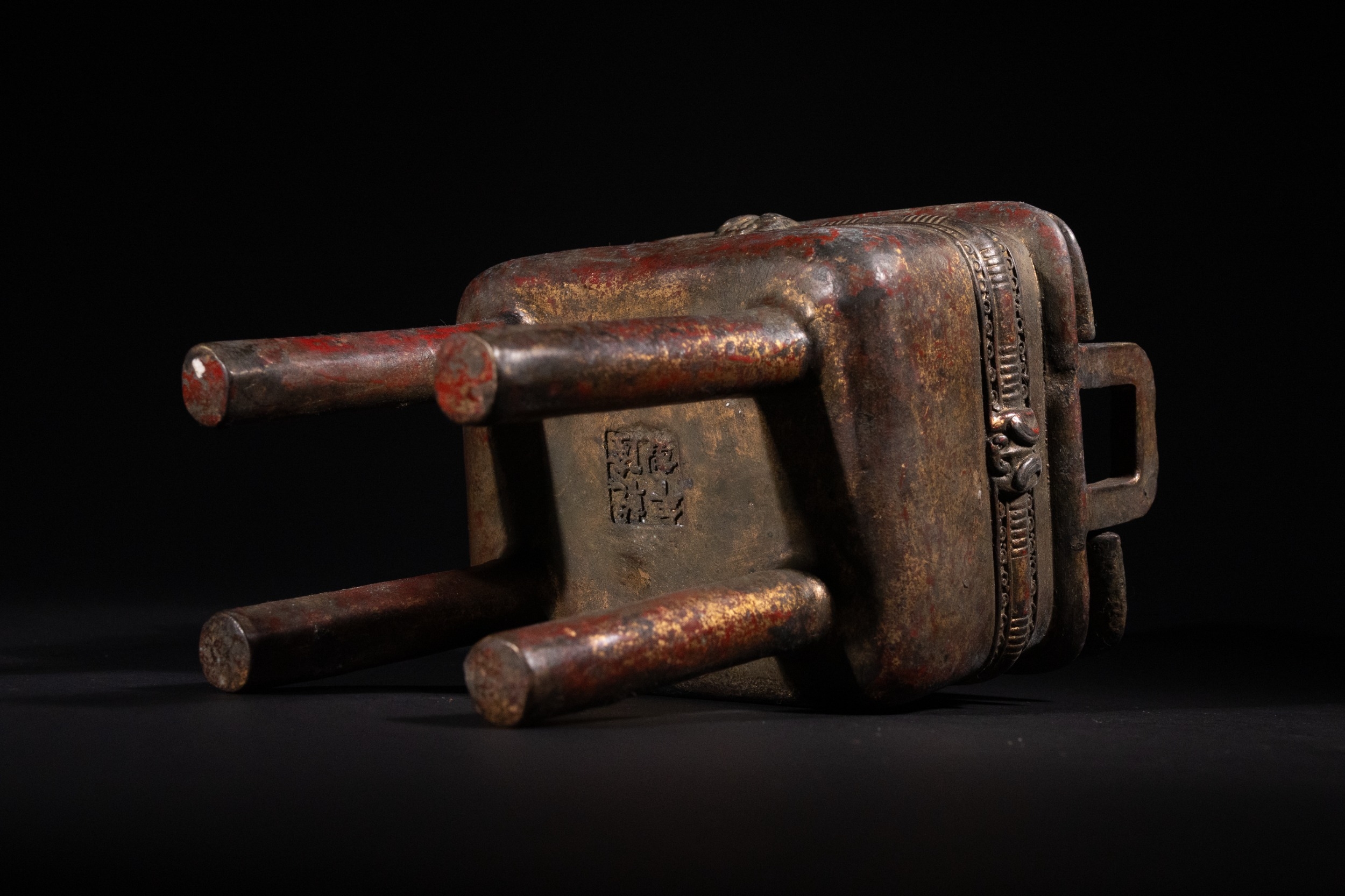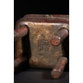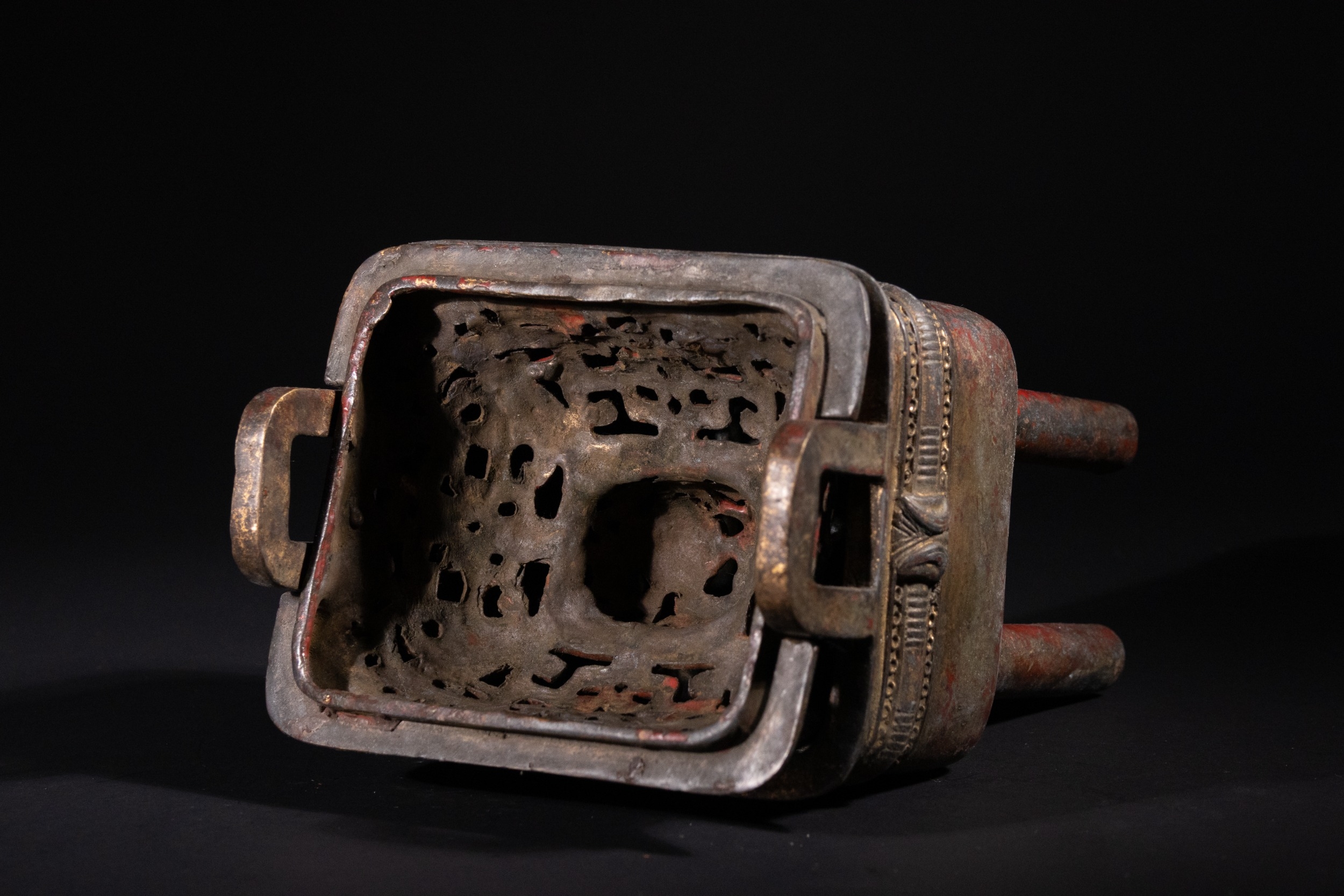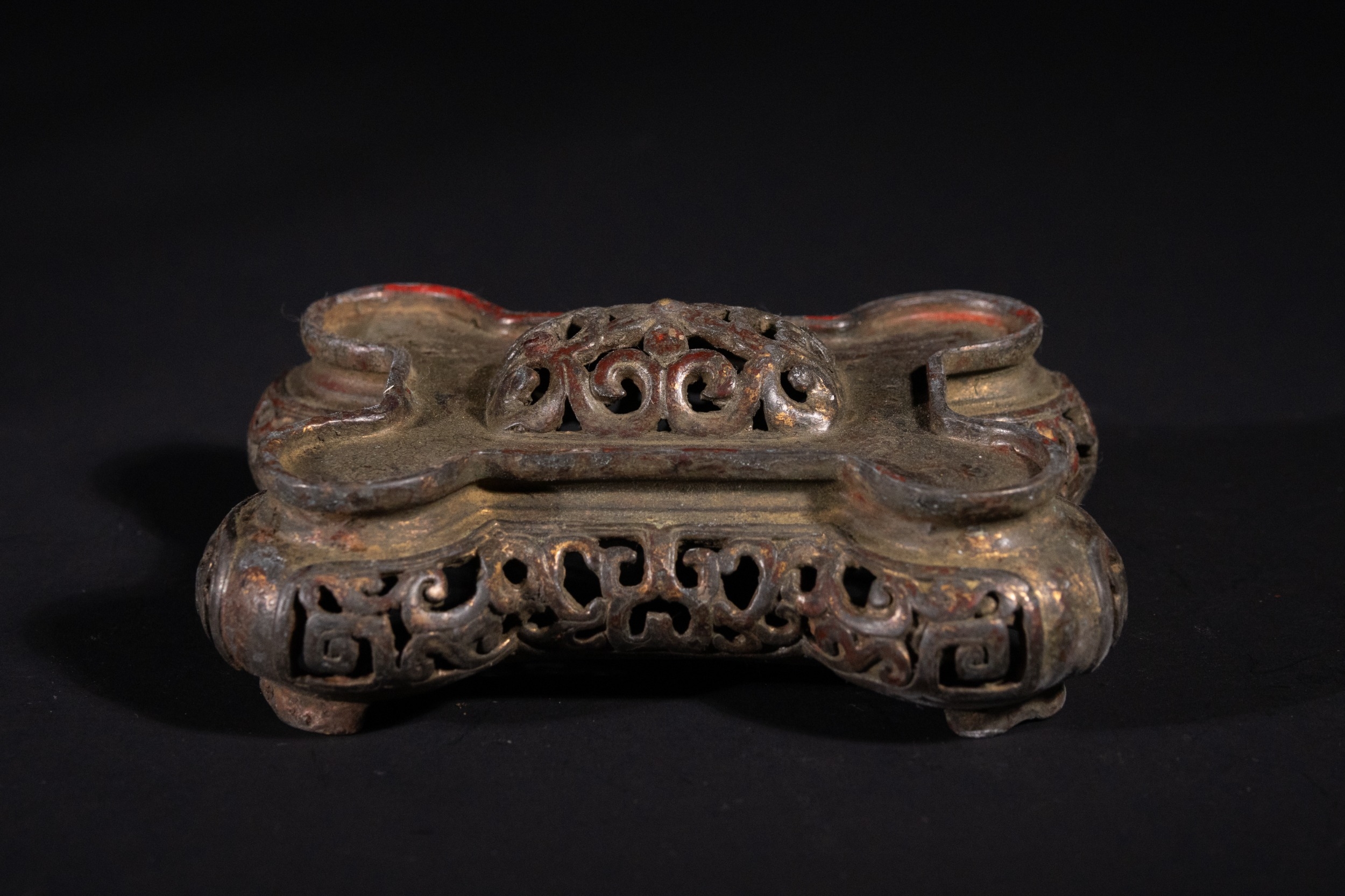 The item exhibits extensive surface wear, revealing a dark patina beneath remnants of red pigment and gold wash, particularly on raised details and the interior. The structure appears largely intact with no apparent losses or repairs.