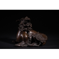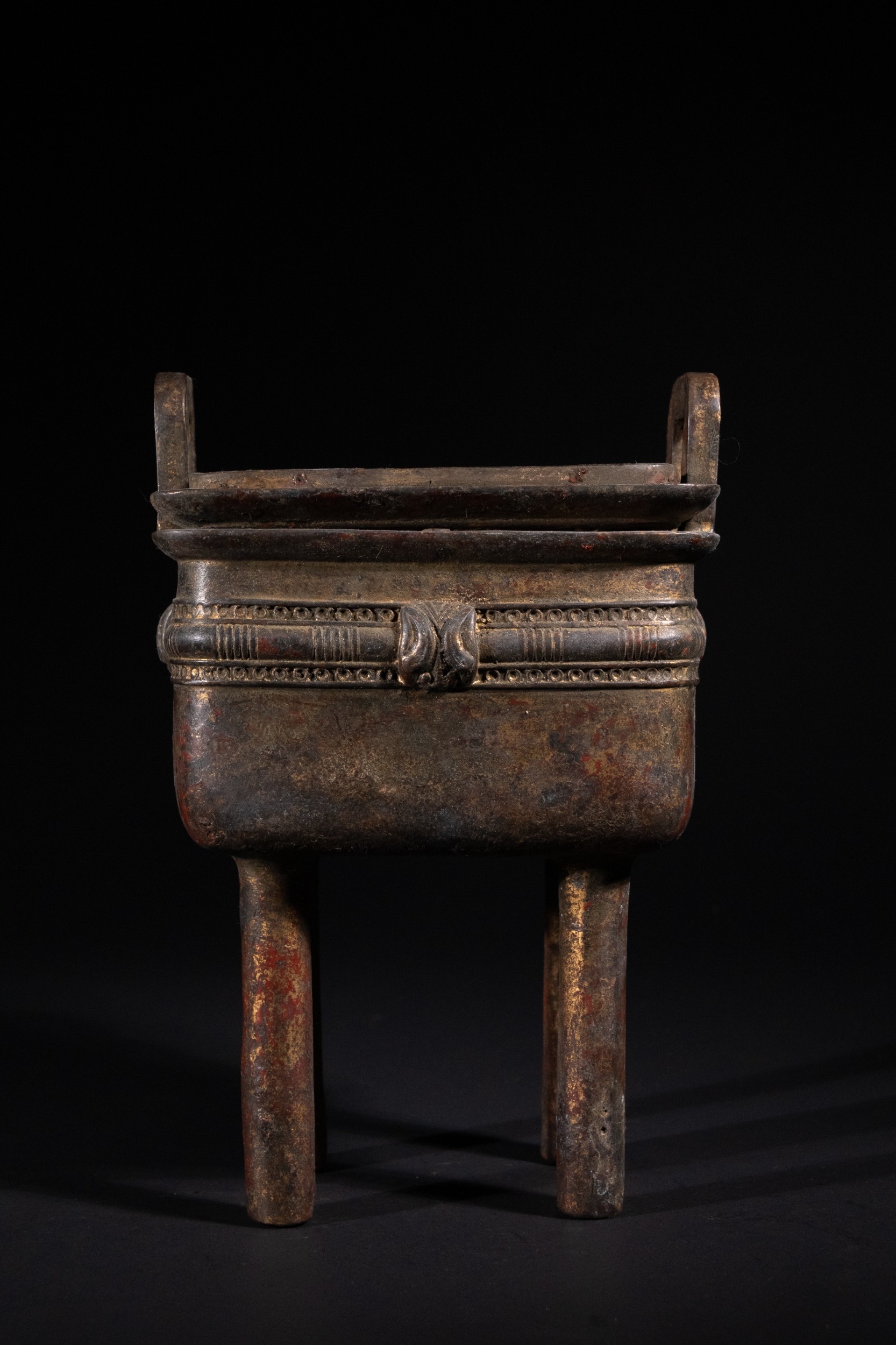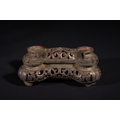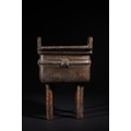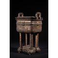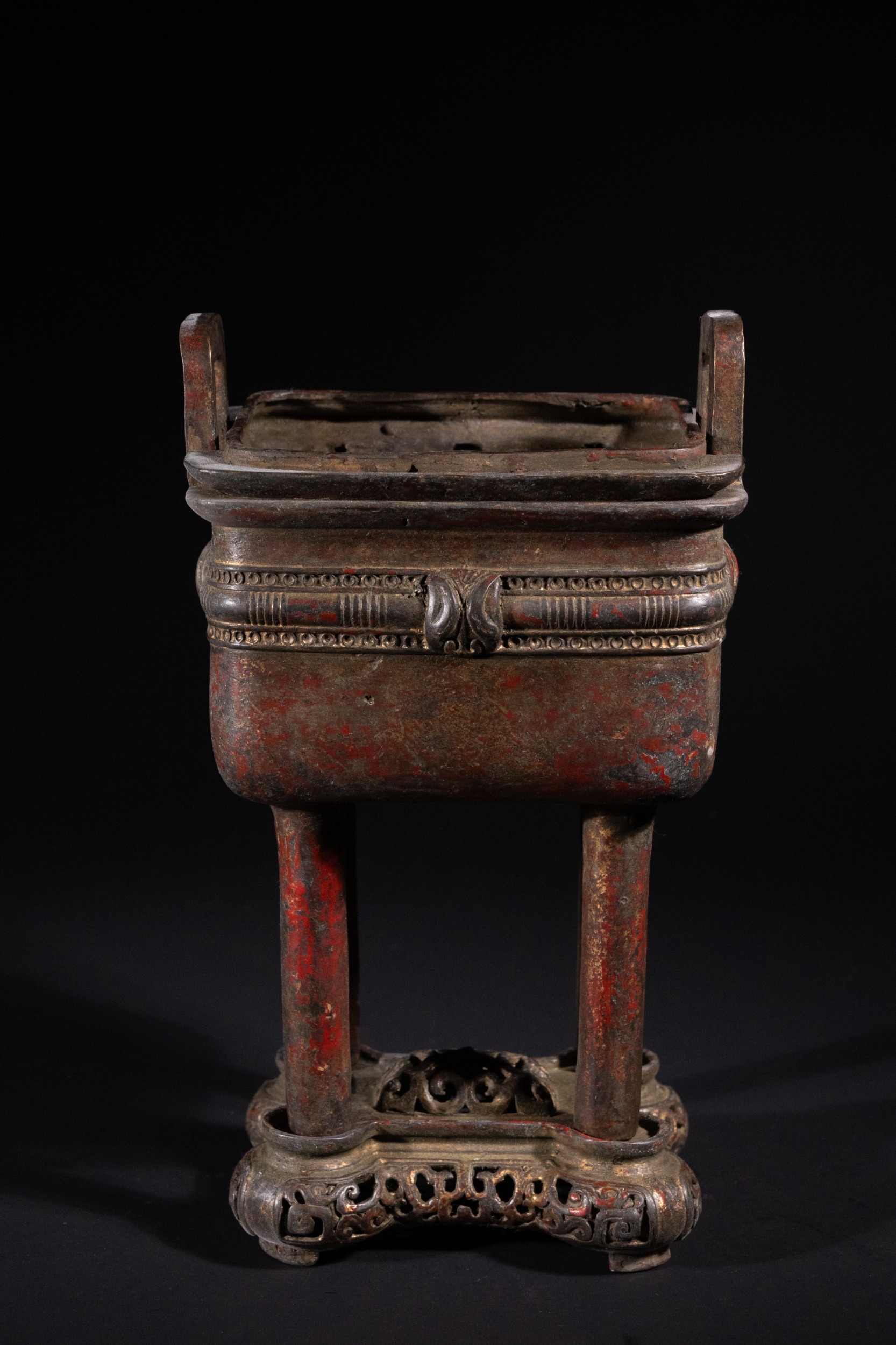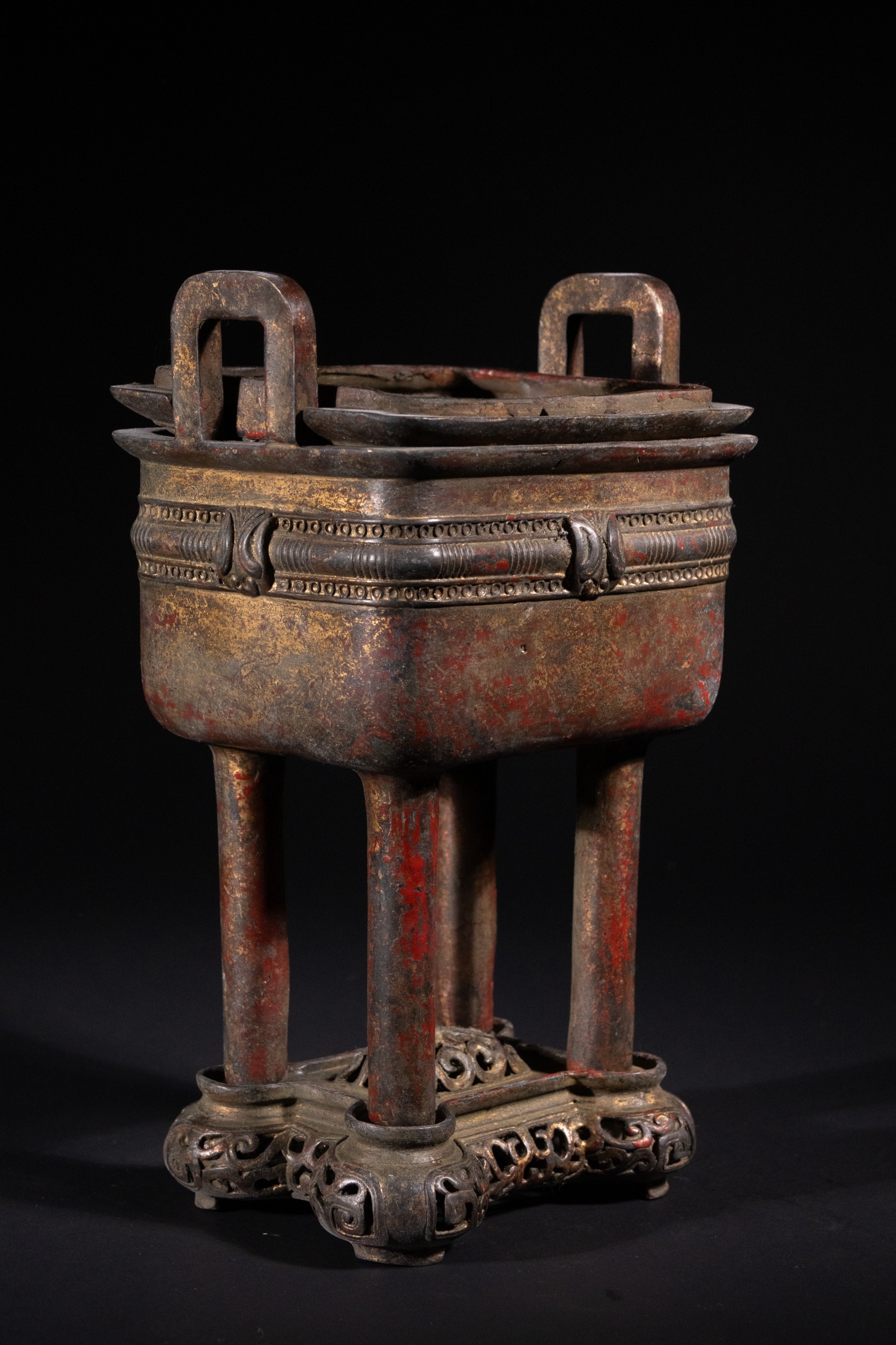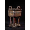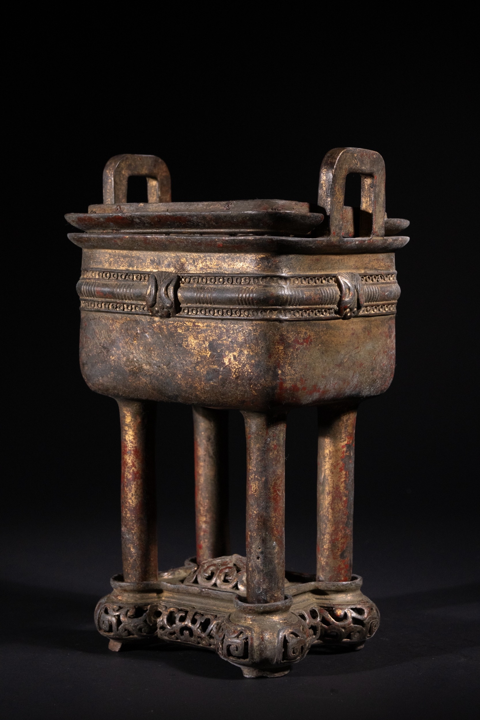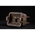 A Chinese Archaistic Bronze Fang Ding Censer, Xuande Mark - A Chinese archaistic bronze fang ding censer, presented as a rectangular vessel with a flat lid featuring two upright loop handles, supported by four cylindrical legs. A decorative band encircles the body, displaying stylized scrolling motifs and a central mask-like element. The censer rests on a separate, elaborately cast and pierced rectangular base with curvilinear and geometric fretwork. The underside of the vessel bears a cast four-character seal mark, "大明宣德" (Dà Míng Xuāndé), meaning "Great Ming Xuande."