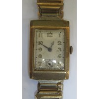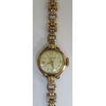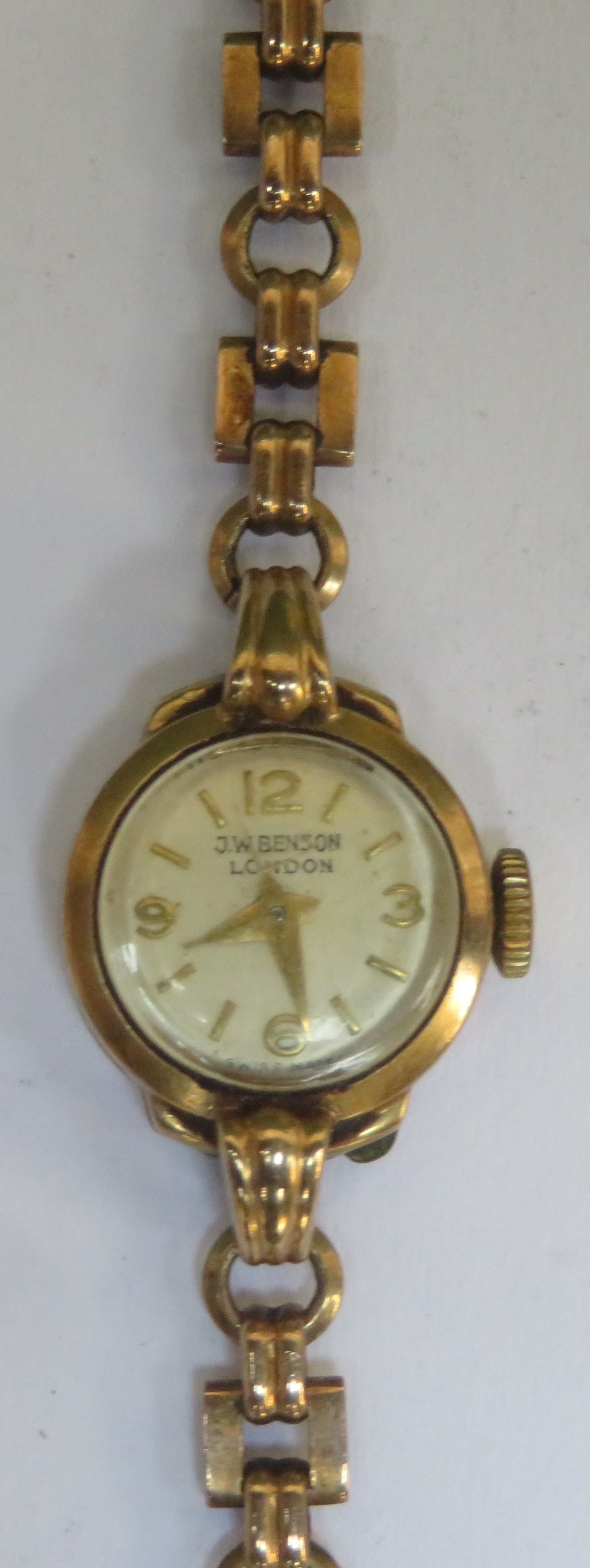 9ct gold Ladies J.W. Benson wrist watch on 9ct gold strap. Total weight. 11.1G