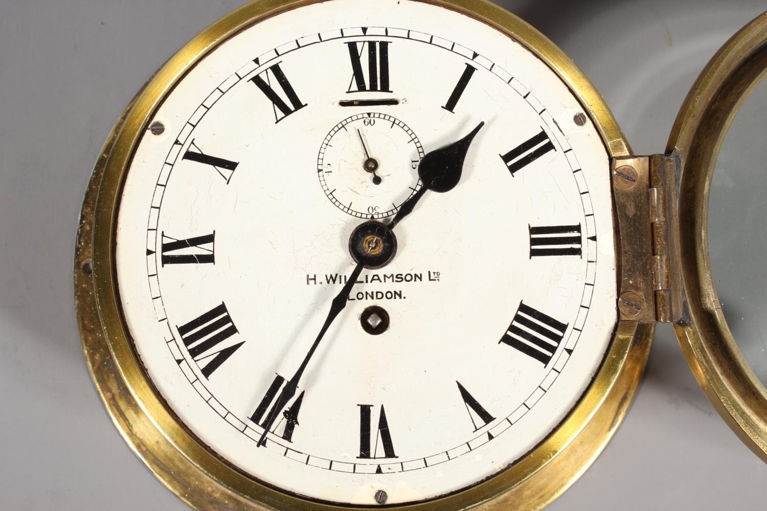 Brass bulk head wall clock H Williamson Ltd of London, 20cm diameter.