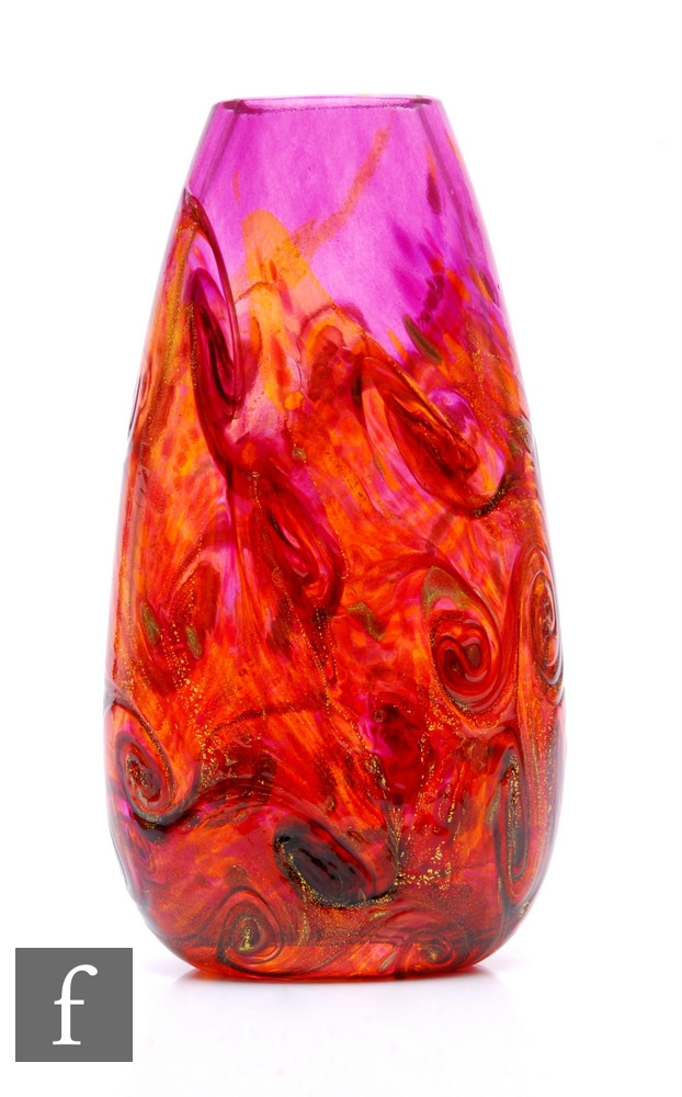 Ian McCulloch - Isle of Wight Glassworks - A contemporary studio glass vase of compressed ovoid form, the amethyst body decorated with self coloured swirls and gold aventurine, engraved signature and dated 2005, height 25cm.