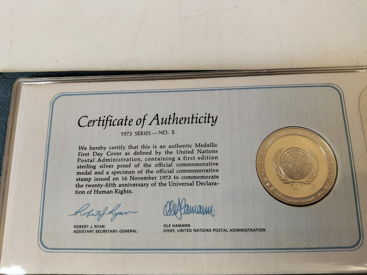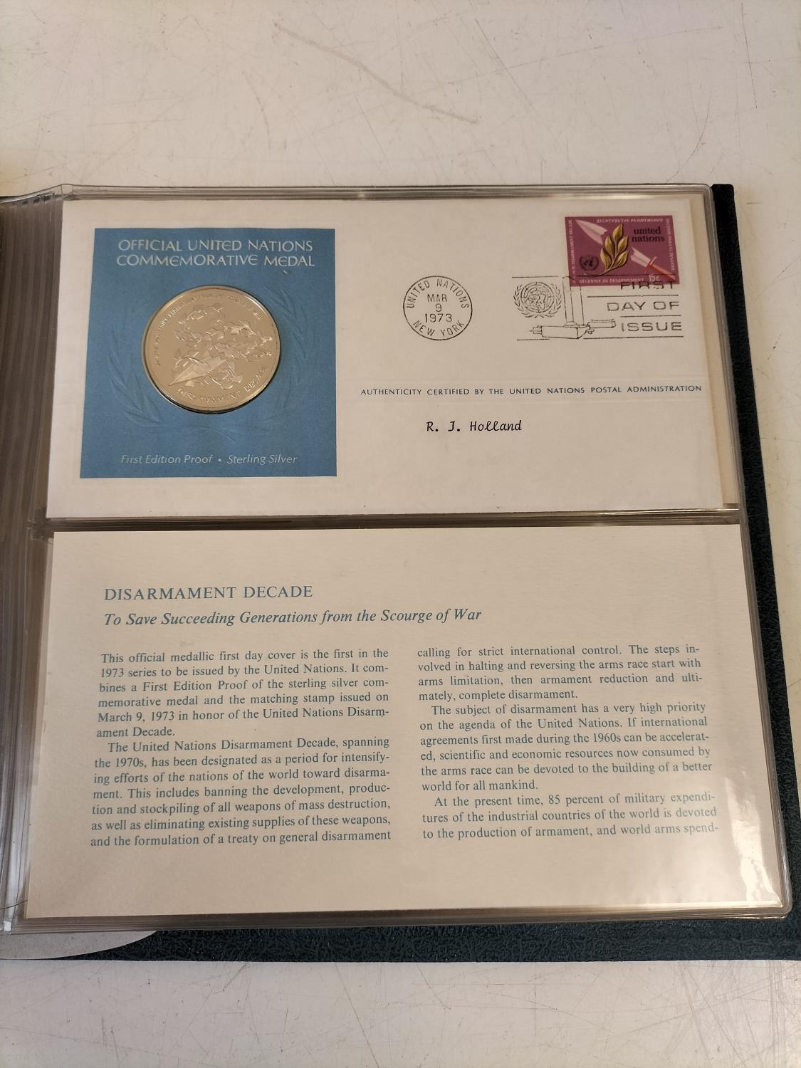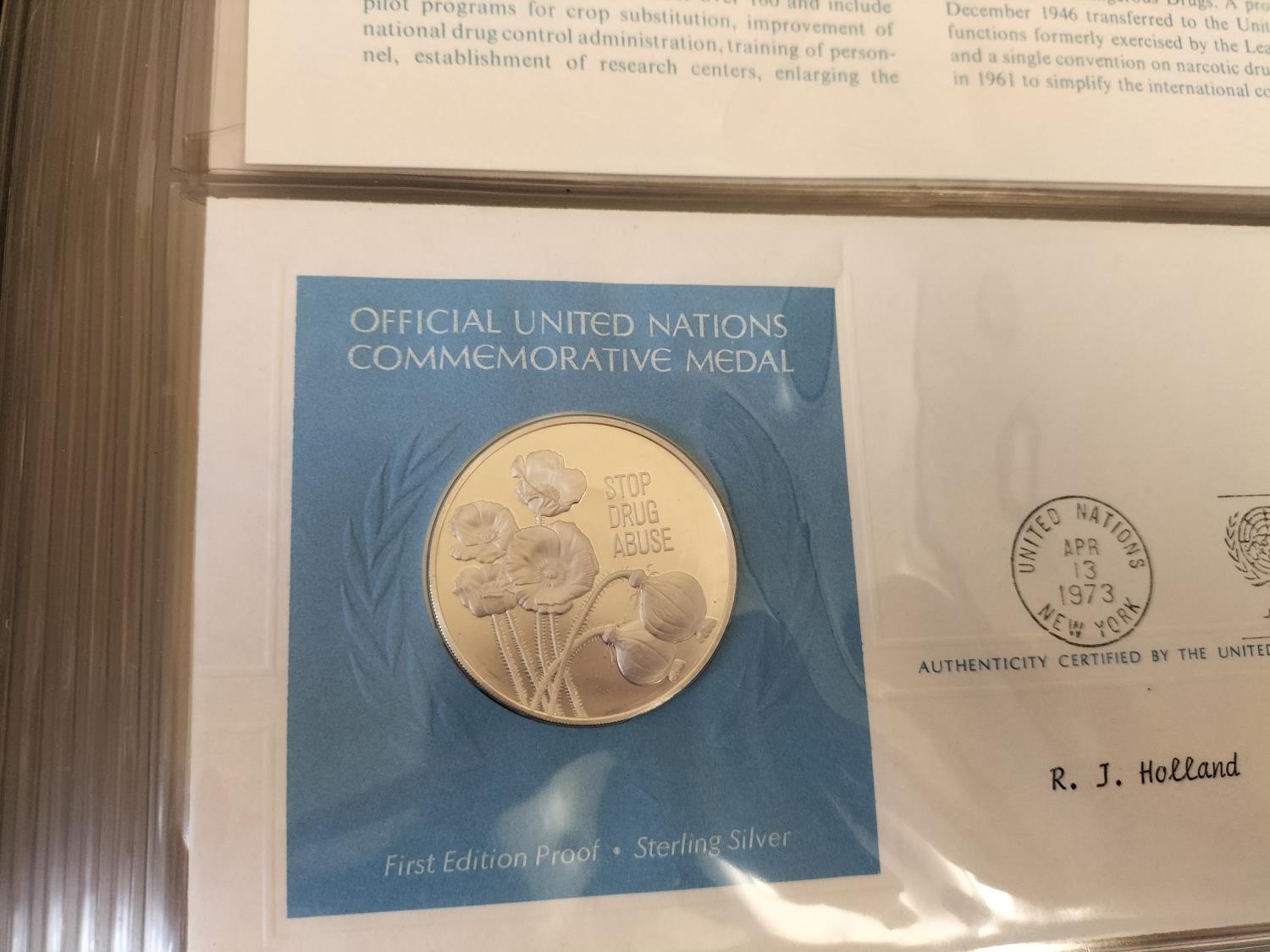 1973 Official United Nations Medallic First Day covers containing 5 x First Edition Sterling Silver Proof Crown Size Medals.