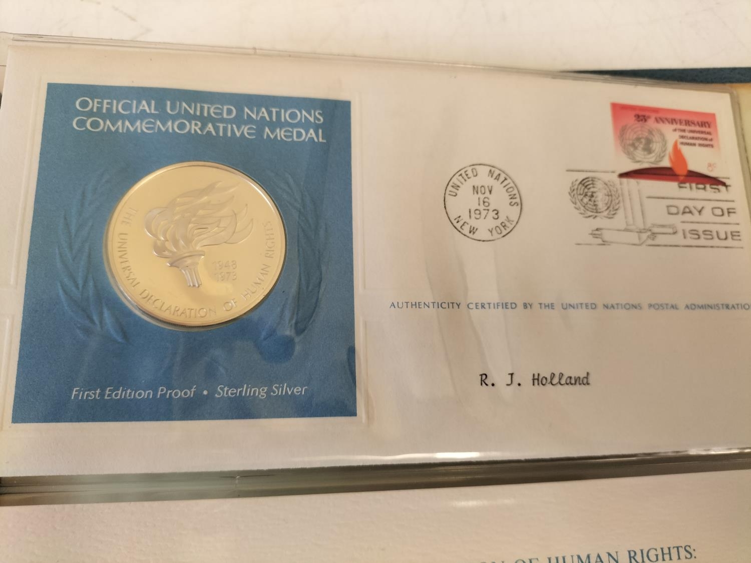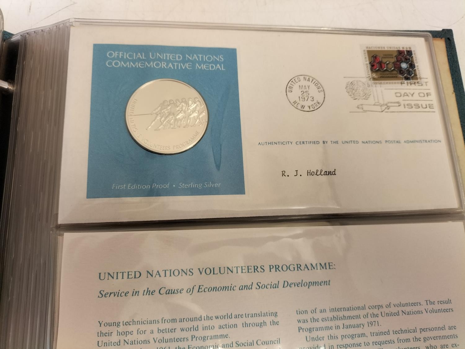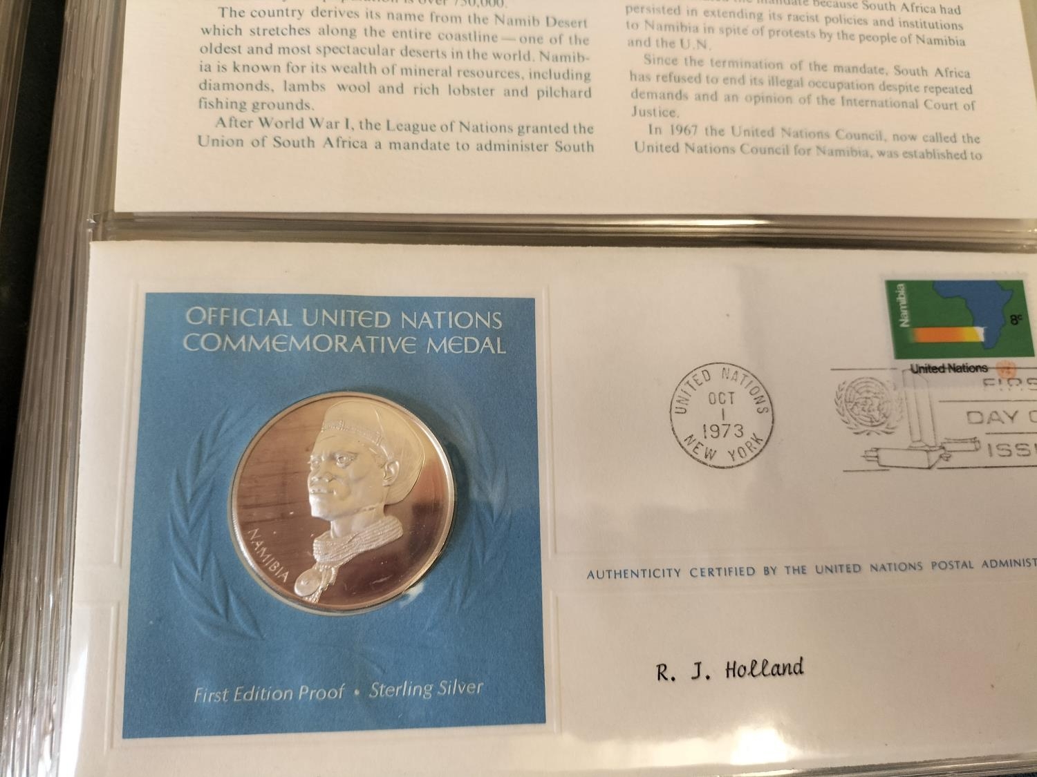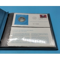 1973 Official United Nations Medallic First Day covers containing 5 x First Edition Sterling Silver Proof Crown Size Medals.