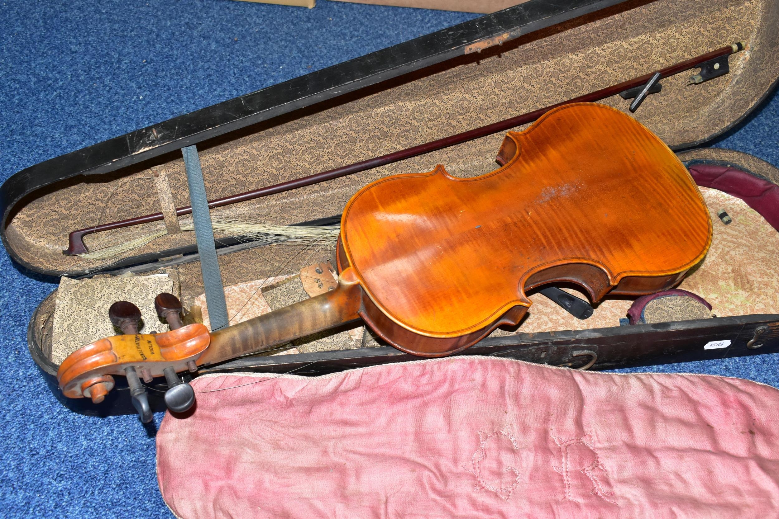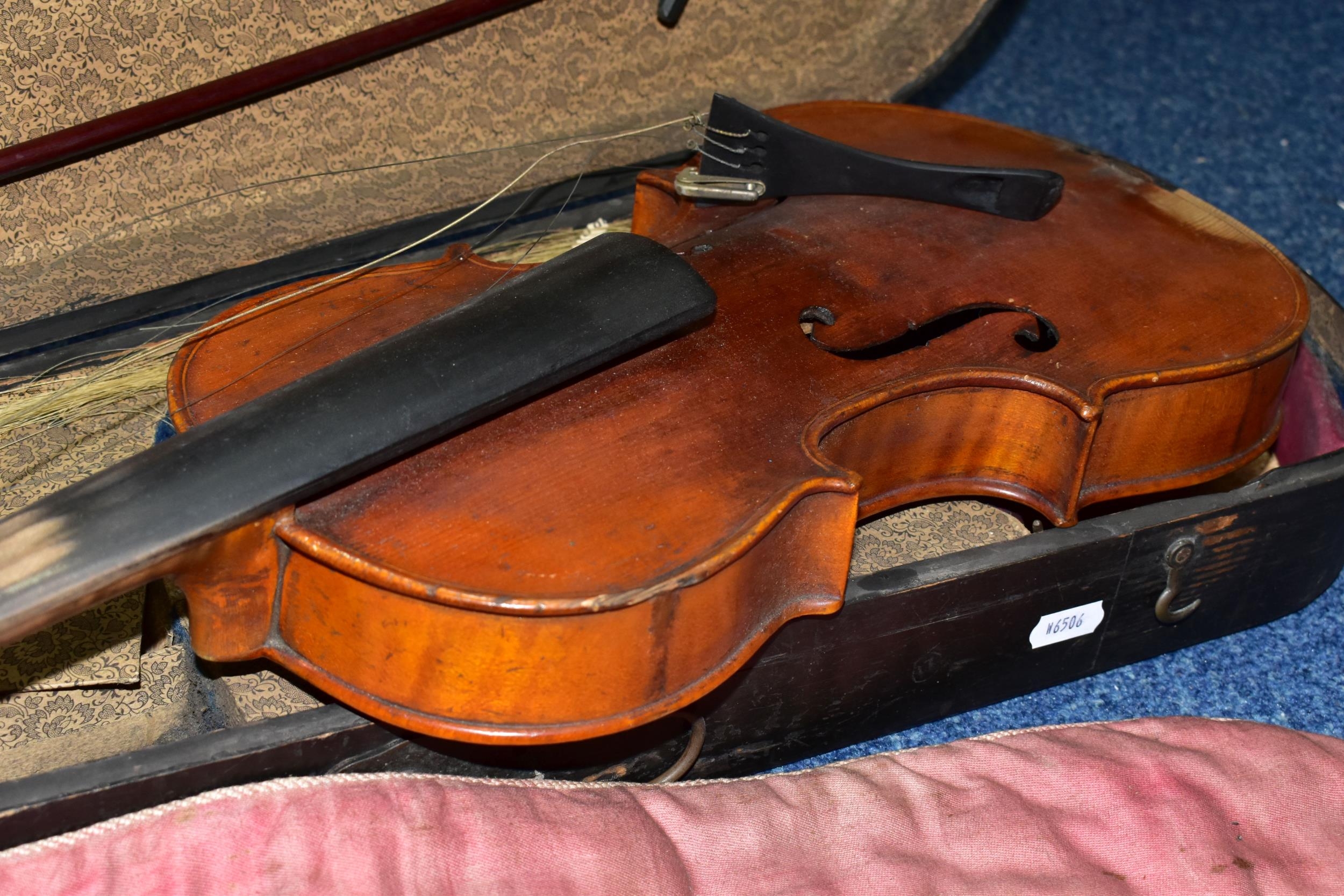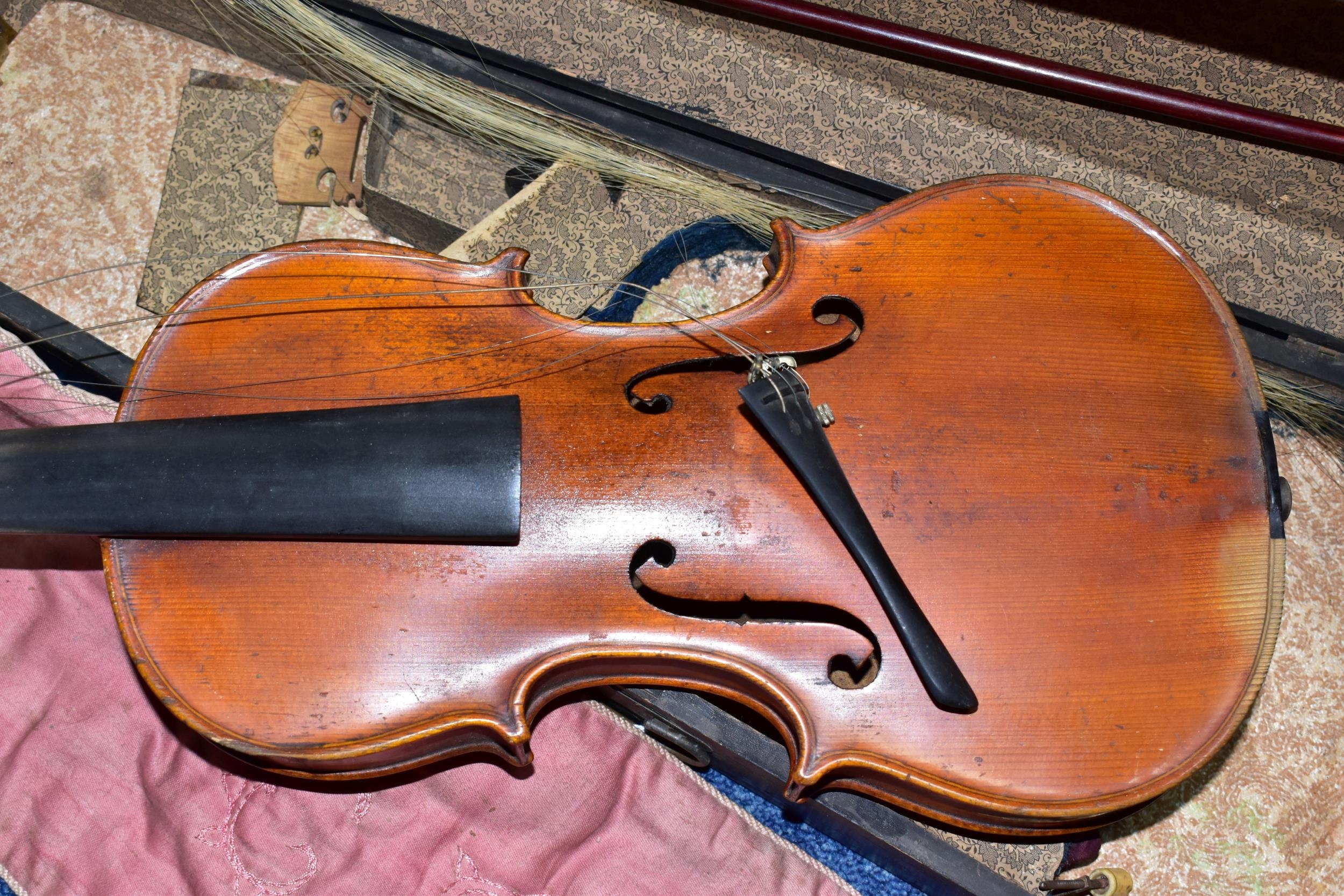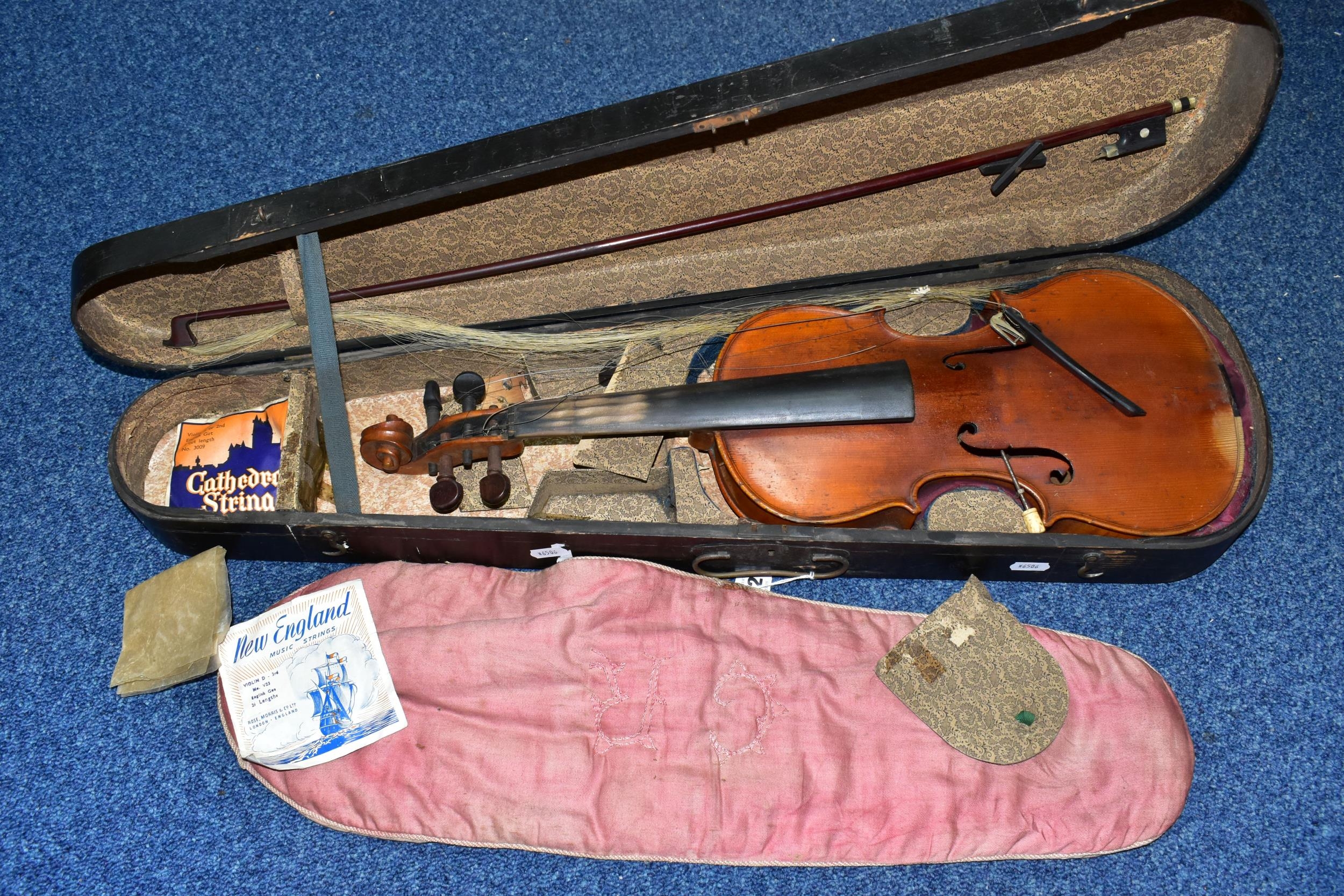 AN EARLY 20th CENTURY GERMAN 3/4 SIZE VIOLIN badged Antonius Stradivarius Germany to the interior, two piece spruce table with flamed back sides and neck, ebonised fingerboard ( pitted with paint loss), an ebony tailpiece ( distressed ) in a painted coffin case and a distressed bow