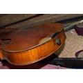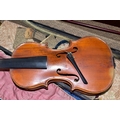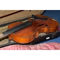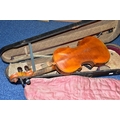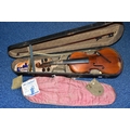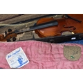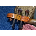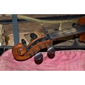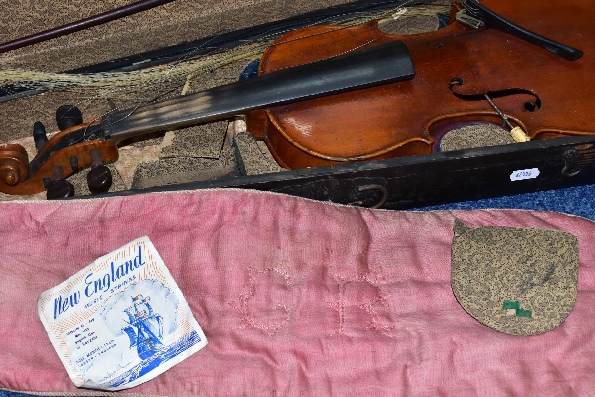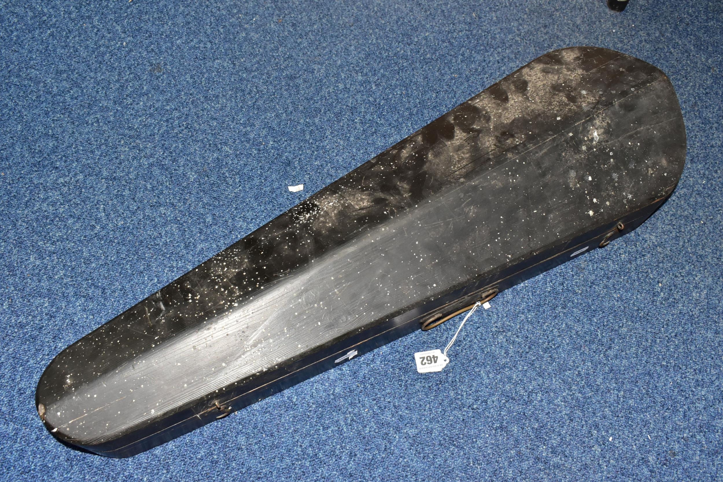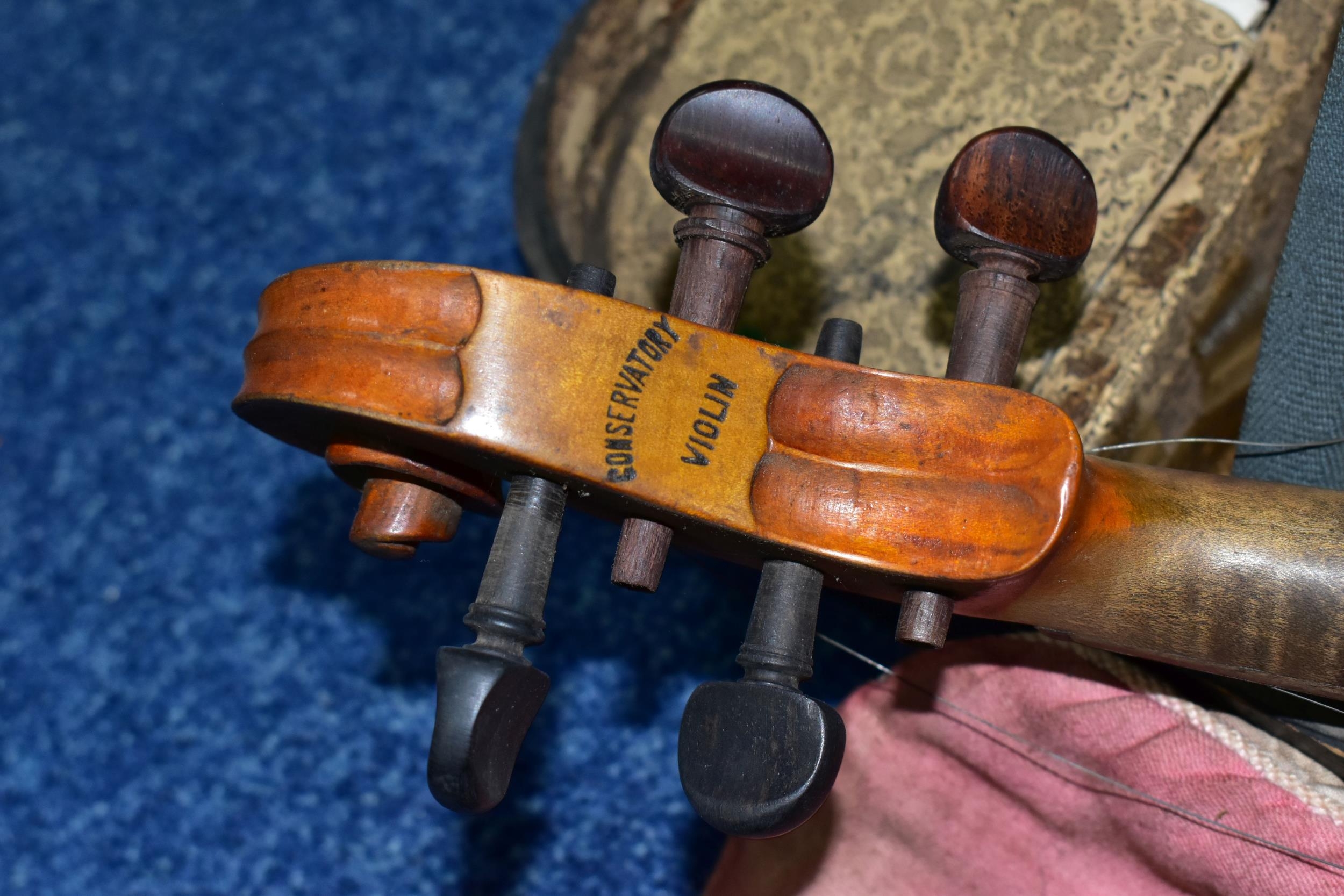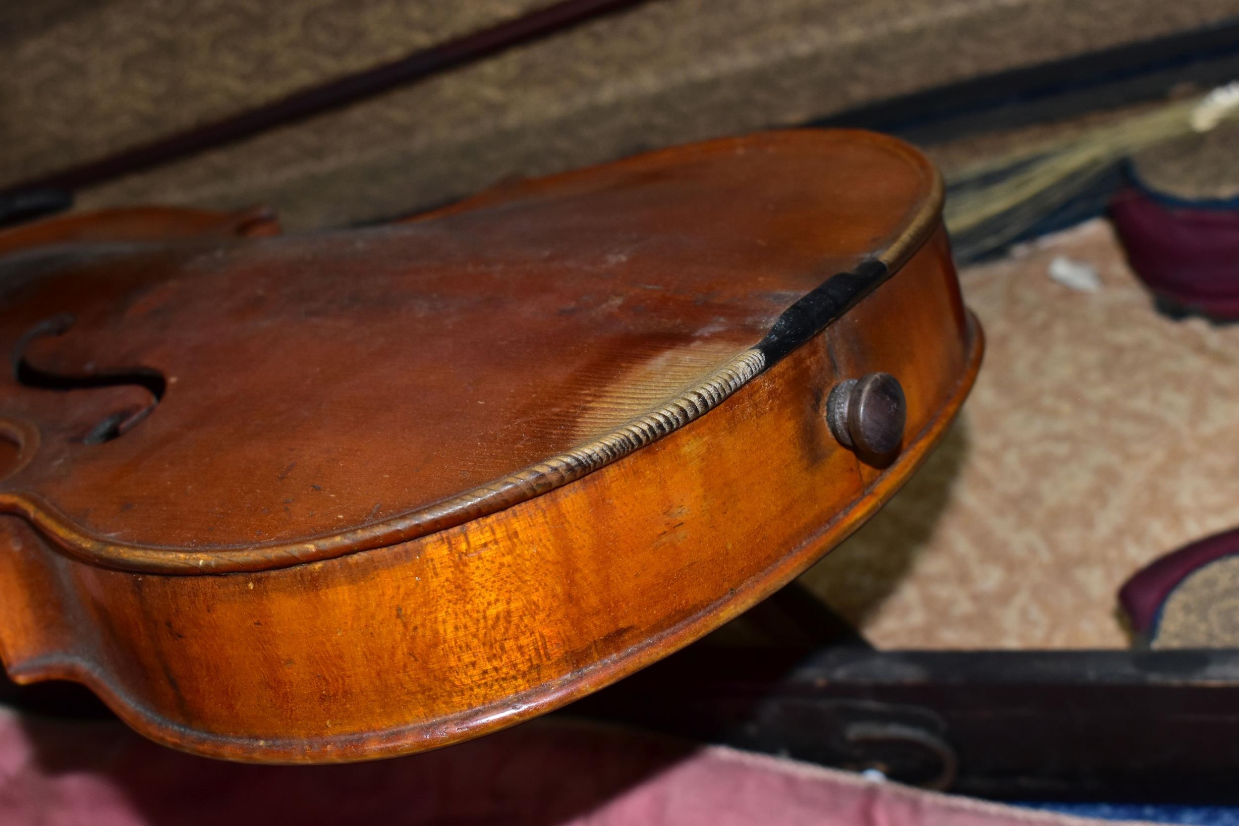AN EARLY 20th CENTURY GERMAN 3/4 SIZE VIOLIN badged Antonius Stradivarius Germany to the interior, two piece spruce table with flamed back sides and neck, ebonised fingerboard ( pitted with paint loss), an ebony tailpiece ( distressed ) in a painted coffin case and a distressed bow