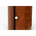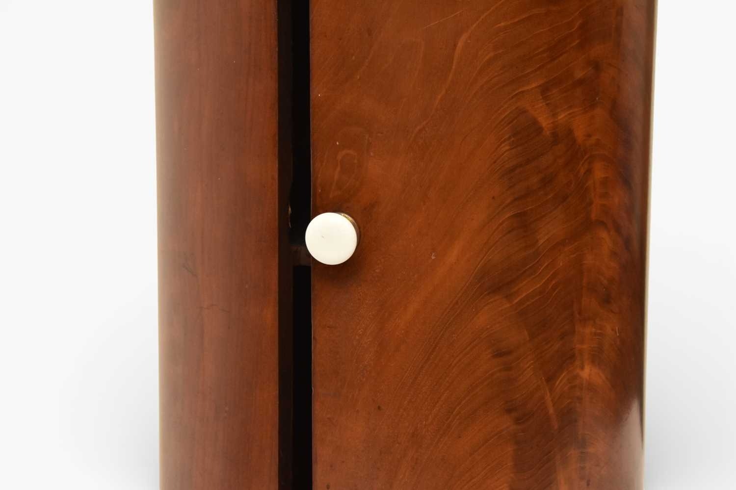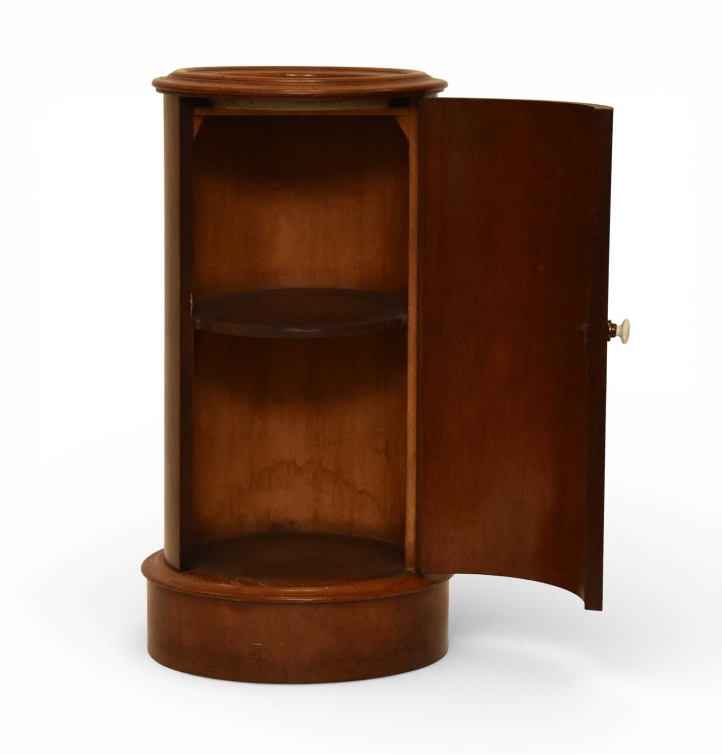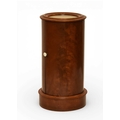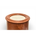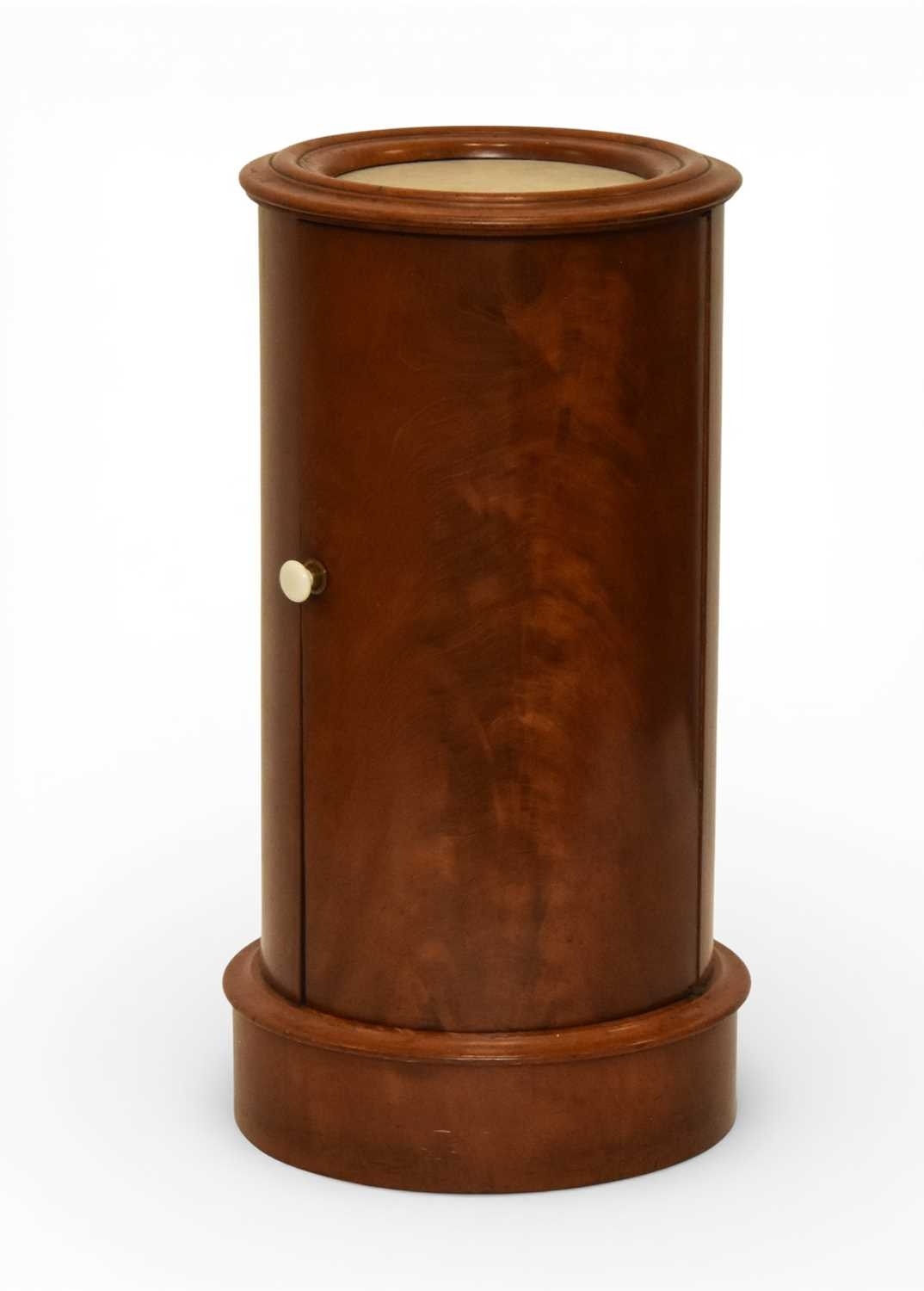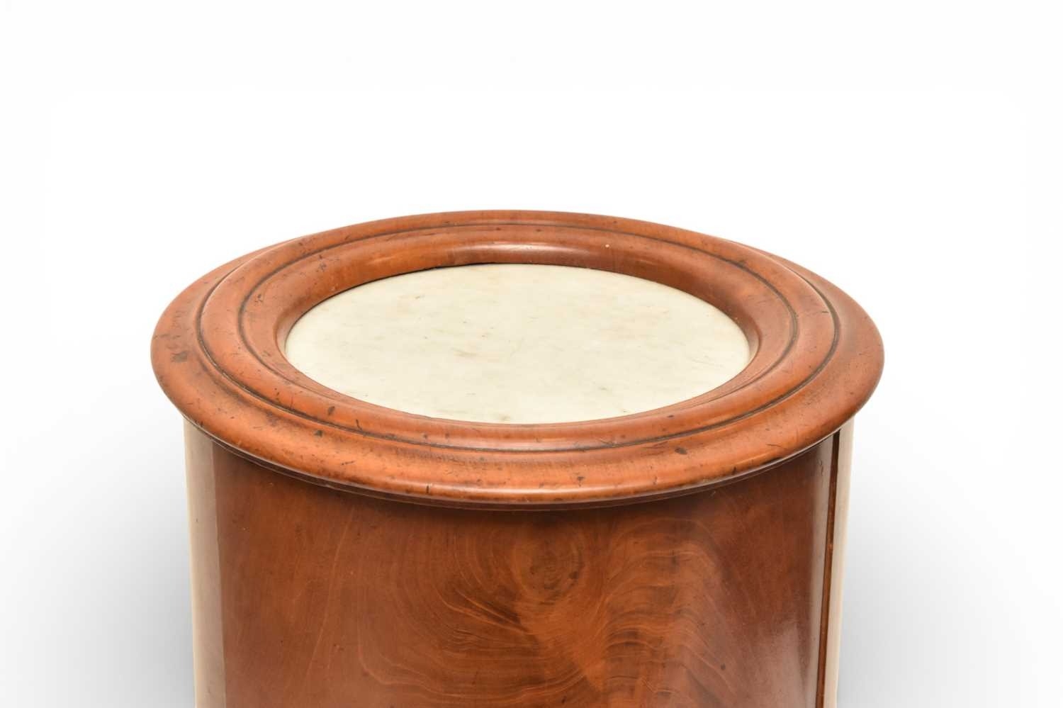A George III mahogany marble inset drum pot cupboard The molded top over a single door opening onto a fitted shelf, raised on a molded plinth. 40cm diameter x 79cm high