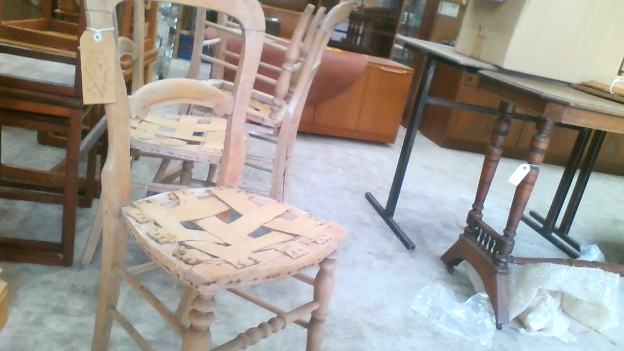 A set of 4 Pine Balloon Back Dining Chairs-Need Restoration, good upholstery project.