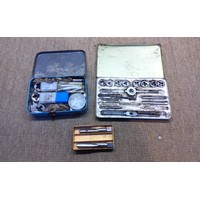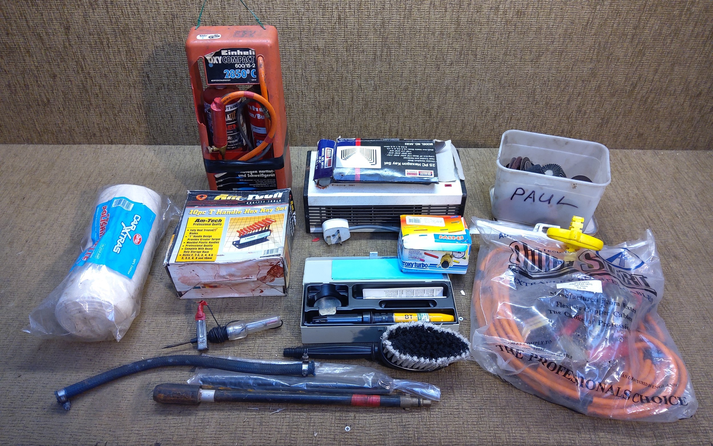 Garage tools including Einhell Oxy compact, boxed Hex key set and vintage handheld cordless soldering iron.