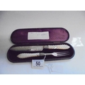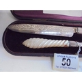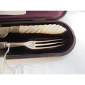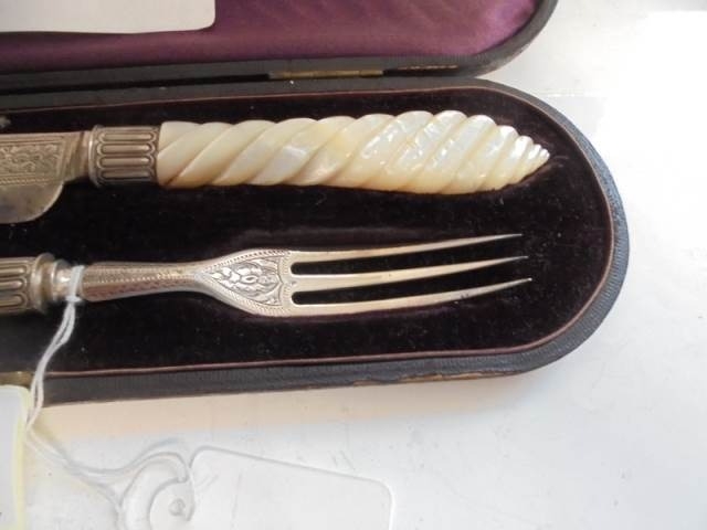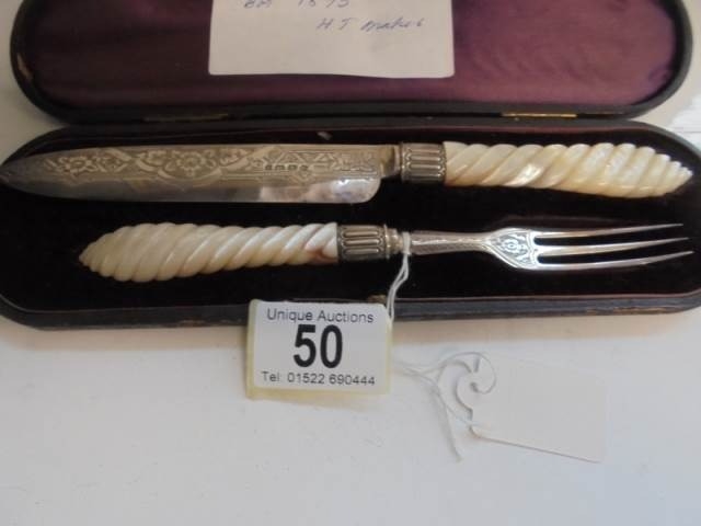 A cased serving knife and fork with silver blades and mother of pearl handles, Birmingham 1872, Maker H T.