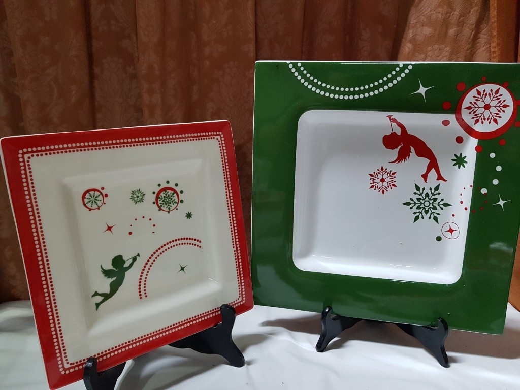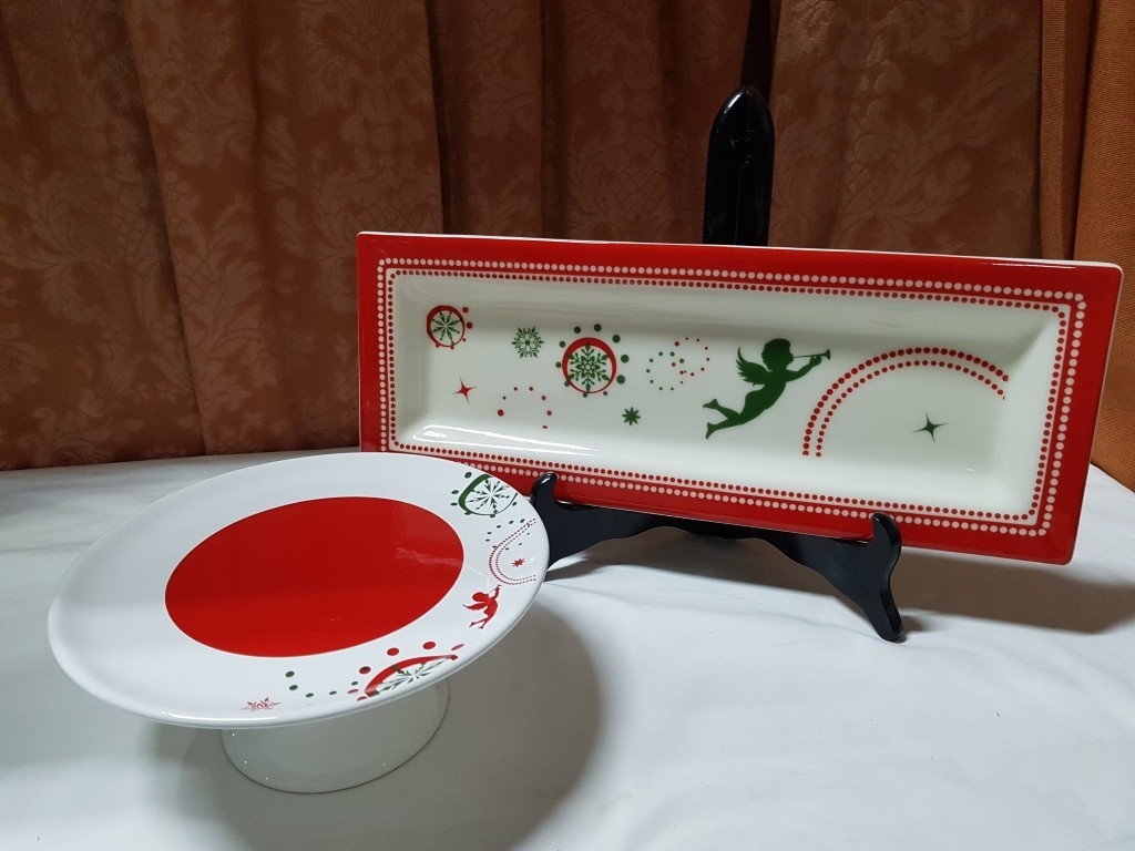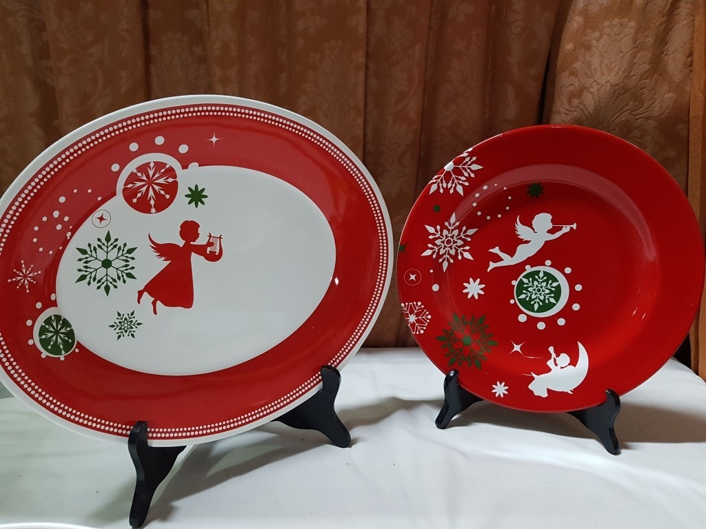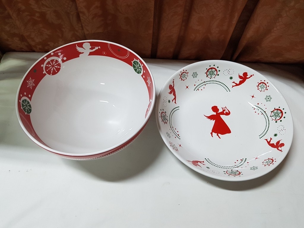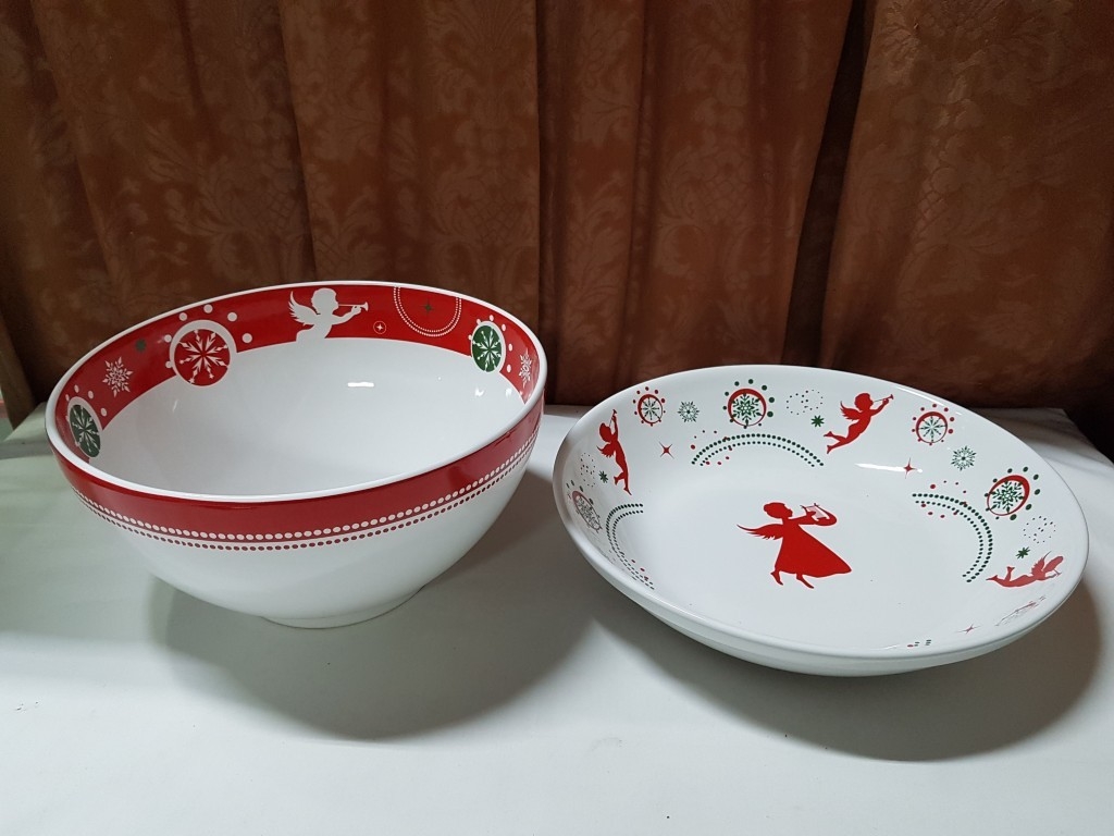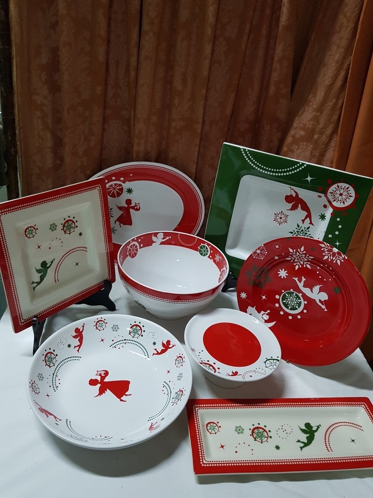 8x 'Christmas Angels' Pratos da Casa' Portuguese Over Sizes Christmas Design Ceramic Serving Dishes; 2x Bowls (Approx. Ø: 30cm H: 15m Ø: 32cm H: 7cm), Cake Stand (Approx. Ø: 21cm H: 9cm), Round Serving Plate (Approx. Ø: 31.5cm), Rectangular Serving Tray (Approx. 41.5cm x 15.5cm), 2x Square Dishes (Approx. 38cm x 38cm/ 28cm x 28cm) and Oval Dish (Approx. 40cm x32.5cm). (8)