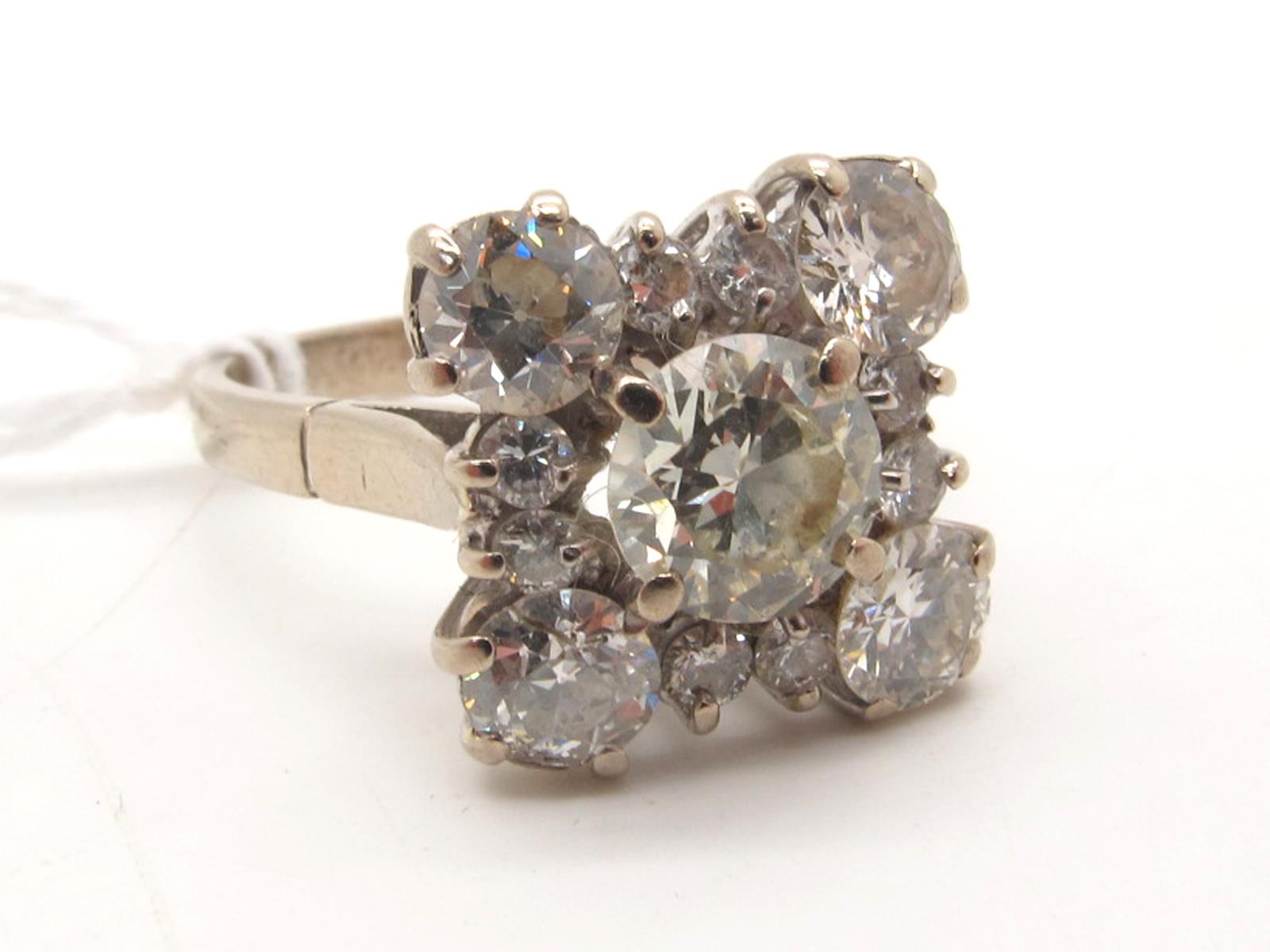 A Large Diamond Cluster Cocktail Ring, of square design, claw set throughout with brilliant cut diamonds, high between plain shoulders (finger size O1/2).