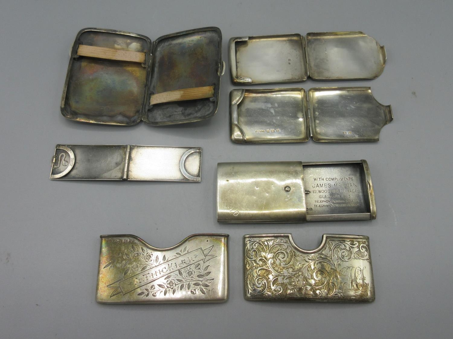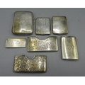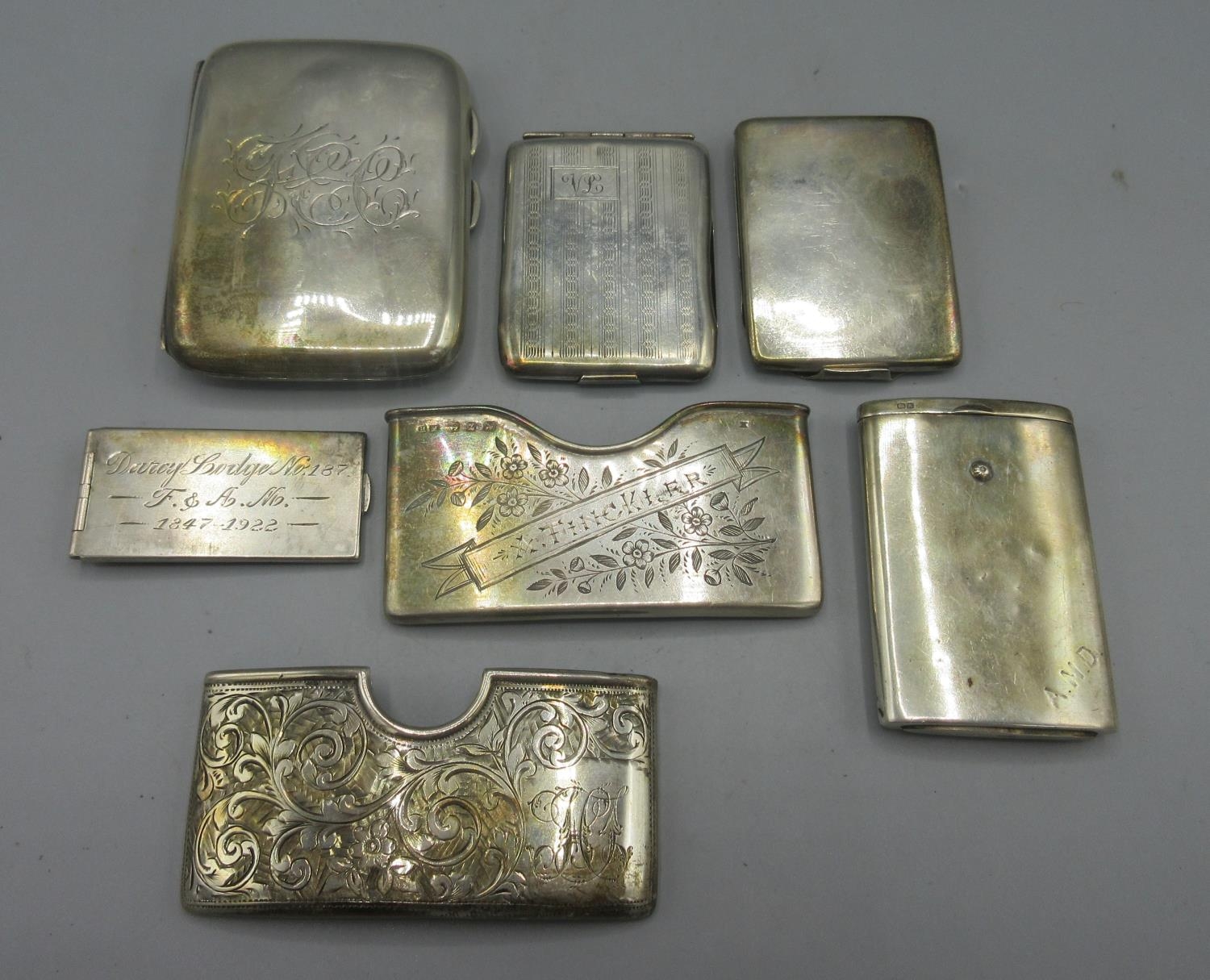 George V silver monogrammed cigarette case by Henry Clifford David, Birmingham 1919, two other silver cigarette cases, two decoratively engraved Victorian silver card cases, etc, 7.55ozt
