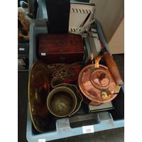 Two boxes of collectables to include New Hall biscuit barrel and small wall barometer, Cottage sculpture and dog figures etc
