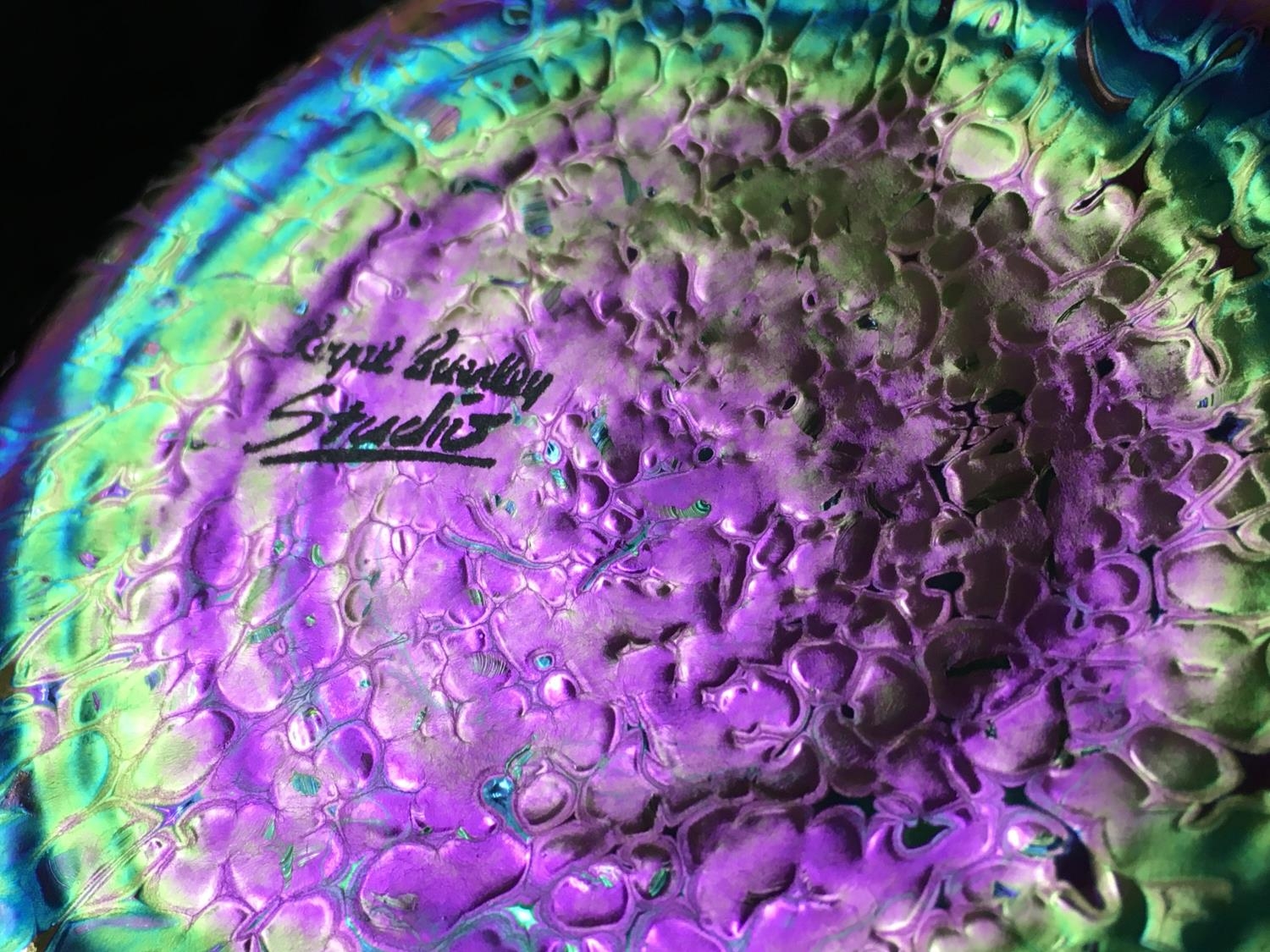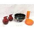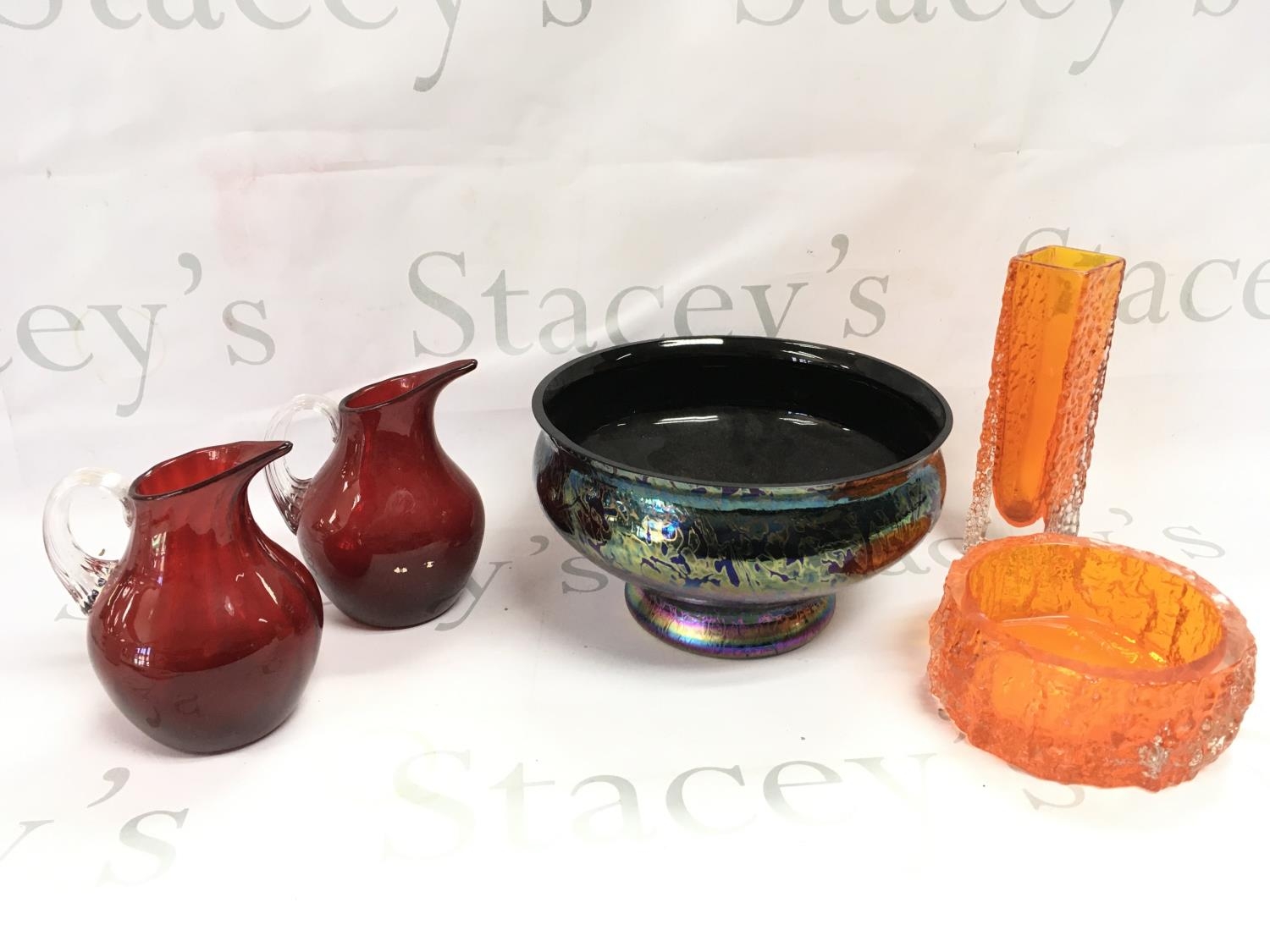 A collection of glassware including a Whitefriars bark vase and bowl , 20th century Royal Brierley iridescent studio glass bowl , a pair of small ruby glass pitchers