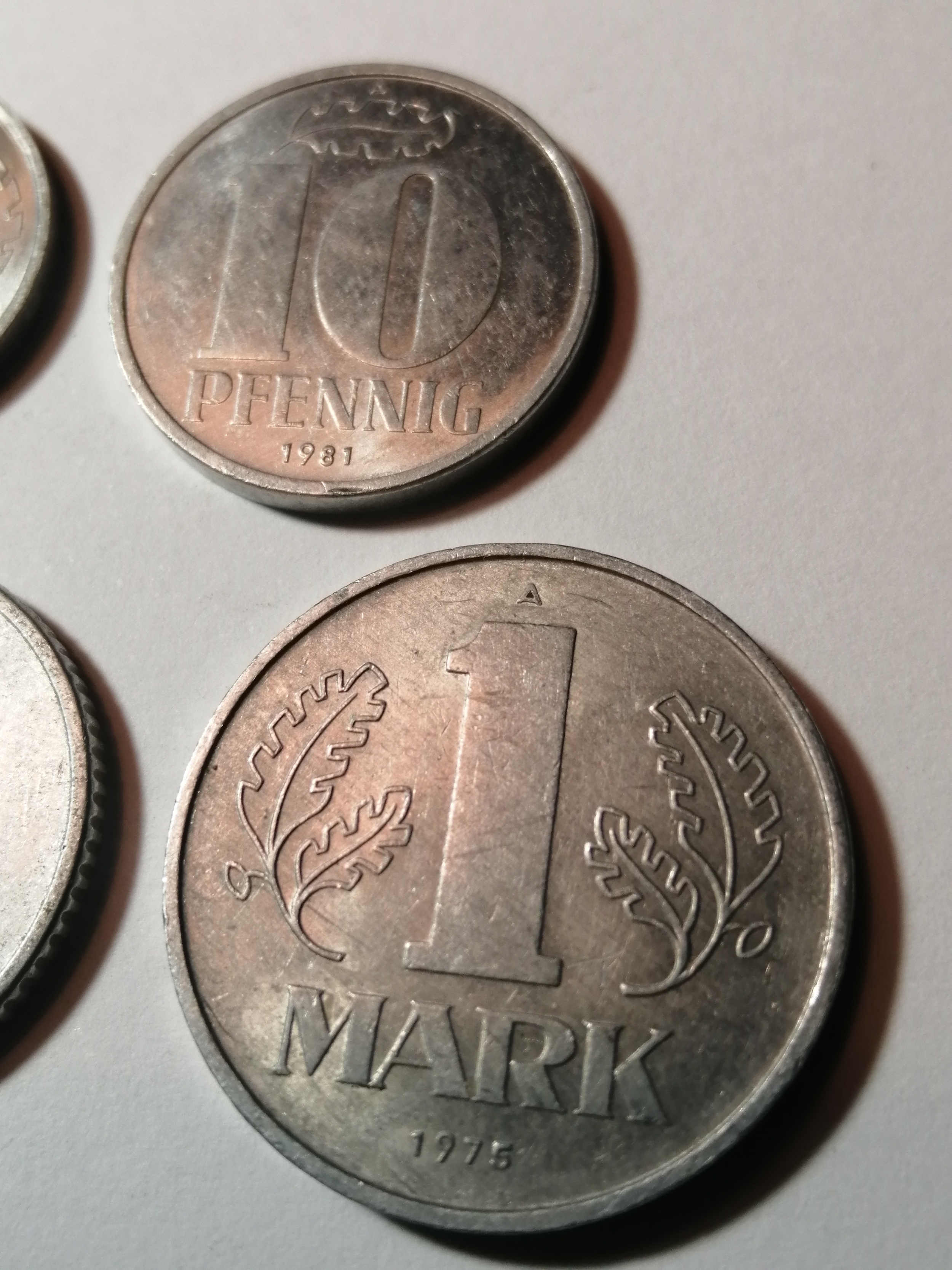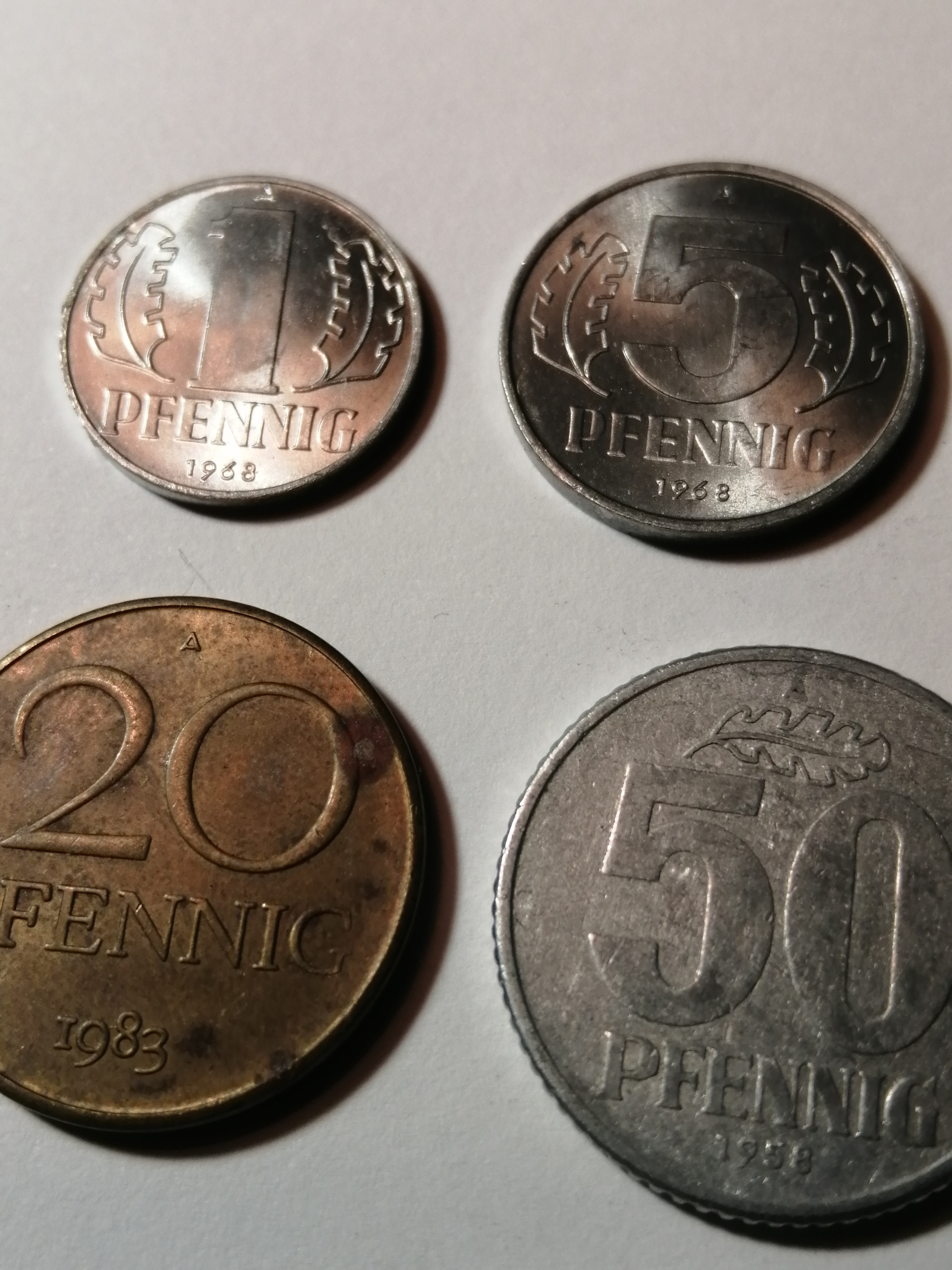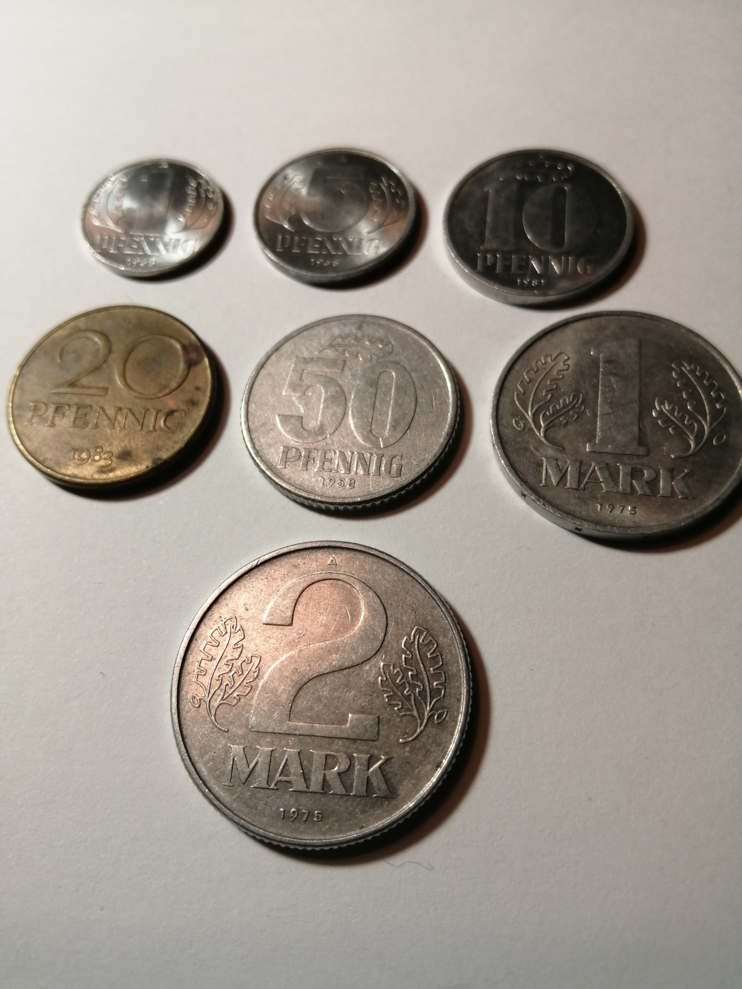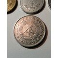 COINS : EAST GERMANY (7 coins) 1 pfennig 1968, 5 pfennig 1968, 10 pfennig 1981, 20 pfennig 1983, 50 pfennig 1958, 1 Mark 1975 and 2 Marks 1975 Most coins in very high grades