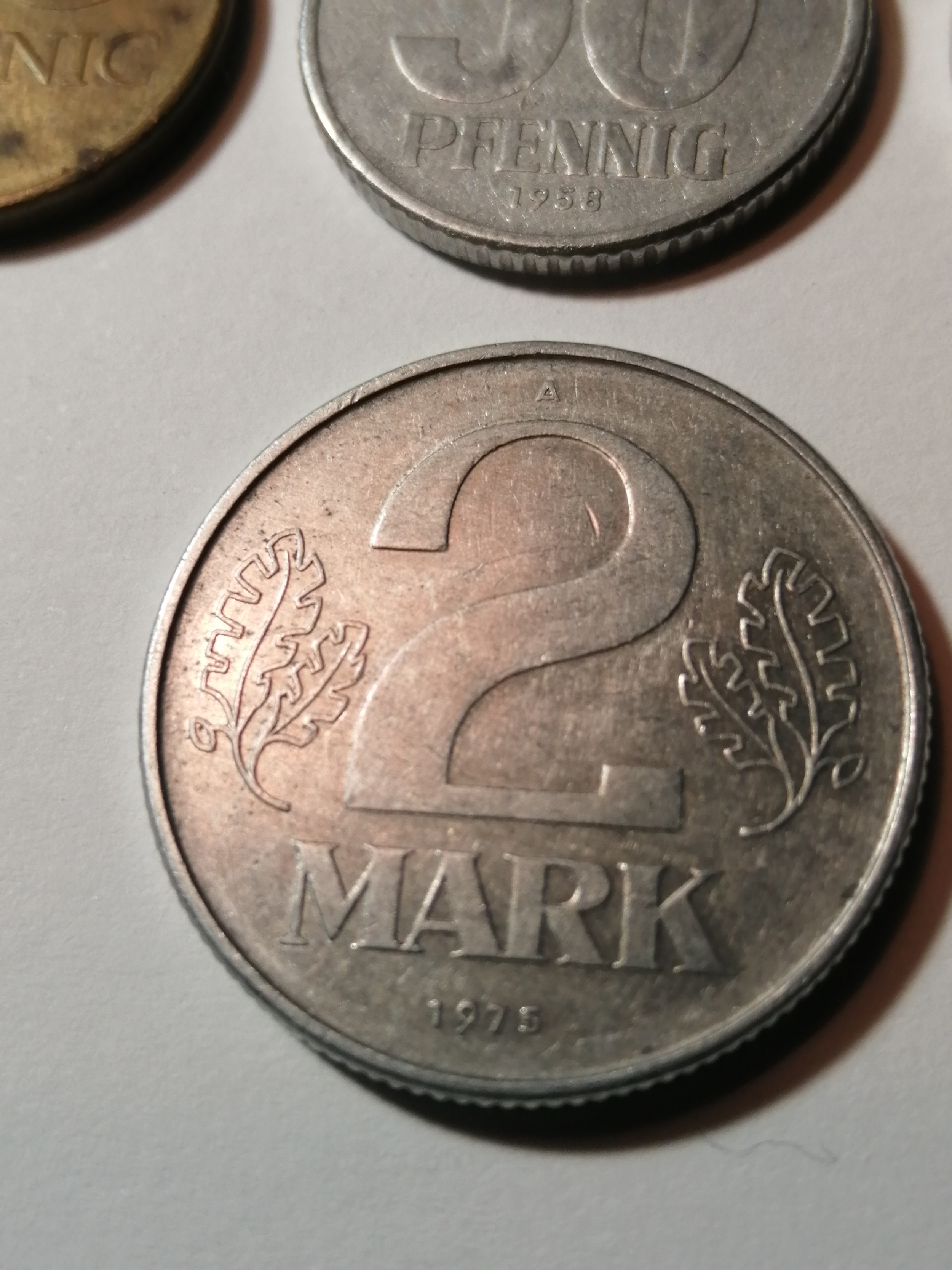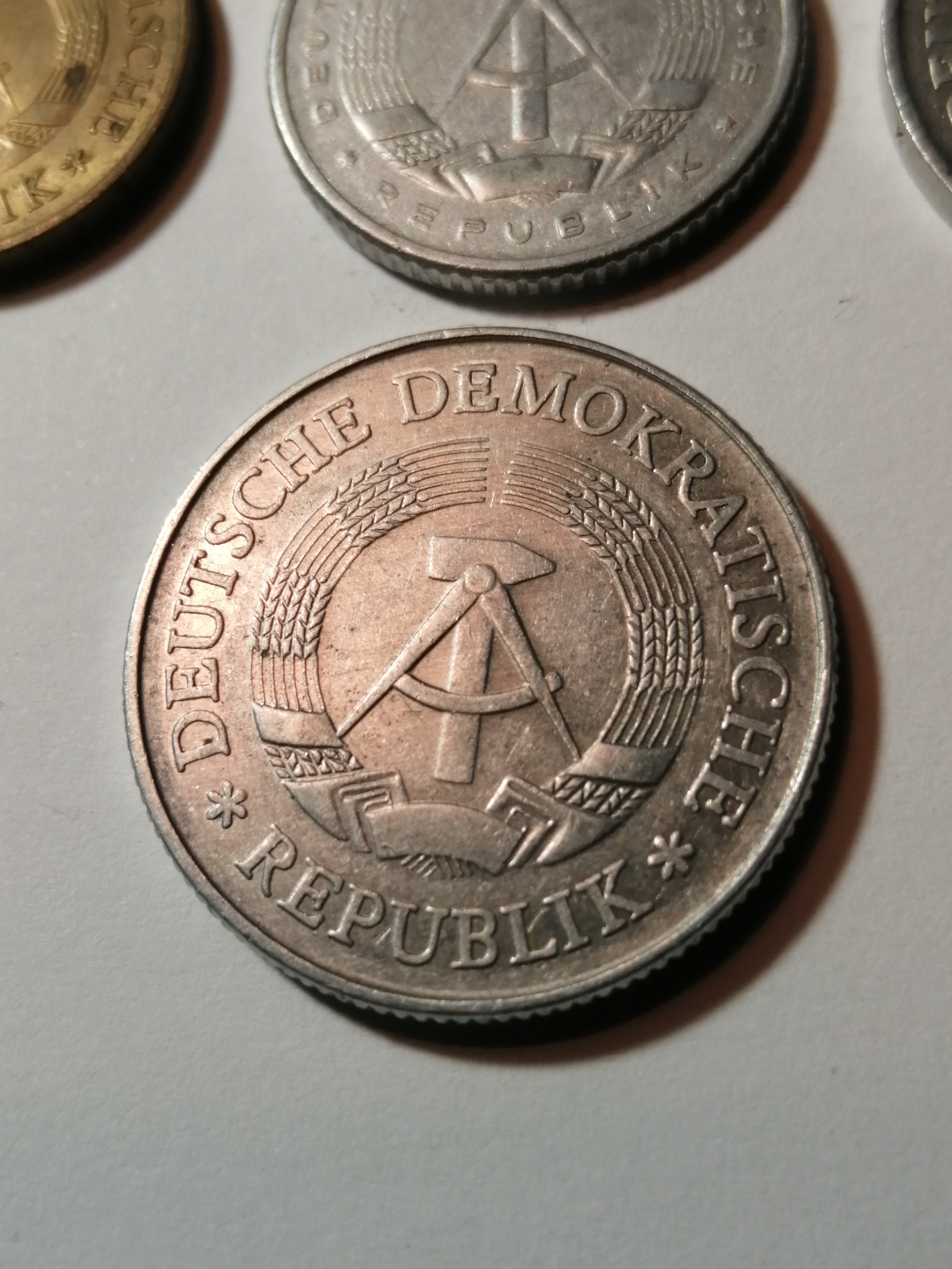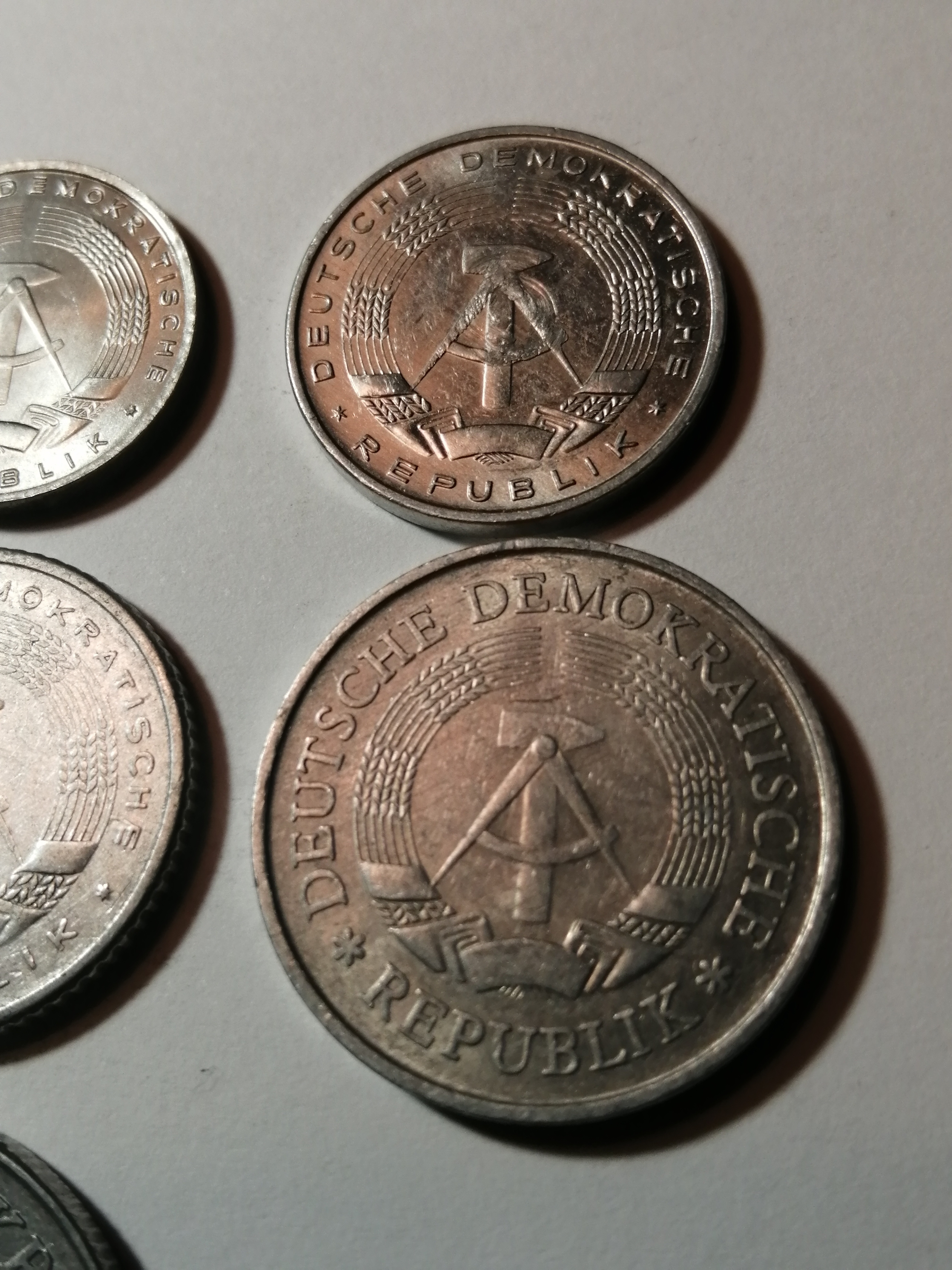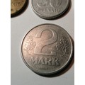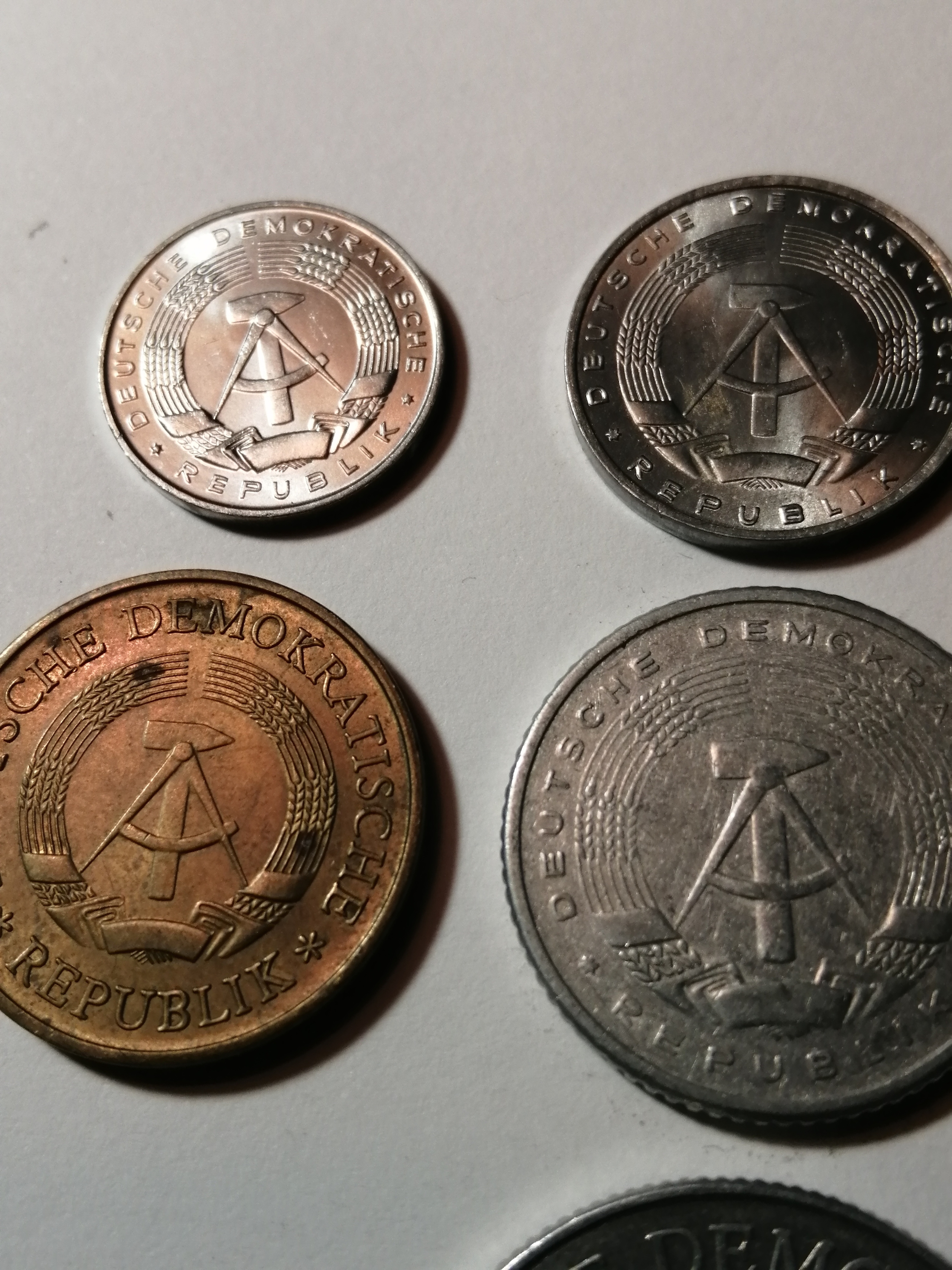 COINS : EAST GERMANY (7 coins) 1 pfennig 1968, 5 pfennig 1968, 10 pfennig 1981, 20 pfennig 1983, 50 pfennig 1958, 1 Mark 1975 and 2 Marks 1975 Most coins in very high grades