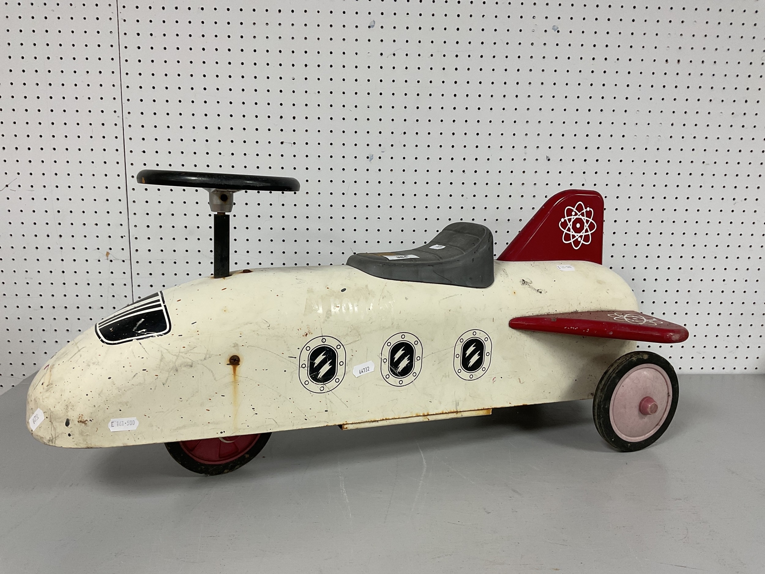 A Modern Pressed Steel Children's Ride On Tri-Cycle in the form of a Space Shuttle, playworn, signs of wear and corrosion.