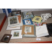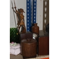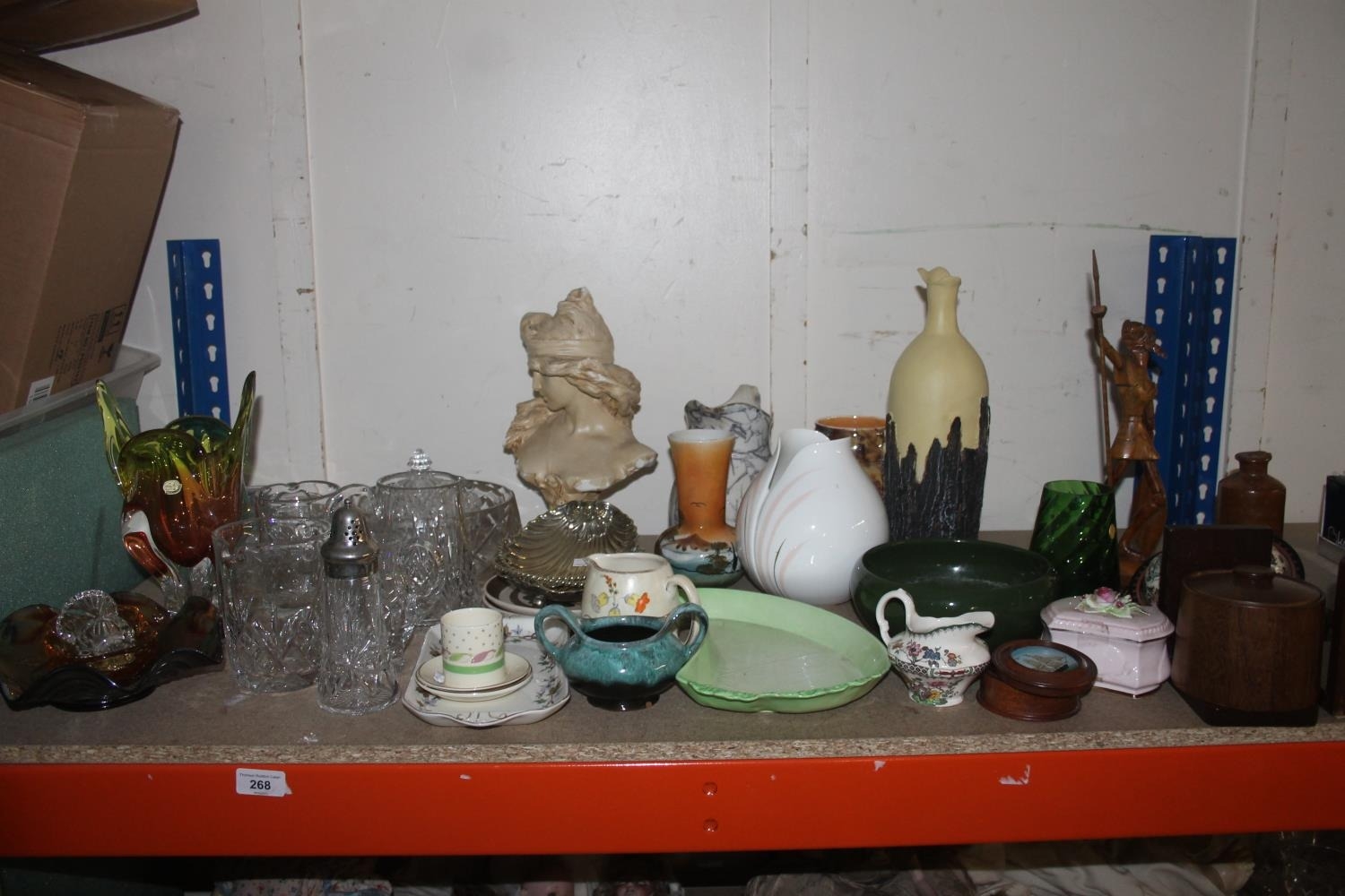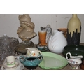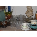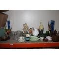 Shelf containing decorative ceramics, globe bookends, glassware, etc.