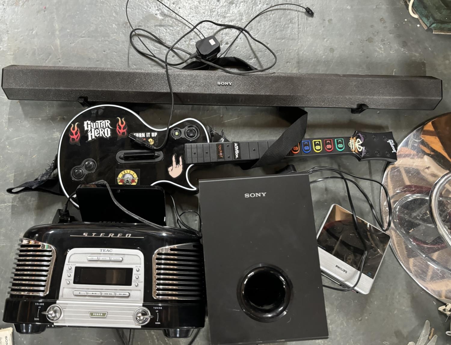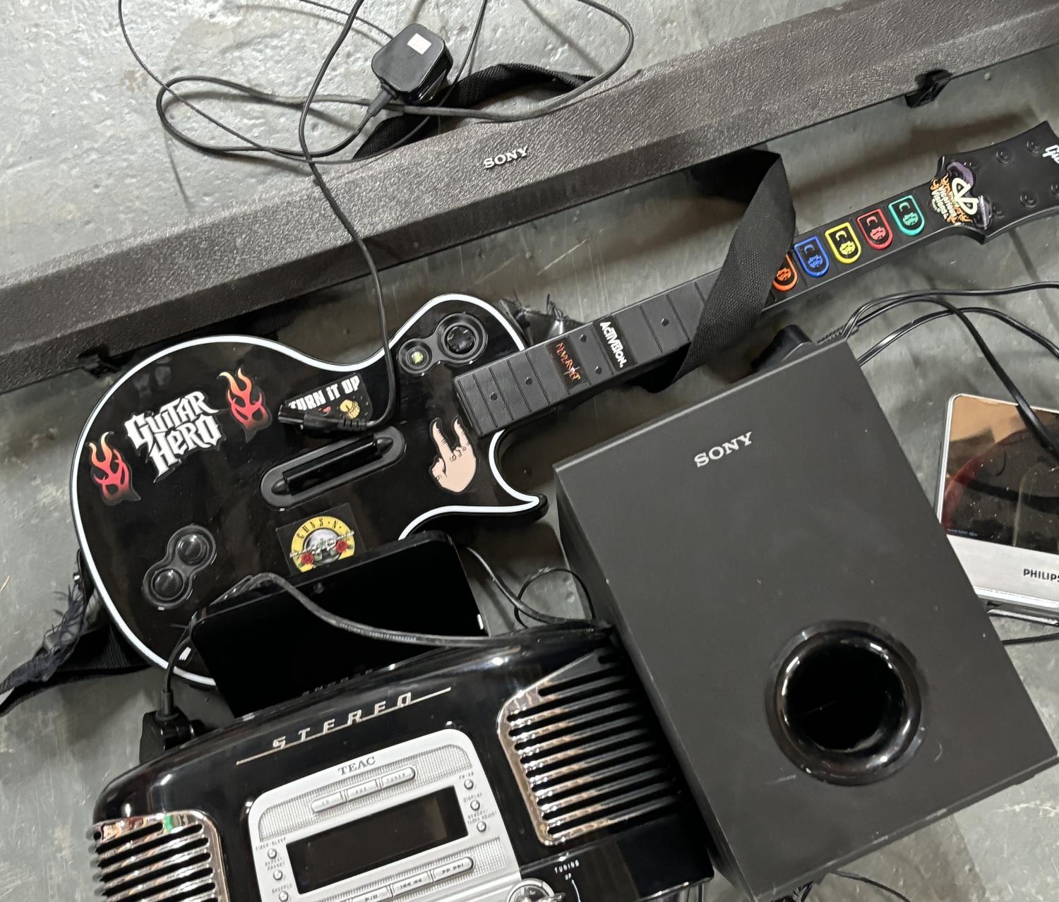 Sony soundbar with Sony sub and a guitar hero guitar with others