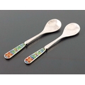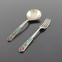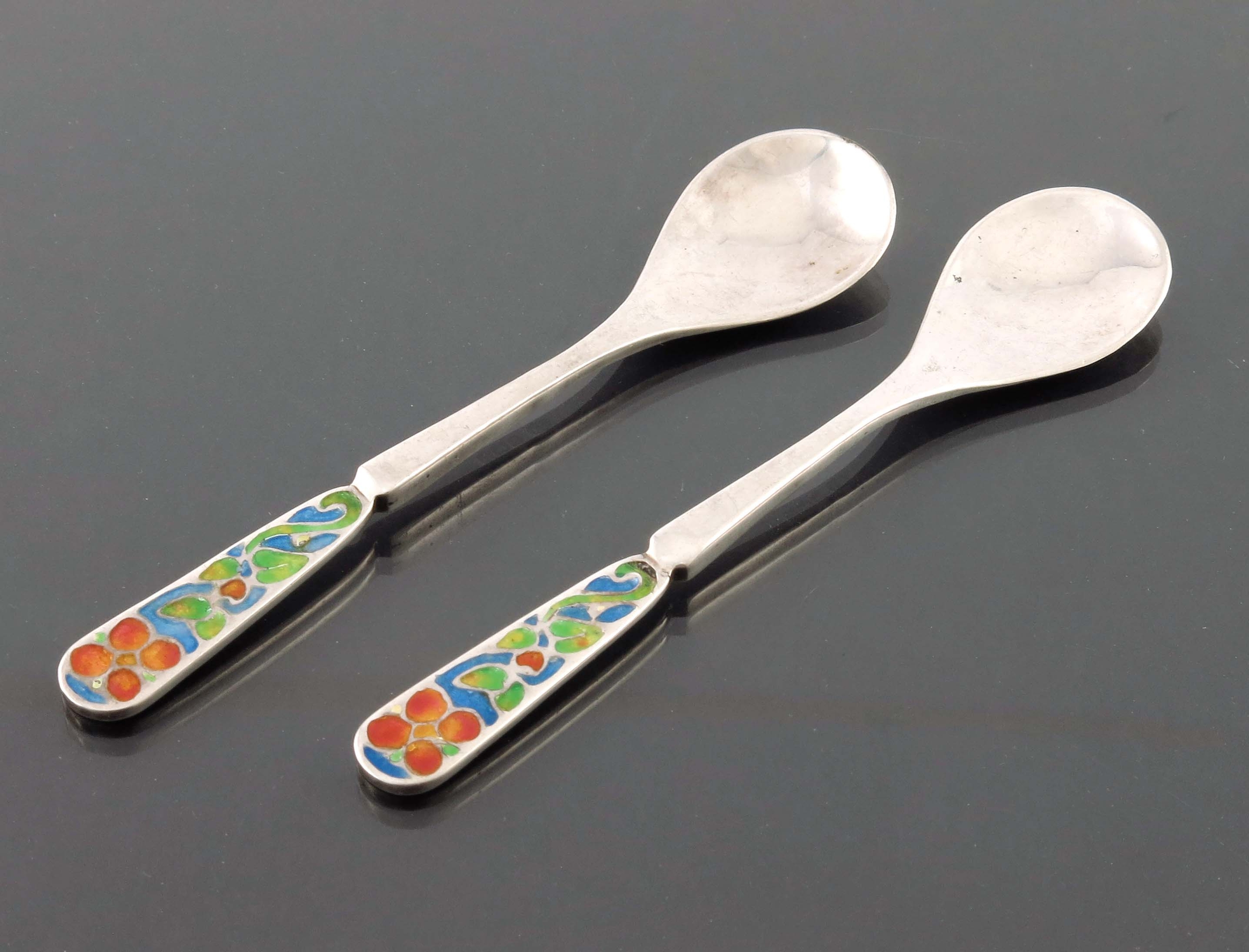 Bernard Instone, a pair of Arts and Crafts silver and enamelled coffee spoons, Birmingham 1927, the champleve enamel terminals decorated with stylised knotted flowers, in green, red and blue, planished bowls, 9cm long, 0.57ozt (2)