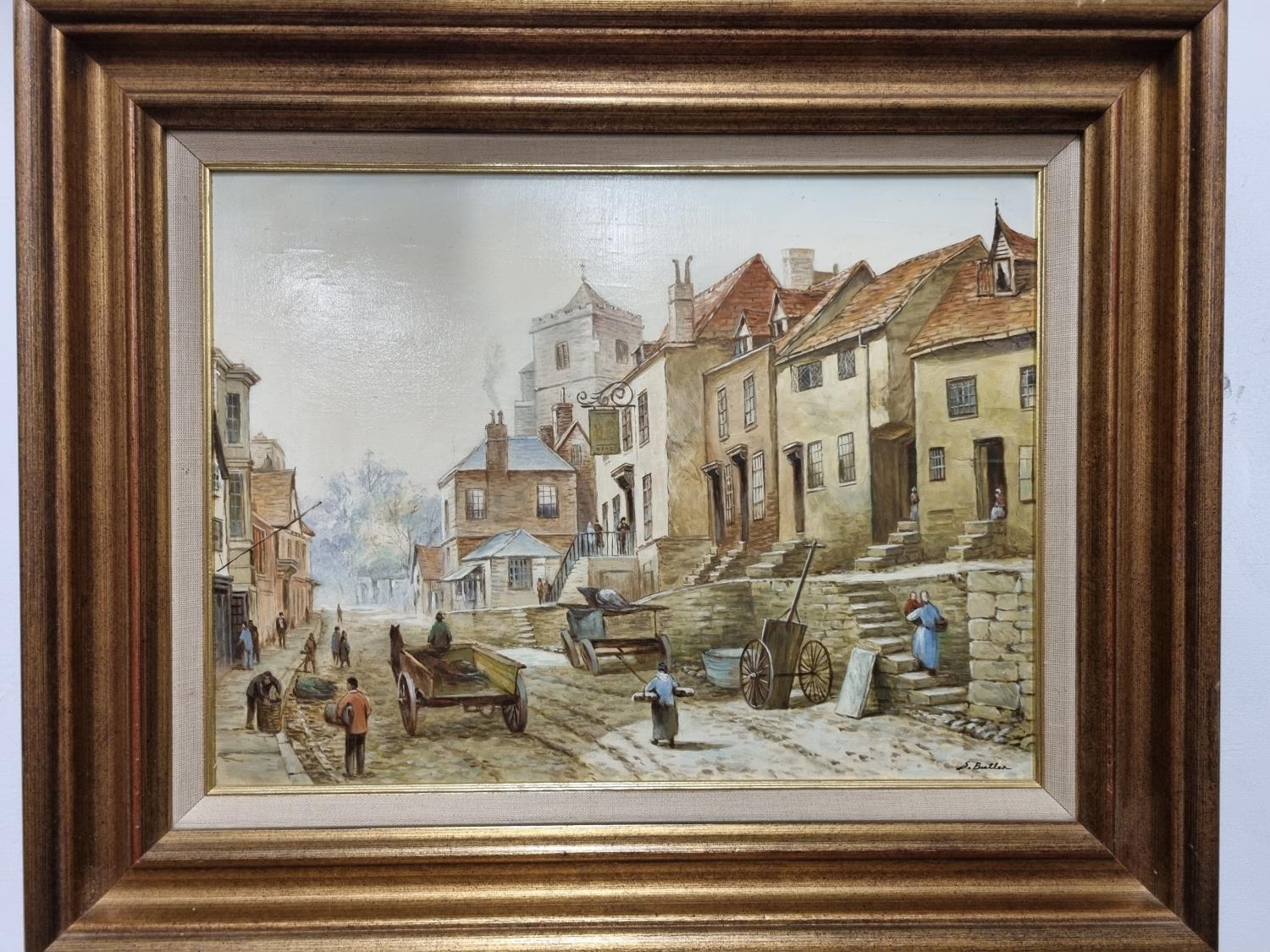 S Butler. A 20th Century Oil on Panel of a street scene in a good gilt frame. 30 x 40 cm approx.