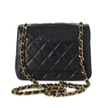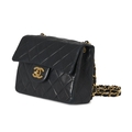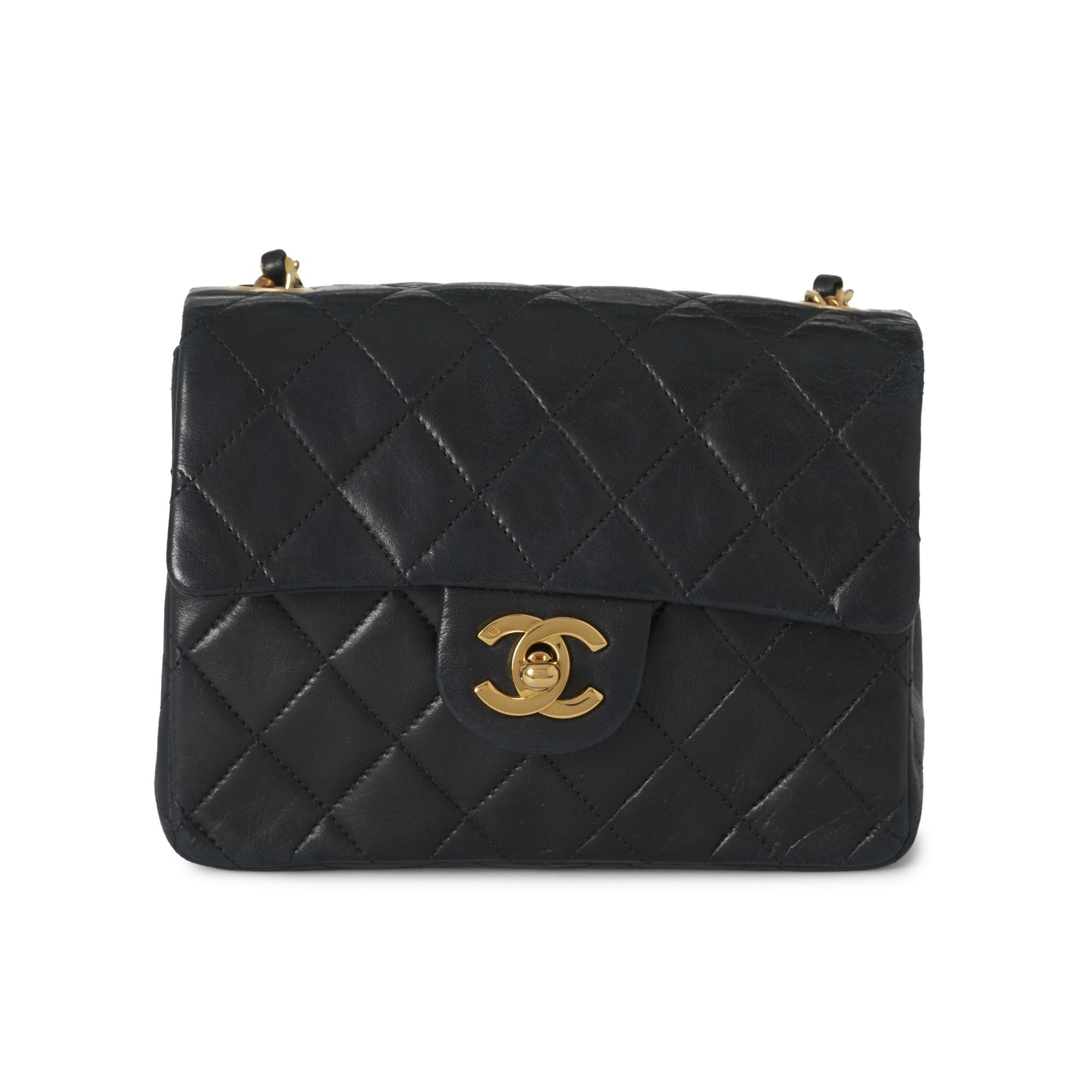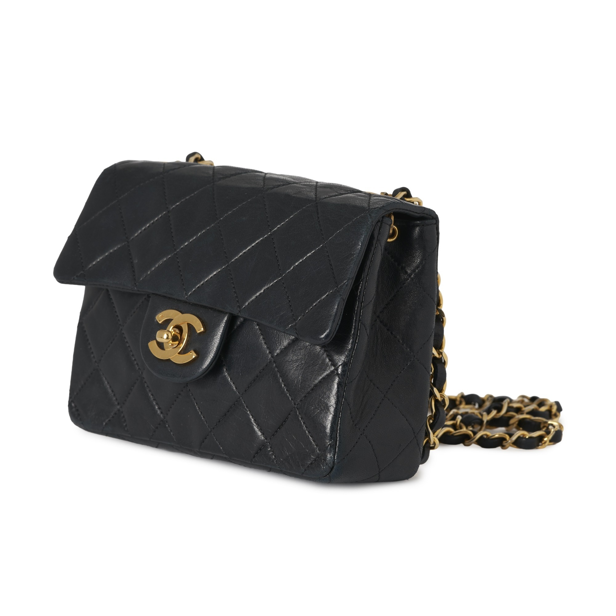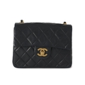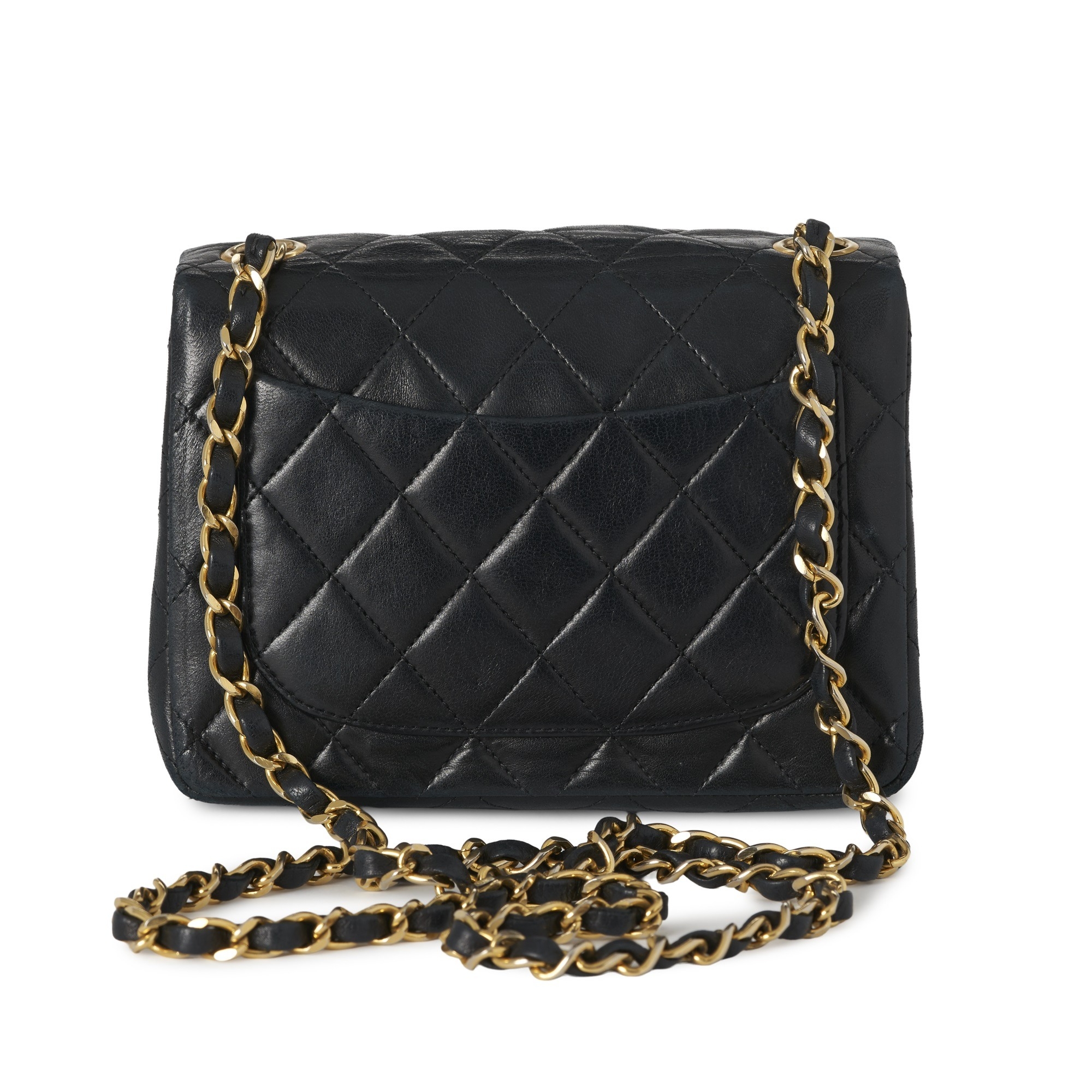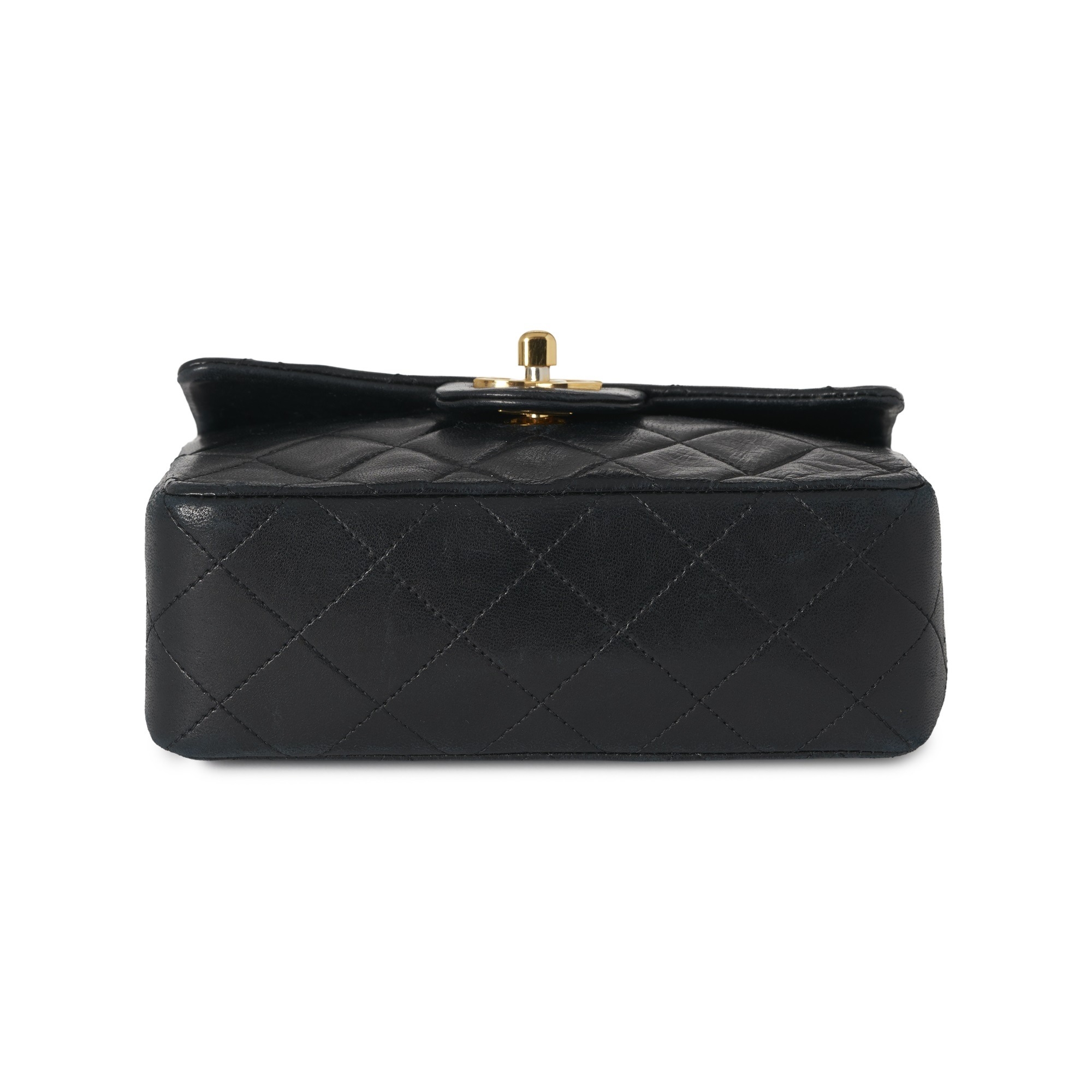 Chanel, a vintage Mini Square Classic Flap handbag, crafted from black lambskin leather, with diamond quilted detailing, 24k gold-plated hardware, chain and interwoven leather crossbody strap, rear patch pocket, CC turn-lock fastening and a burgundy leather-lined interior, measuring 6.5 by 12 by 17cm, with maker's dust bag and authenticity card