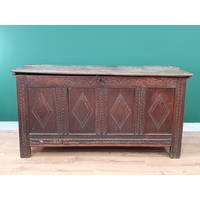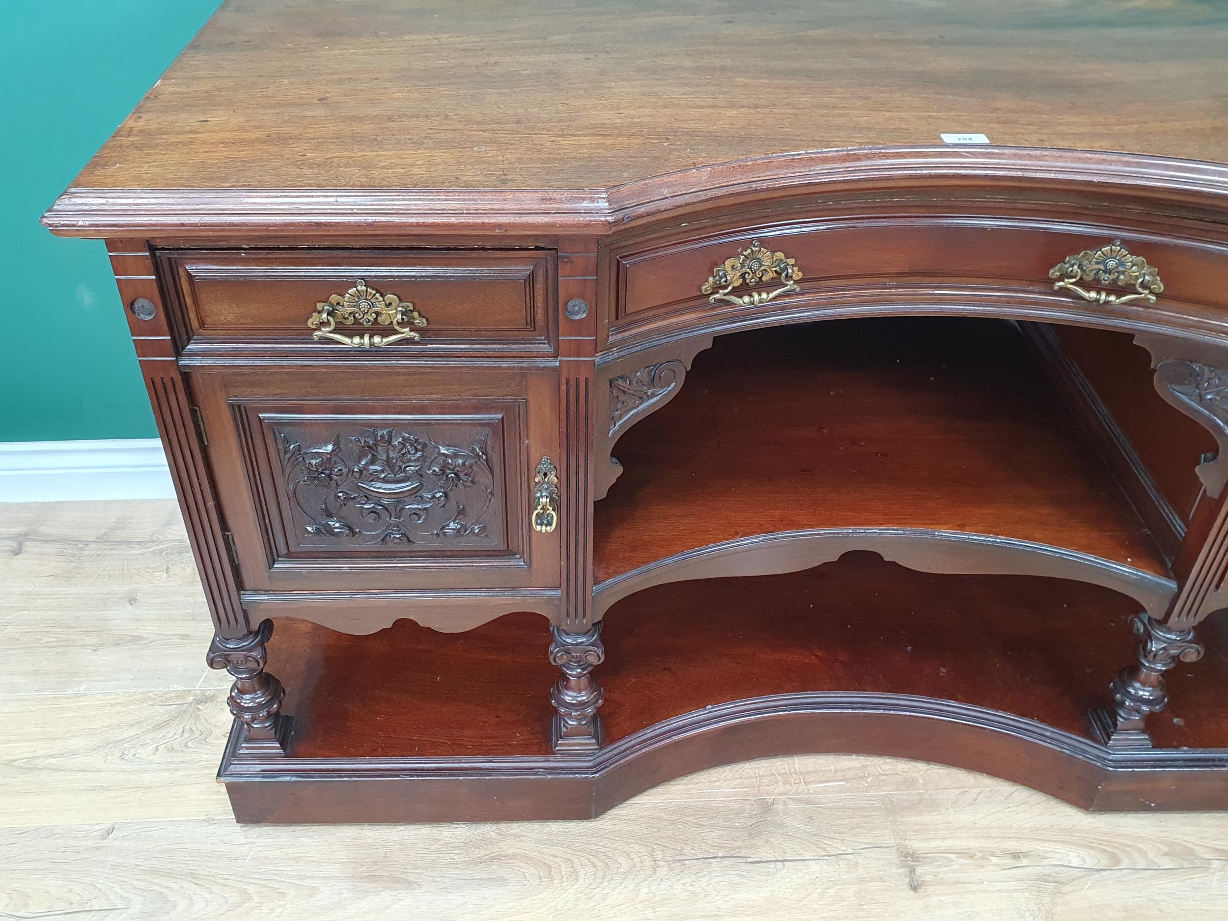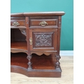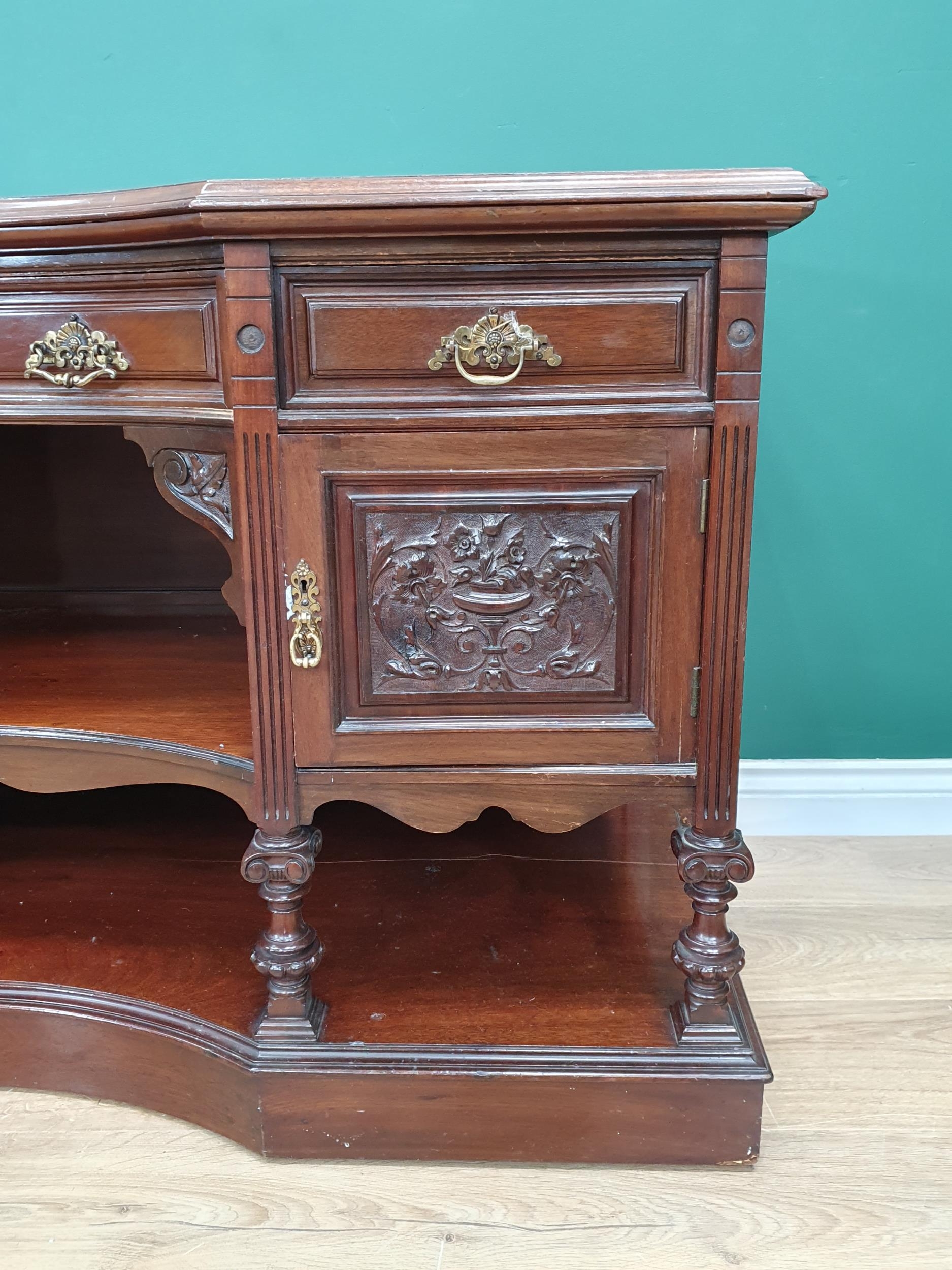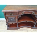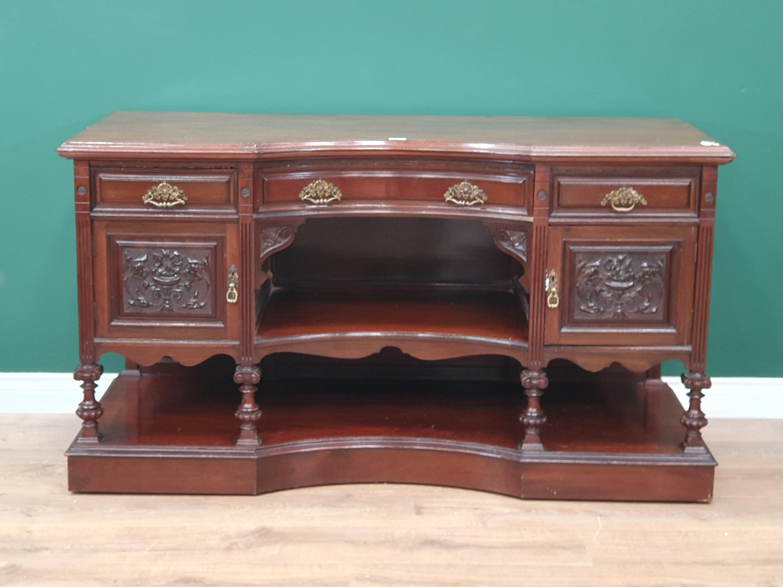 A mahogany Sideboard fitted three drawers above open shelves and pair of leafage carved panel doors, on turned supports and plinth base, (Missing Rack), 2ft 6"High x 4ft 7"Wide.