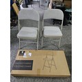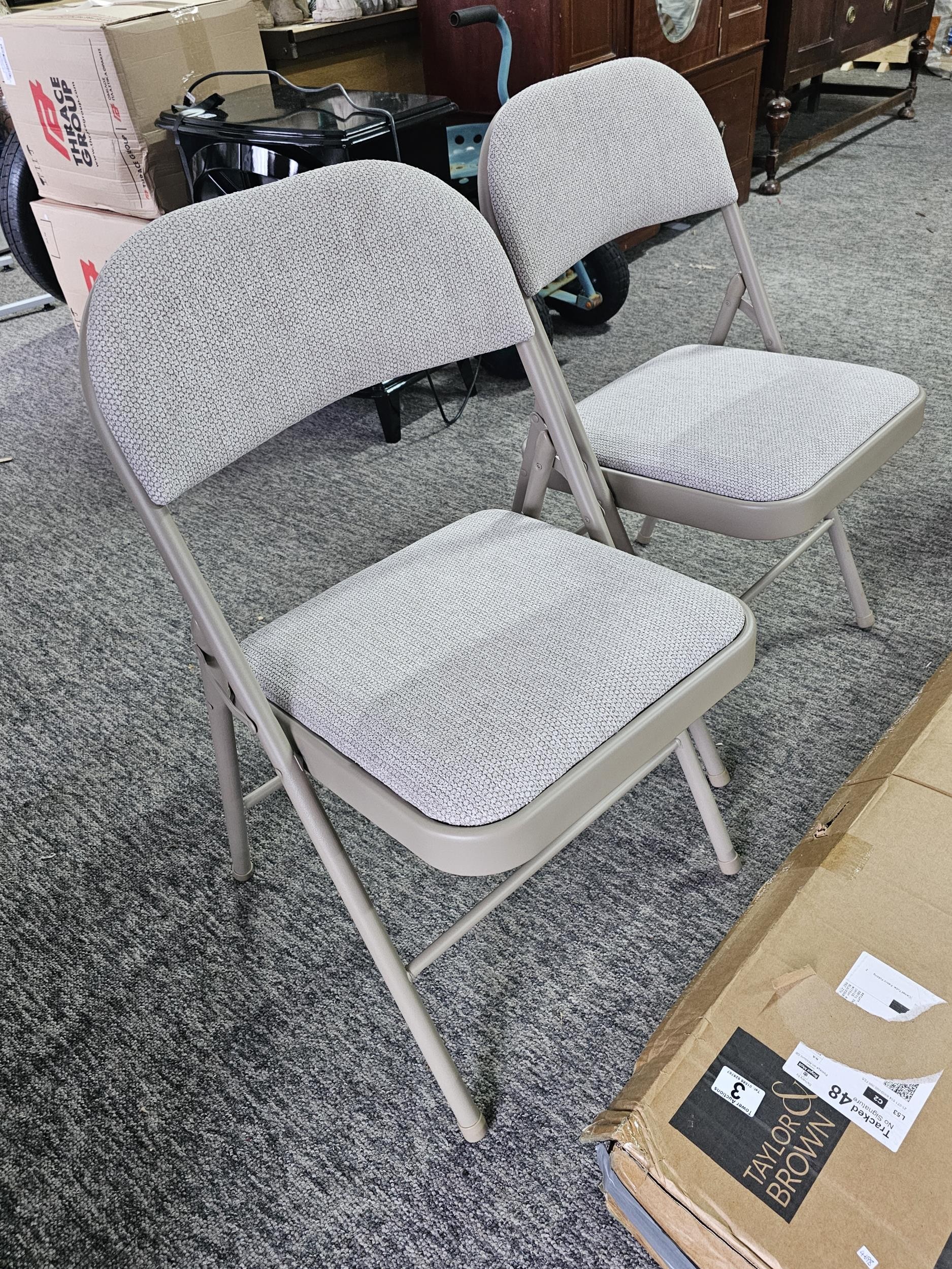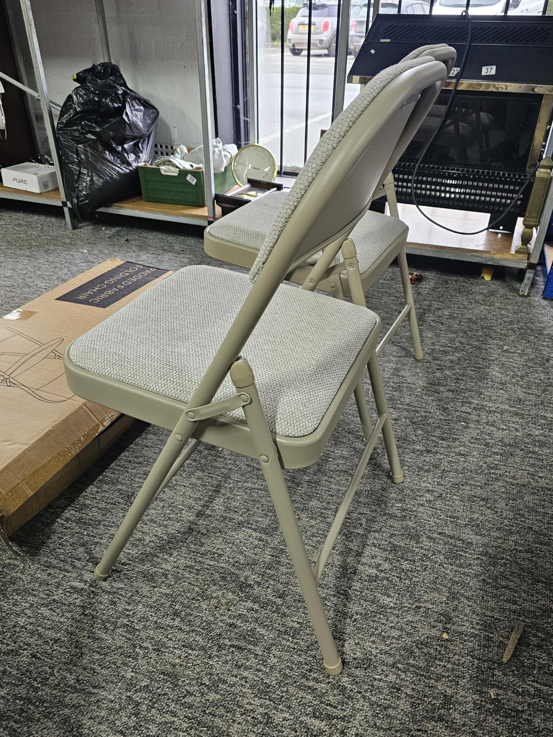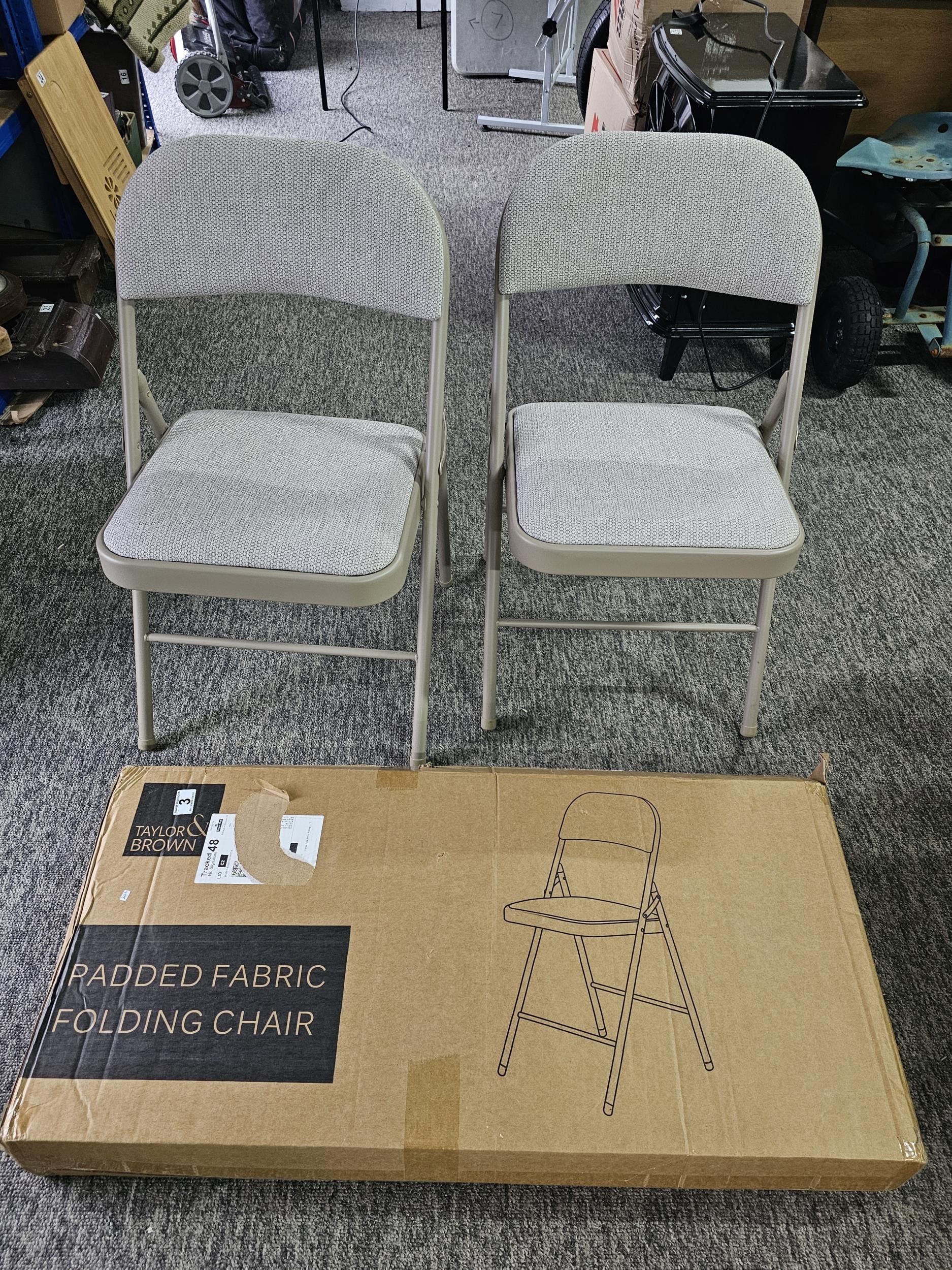 A boxed as new Tailor & Brown padded fabric folding chairs in a beige colour, the box has been opened for photographic purposes only.