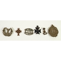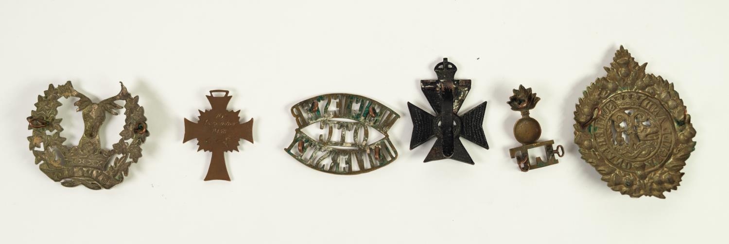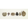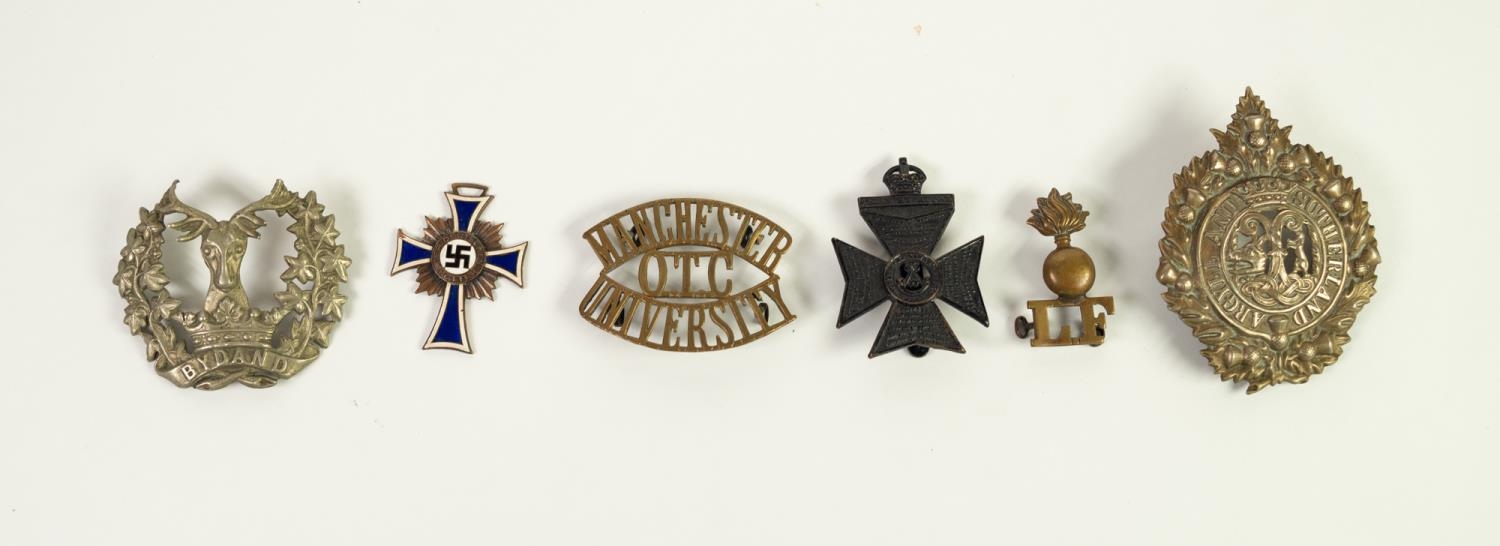 GERMAN THIRD REICH 'MOTHERS CROSS' gilt metal and enamel with inscription and date 16 December 1938 to reverse together with a Kings Royal Rifle Corps and THREE OTHER BADGES including a large Argyle & Sutherland example, together with Manchester University O.T.C. (Officer Training Corps) badge, (6)