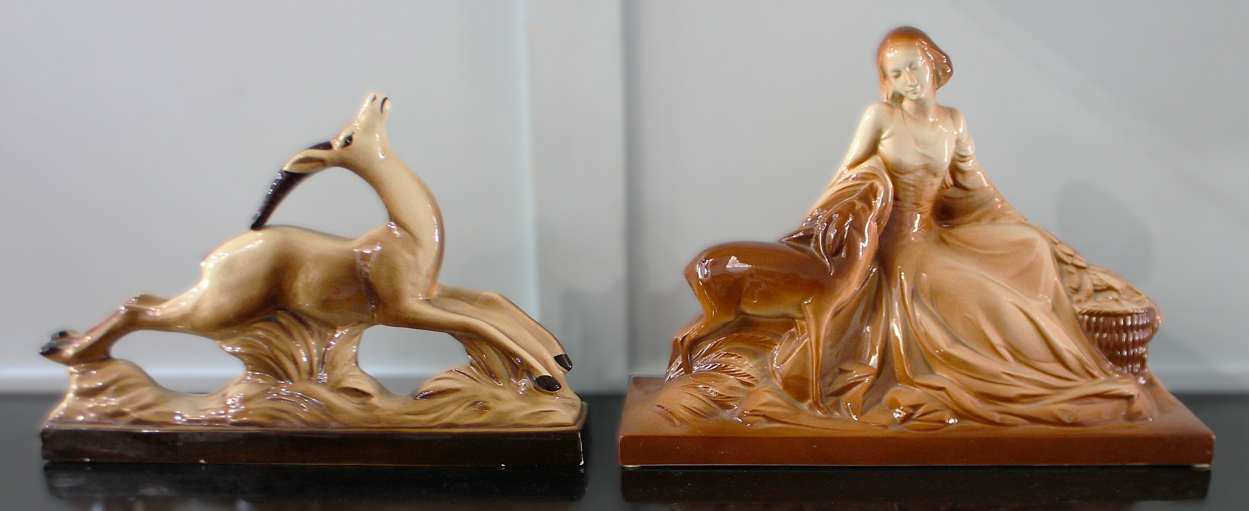 Two Art Deco ceramic figures, probably French, modelled as a leaping Gazelle on naturalistic base, 51cm wide by 33cm high, and a young maiden seated beside a fawn and a basket, on plinth base, 54cm wide by 39cm high, (2).