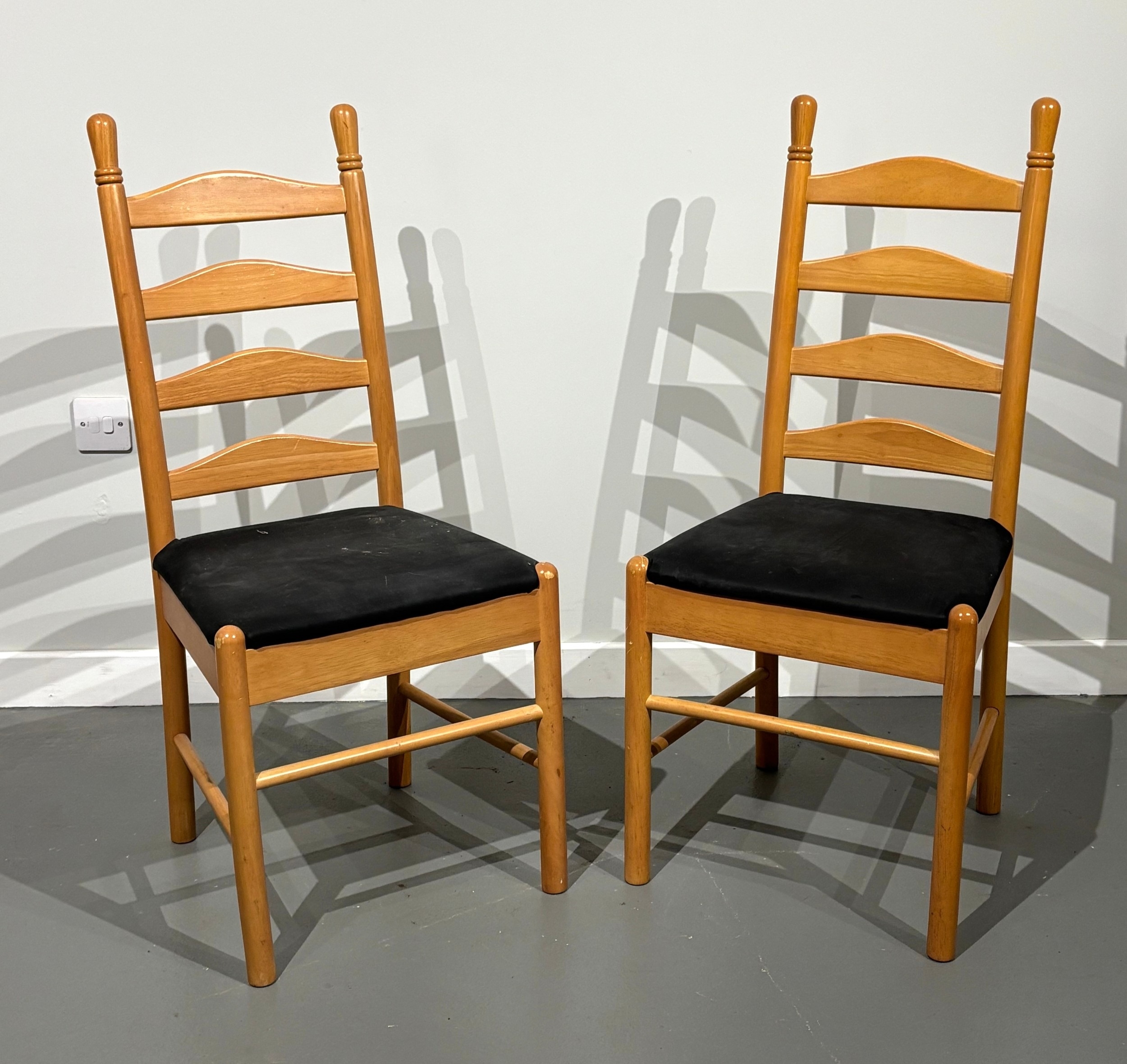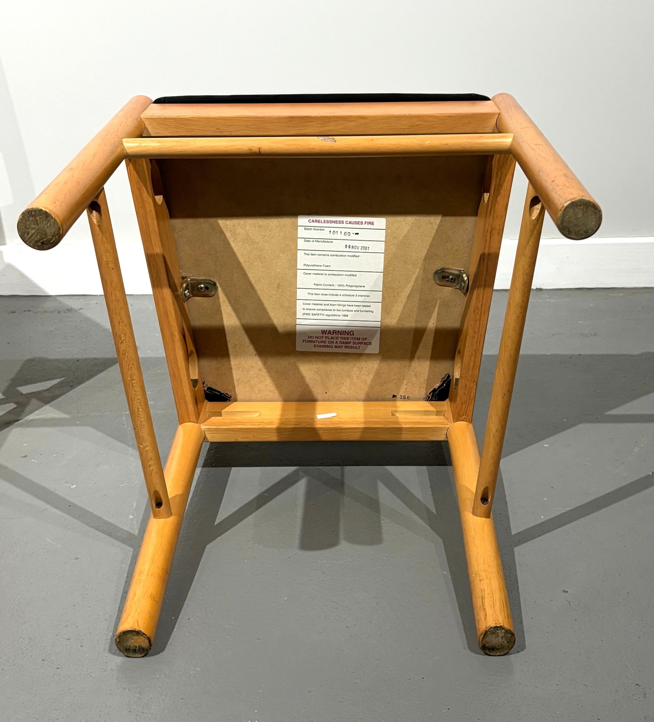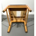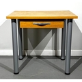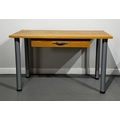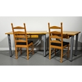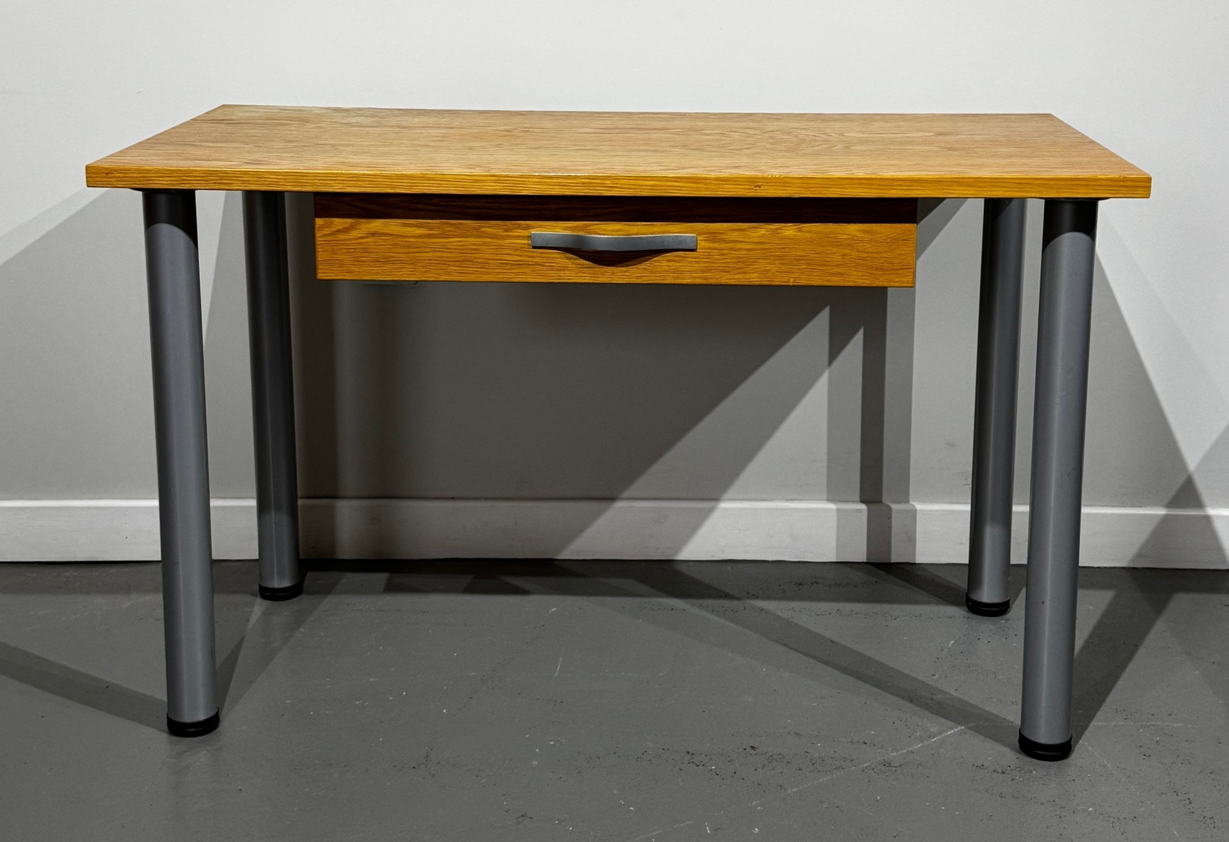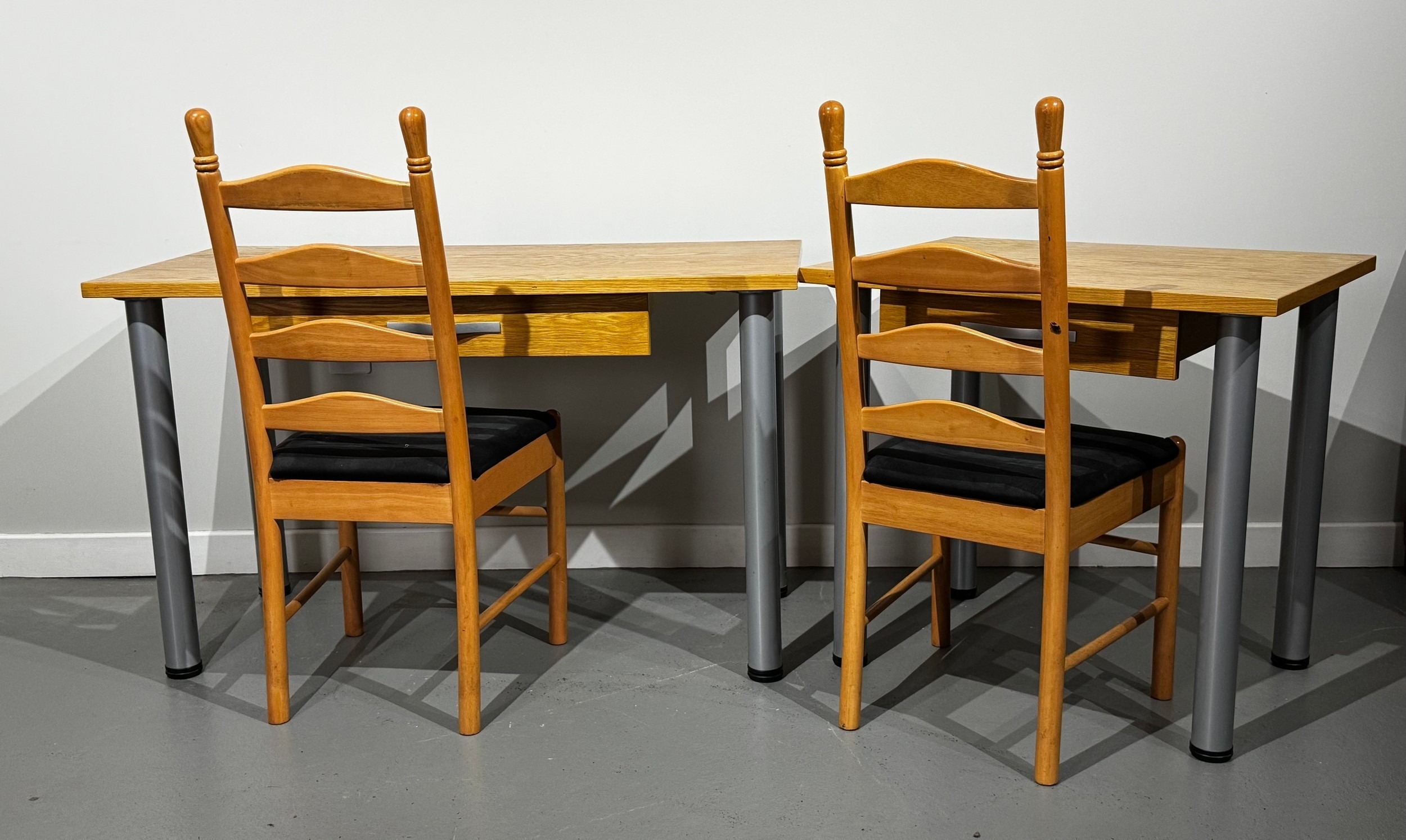 Two modern writing tables and chairs. Long desk measures; 74cm high, 120cm width, 58cm depth; short desk; 74cm high, 78cm width, 58cm depth.
