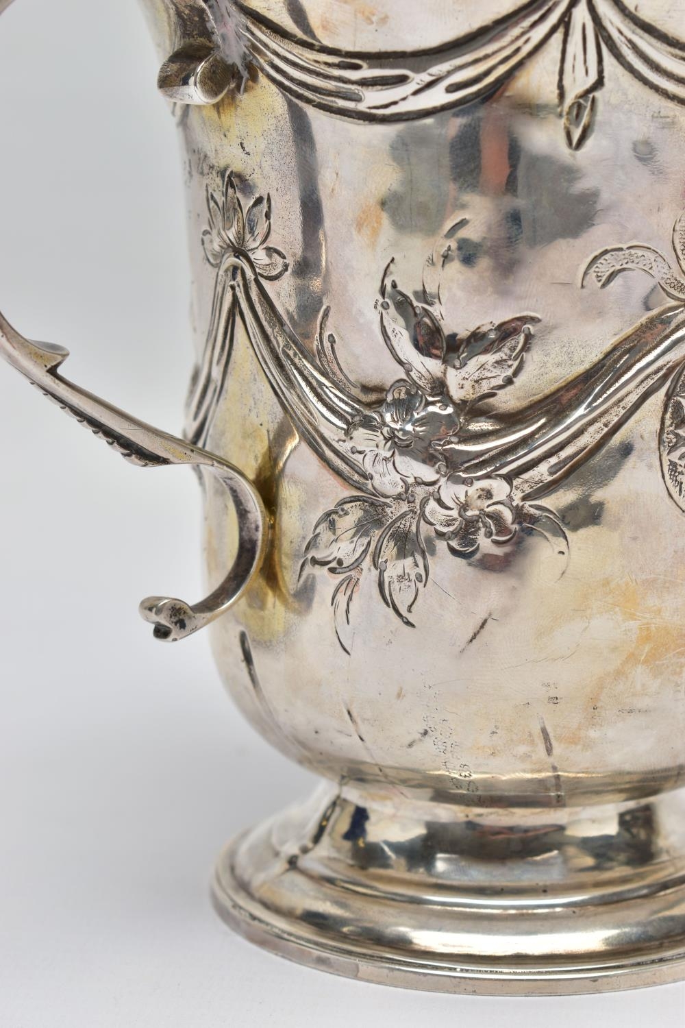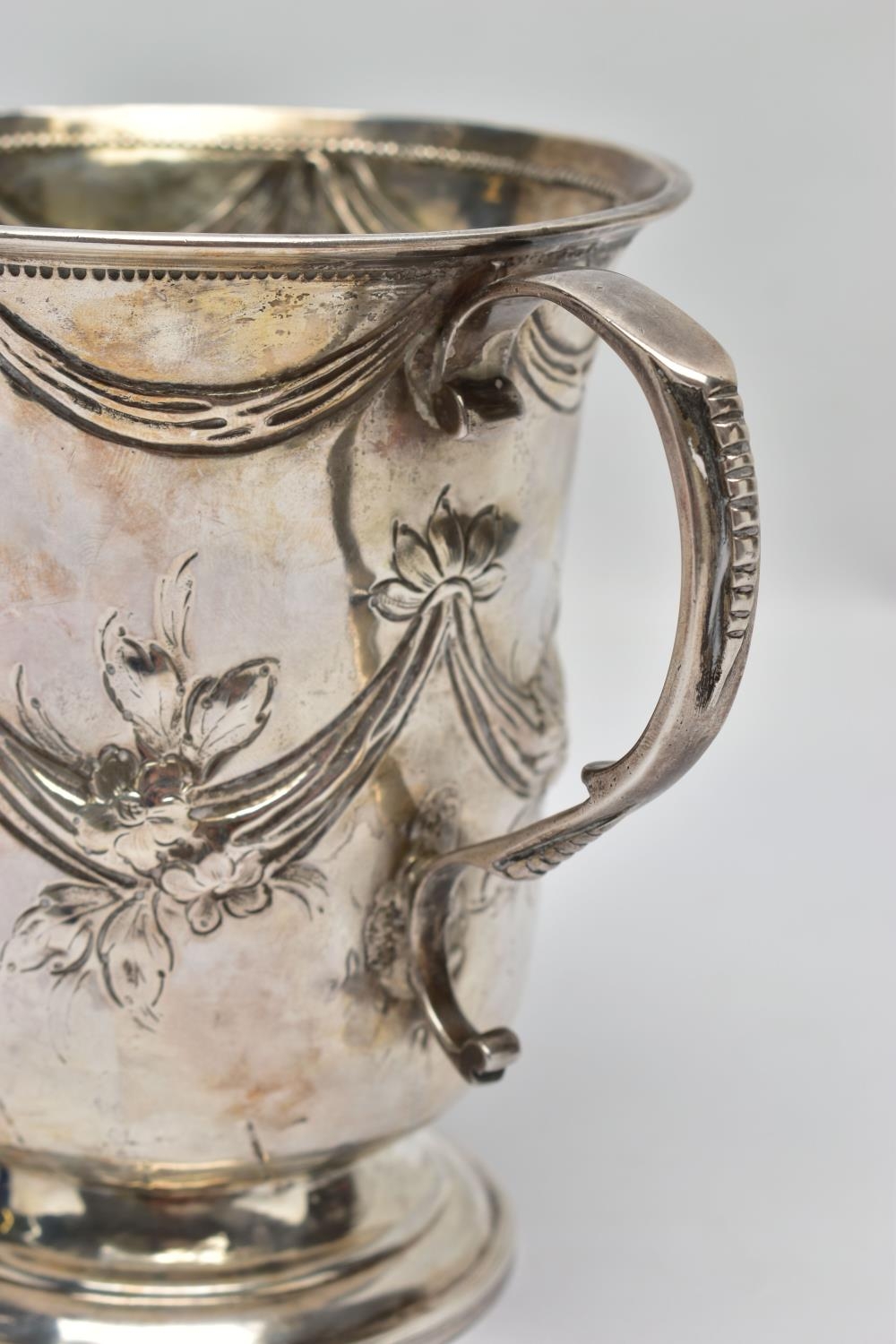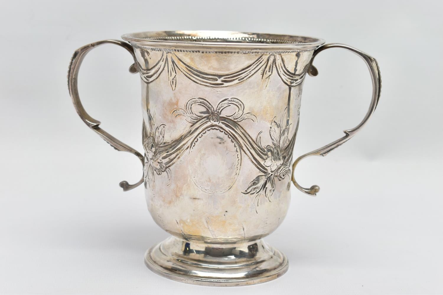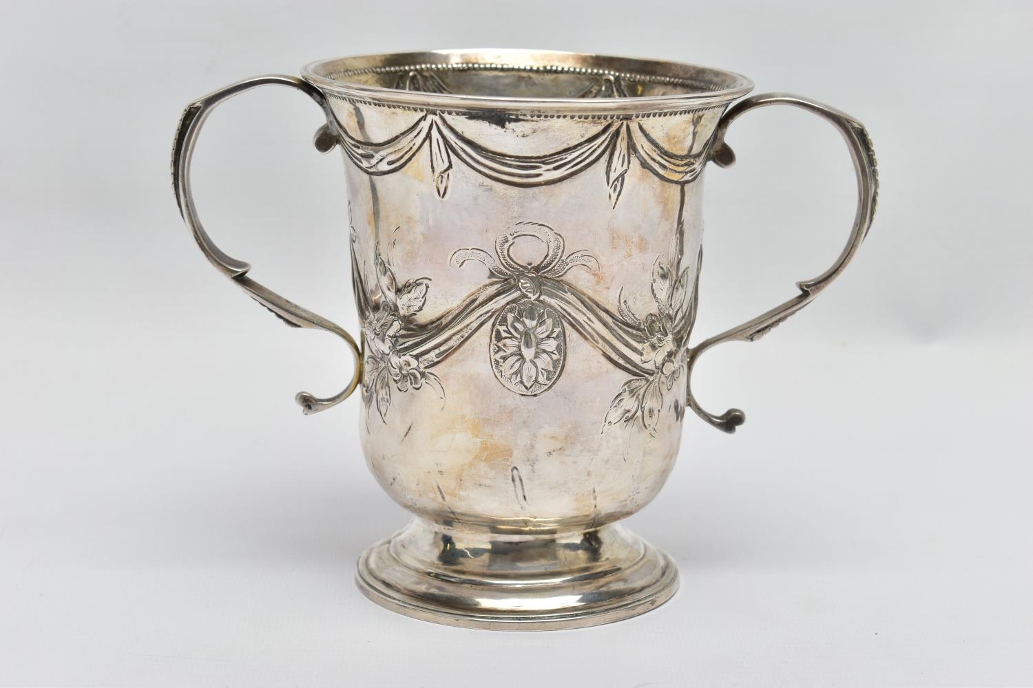 A GEORGE III SILVER LOVING CUP, bell shape body with embossed and chased floral and swag design with vacant oval cartouche (possibly erased), fitted with double scroll handles, raised on a slightly stepped round base, approximate height 140mm, indistinct makers mark for London 1786, approximate gross weight 9.29 ozt, 289.2 grams (condition report: heavily dented all round, visible heavy solder marks to the base, underneath of the base and handles, repairs and damage, discolouration and tarnishing to the interior, wear to some of the detailing, condition poor/fair)