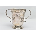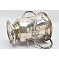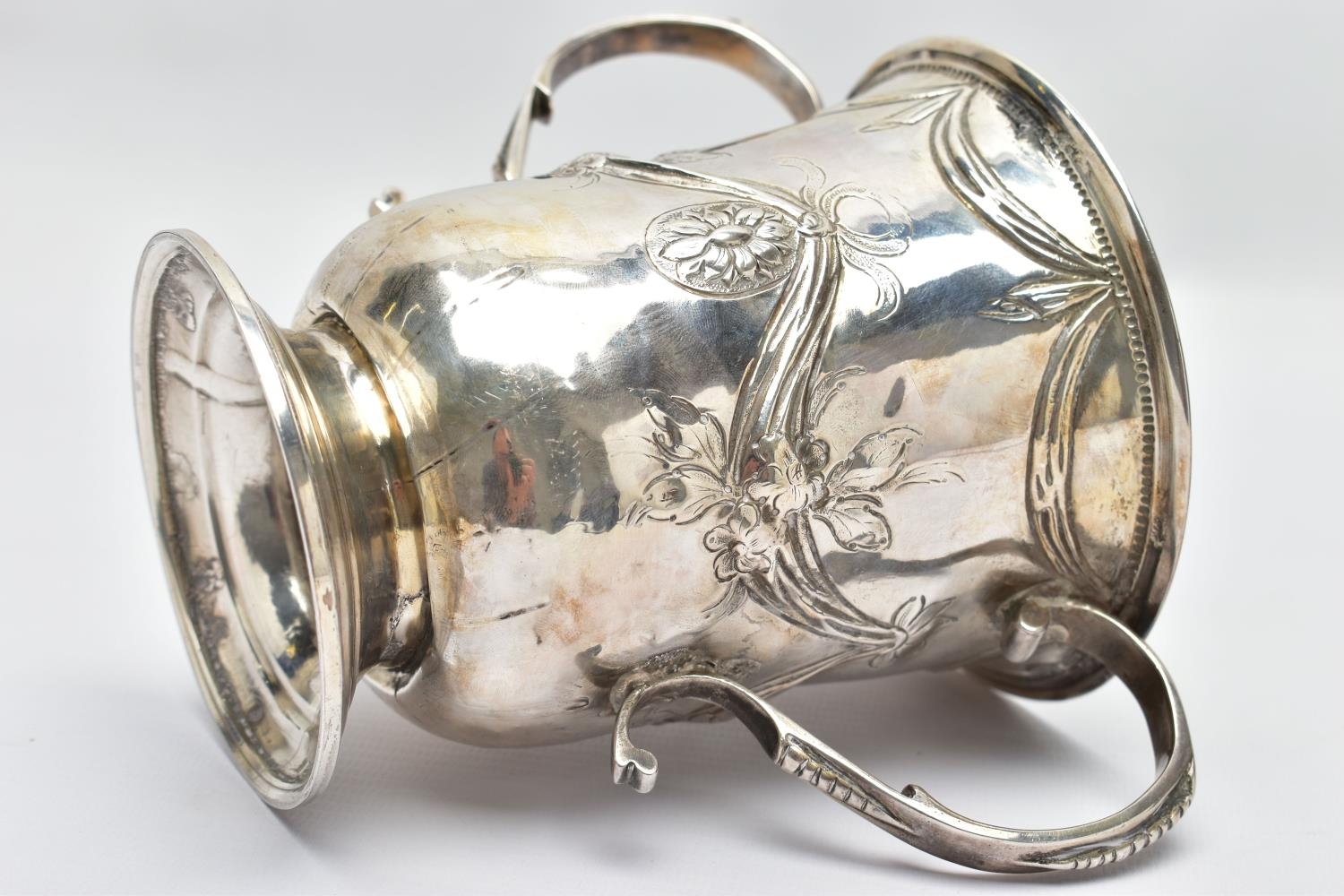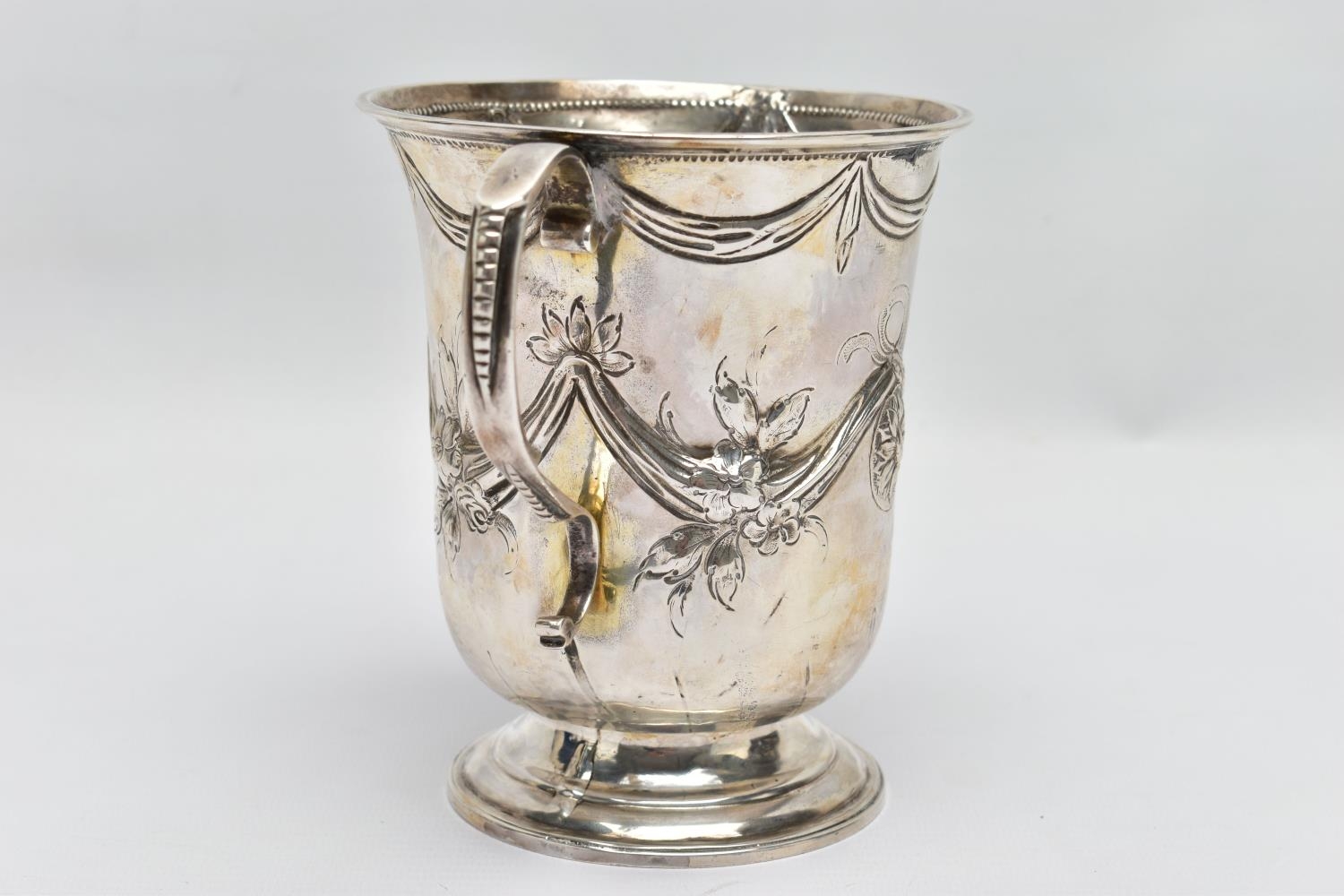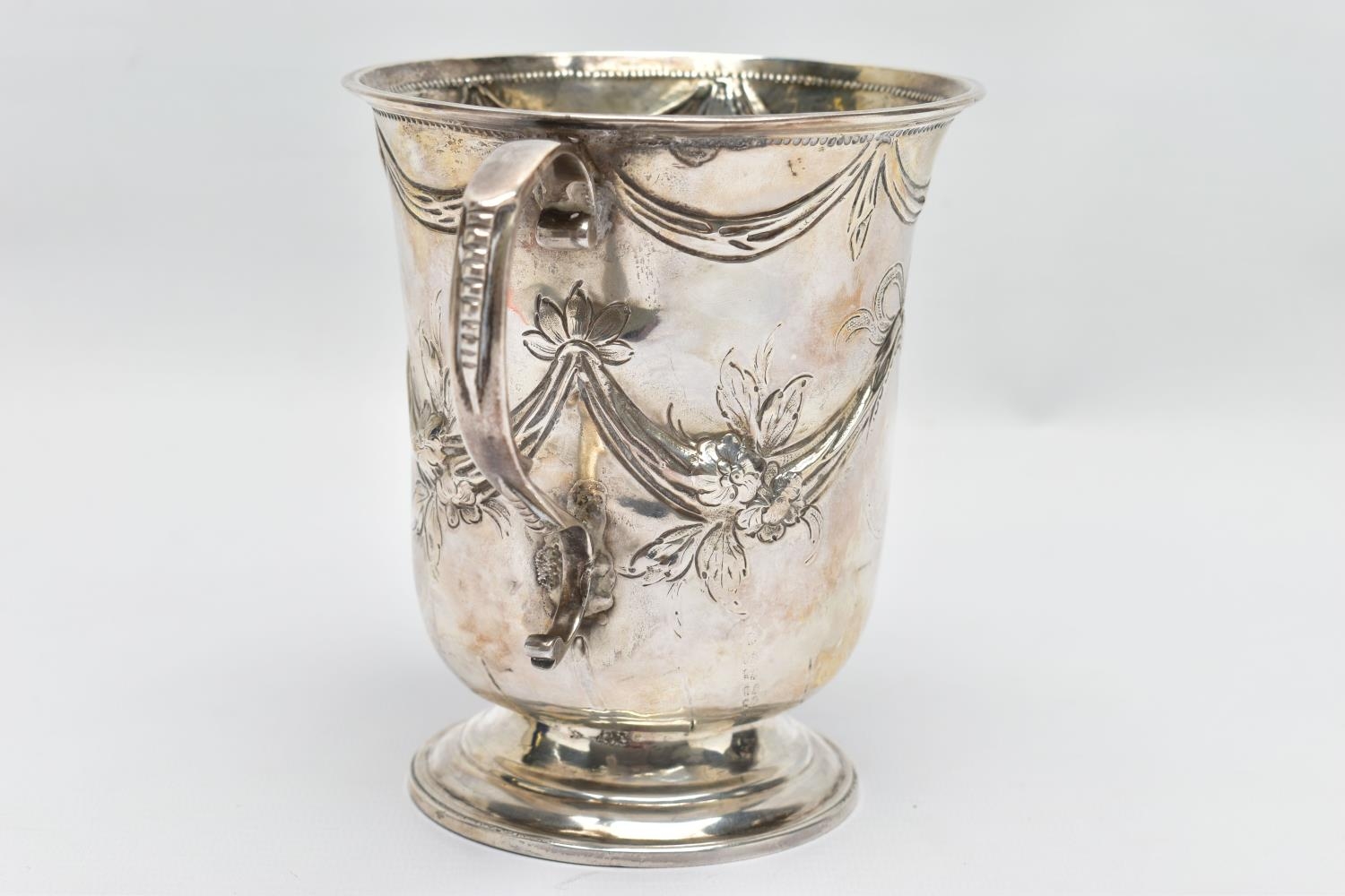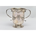 A GEORGE III SILVER LOVING CUP, bell shape body with embossed and chased floral and swag design with vacant oval cartouche (possibly erased), fitted with double scroll handles, raised on a slightly stepped round base, approximate height 140mm, indistinct makers mark for London 1786, approximate gross weight 9.29 ozt, 289.2 grams (condition report: heavily dented all round, visible heavy solder marks to the base, underneath of the base and handles, repairs and damage, discolouration and tarnishing to the interior, wear to some of the detailing, condition poor/fair)