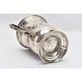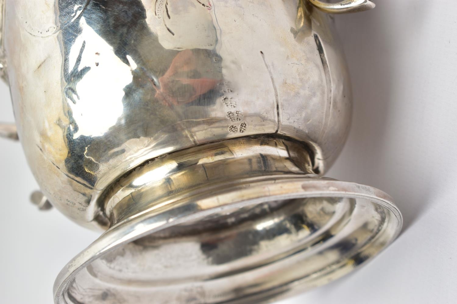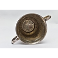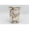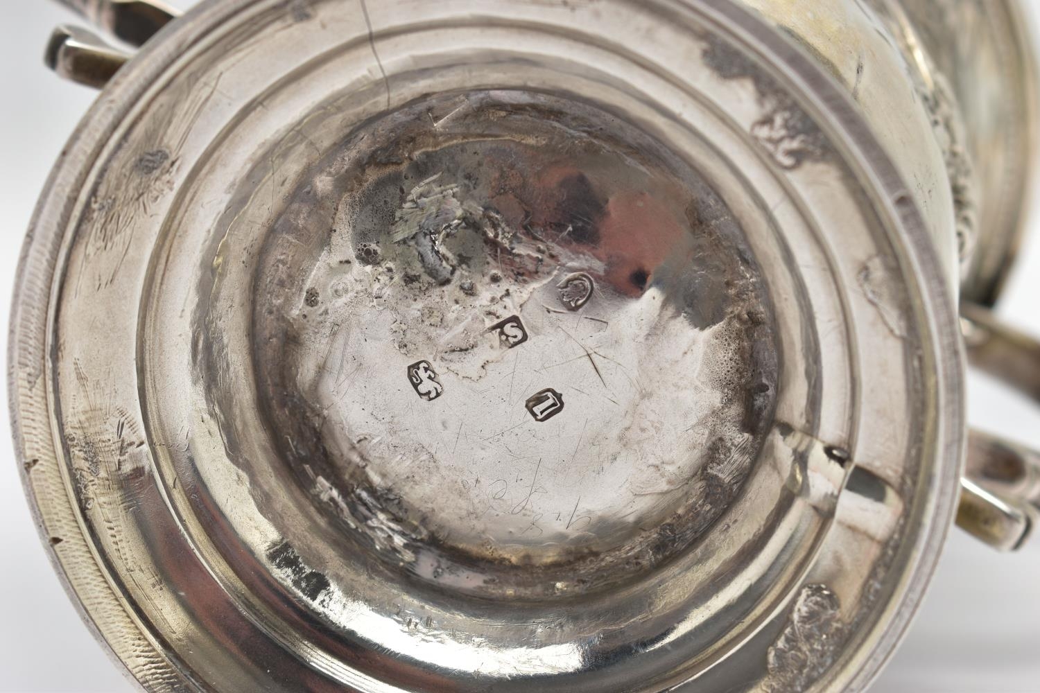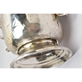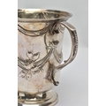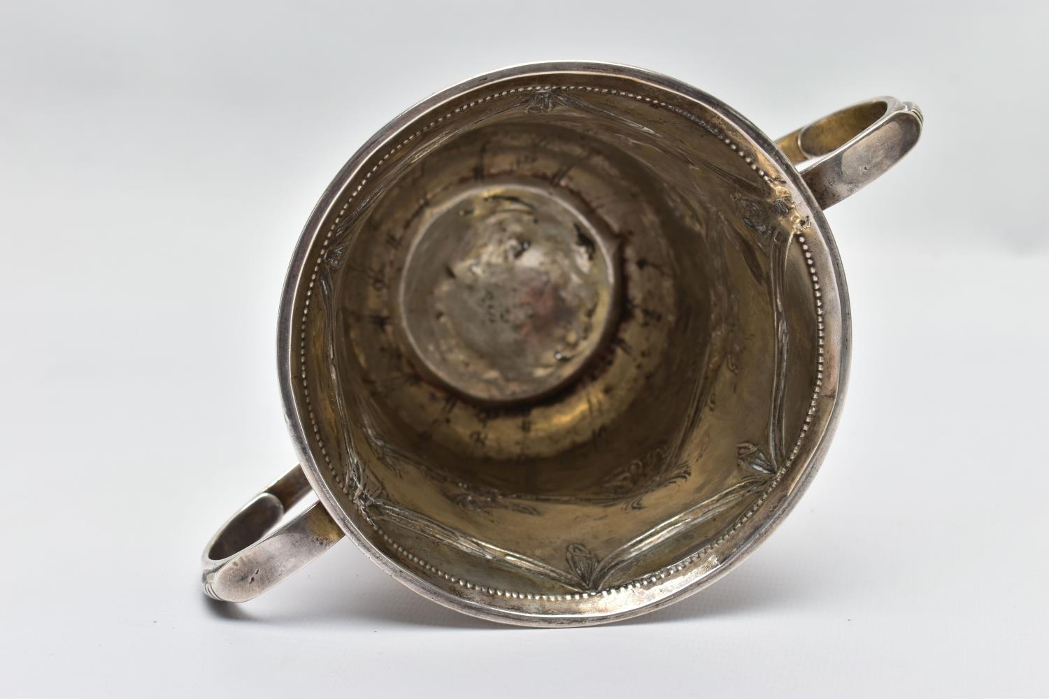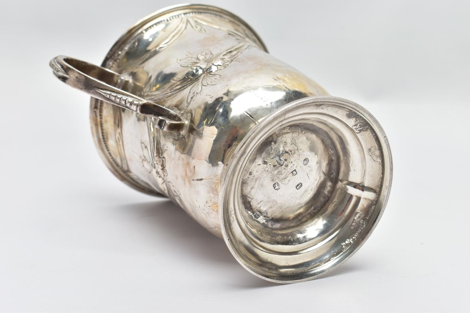 A GEORGE III SILVER LOVING CUP, bell shape body with embossed and chased floral and swag design with vacant oval cartouche (possibly erased), fitted with double scroll handles, raised on a slightly stepped round base, approximate height 140mm, indistinct makers mark for London 1786, approximate gross weight 9.29 ozt, 289.2 grams (condition report: heavily dented all round, visible heavy solder marks to the base, underneath of the base and handles, repairs and damage, discolouration and tarnishing to the interior, wear to some of the detailing, condition poor/fair)