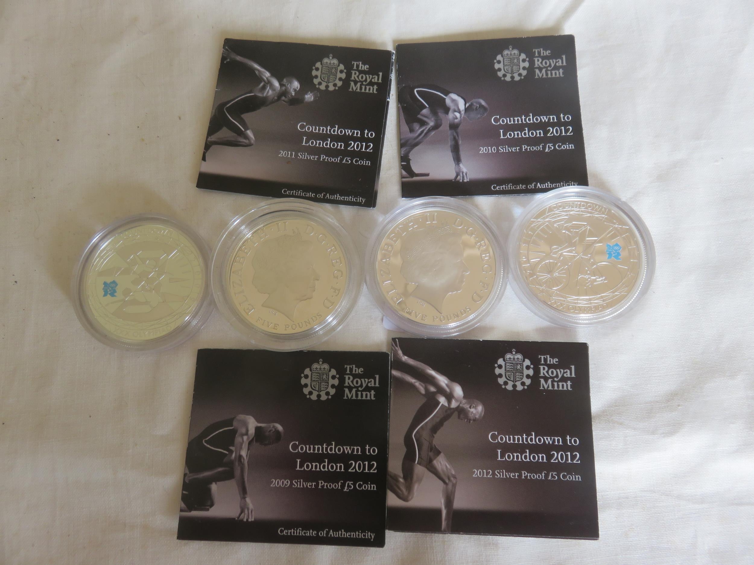 Four Royal Mint 925 Silver Proof £5 coins 28.28 grams "Countdown to London 2012" coins are dated 2009, 2010, 2011, 2012. All are capsulated and have individual certificates of authenticity