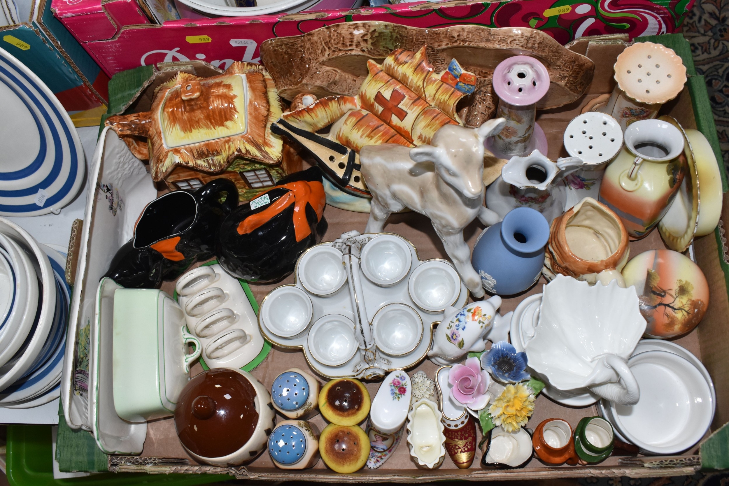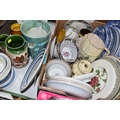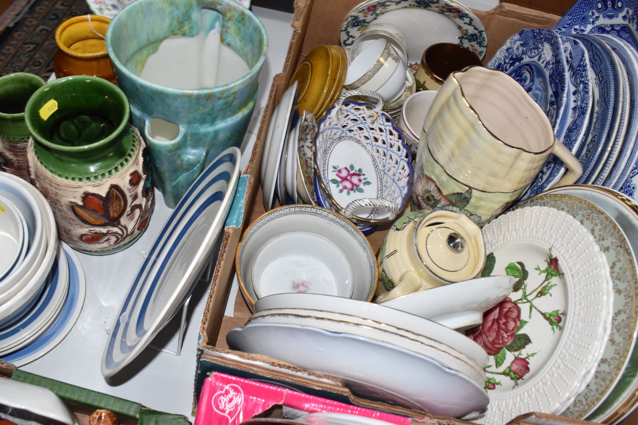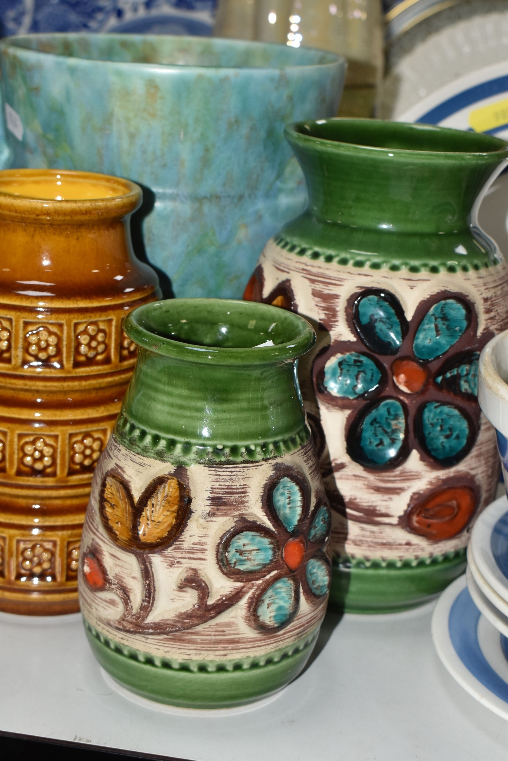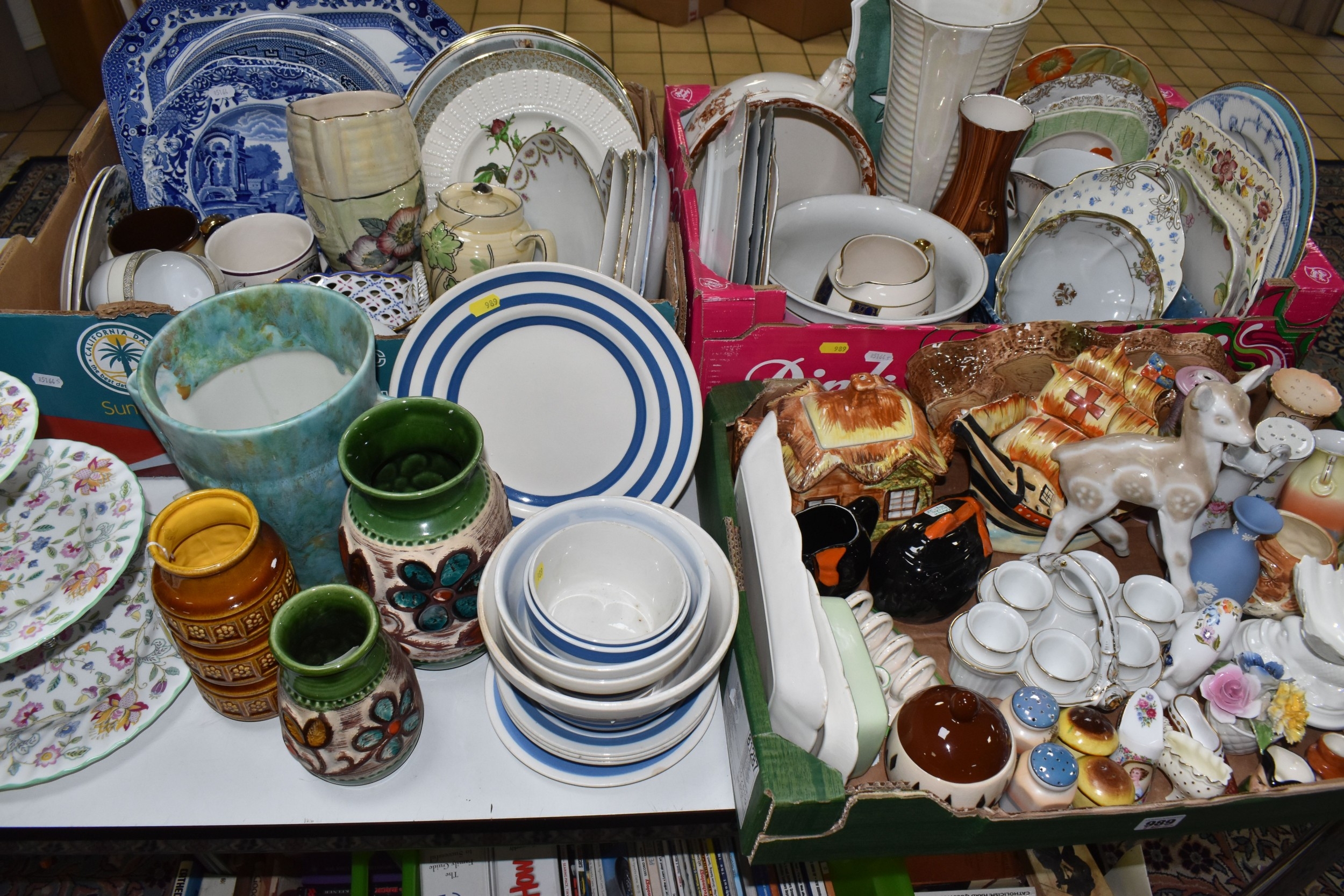 THREE BOXES AND LOOSE CERAMICS, to include three West German vases: a tan Scheurich 268-18 'Alaska' vase, and two Bay vases 94-14 and 94-20, blue and white striped tableware including two TG Green Cornish ware bowls and three pudding basins impressed 'Made in England', a Minton Haddon Hall three tier cake stand, a Beswick Art Deco vase, no 29, height 22.5cm, blue and white dinnerware including Spode's Italian, a Royal Worcester Blanc de Chine bowl in the form of a fish and scallop shell, etc (3 boxes + loose) (sd)