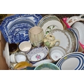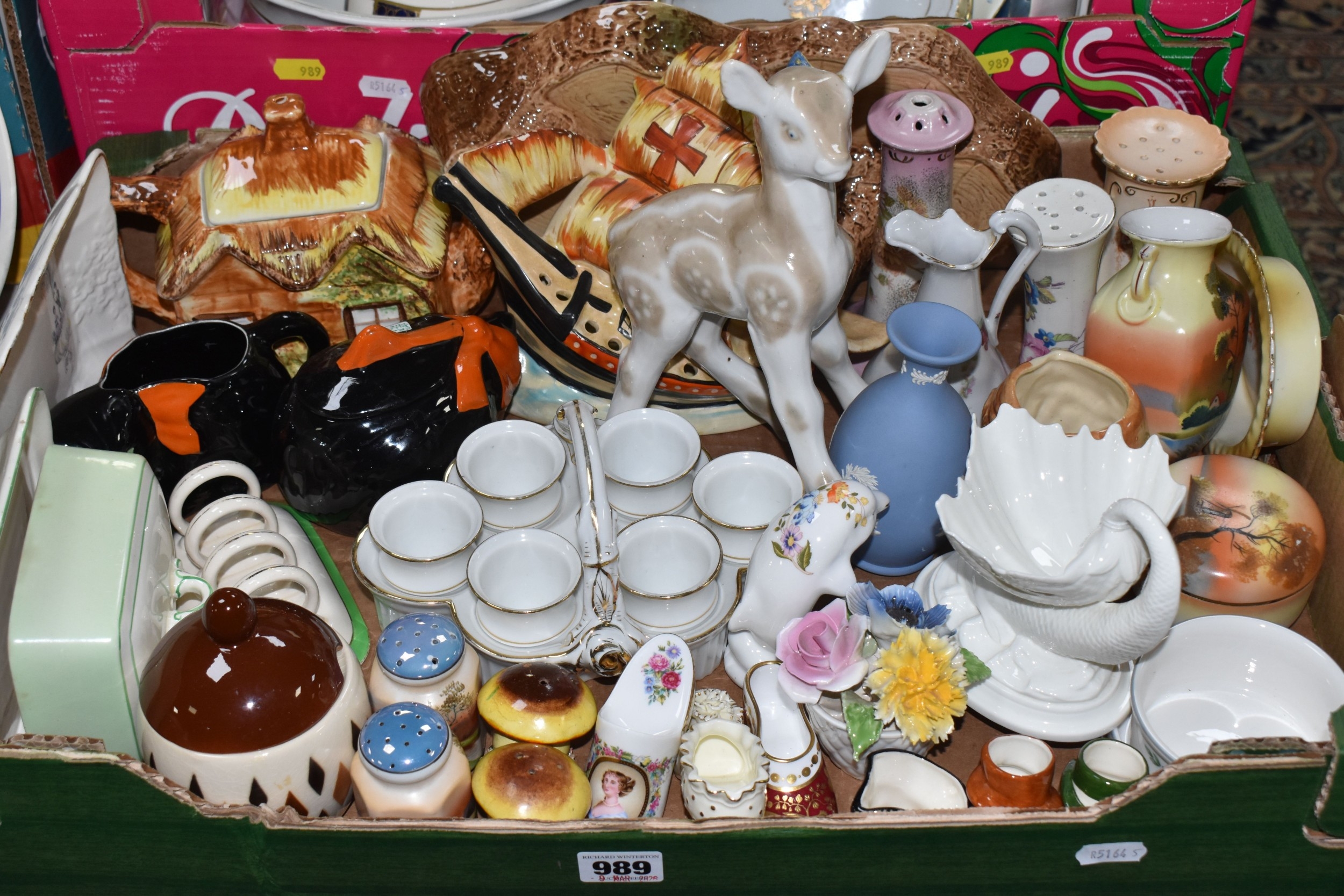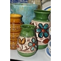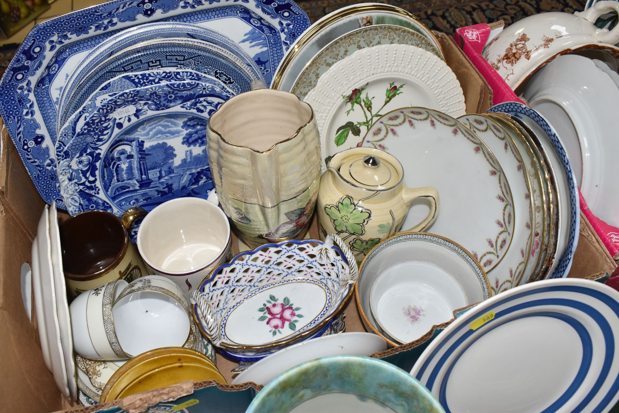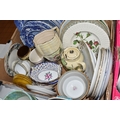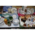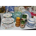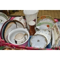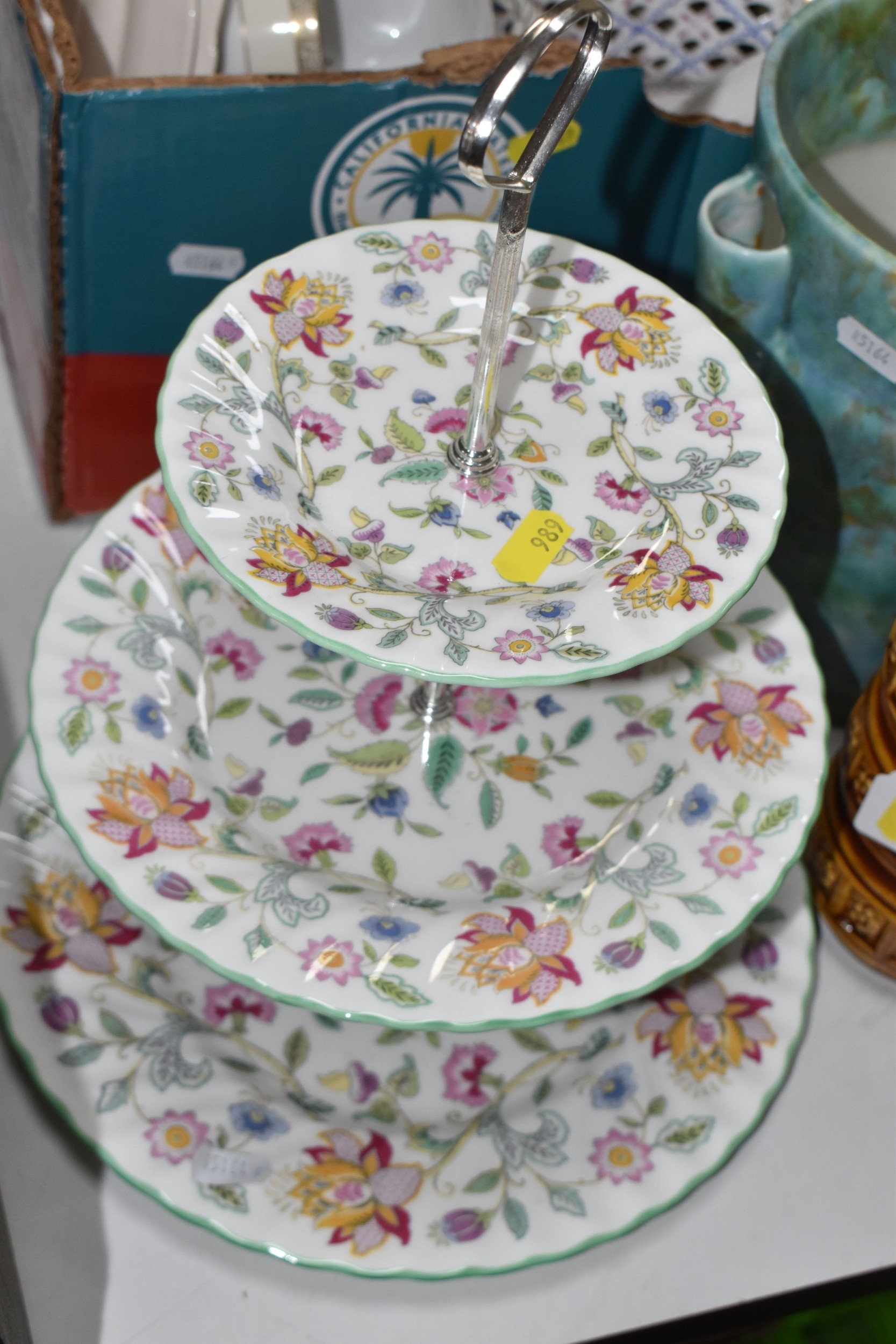 THREE BOXES AND LOOSE CERAMICS, to include three West German vases: a tan Scheurich 268-18 'Alaska' vase, and two Bay vases 94-14 and 94-20, blue and white striped tableware including two TG Green Cornish ware bowls and three pudding basins impressed 'Made in England', a Minton Haddon Hall three tier cake stand, a Beswick Art Deco vase, no 29, height 22.5cm, blue and white dinnerware including Spode's Italian, a Royal Worcester Blanc de Chine bowl in the form of a fish and scallop shell, etc (3 boxes + loose) (sd)