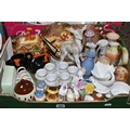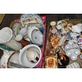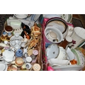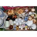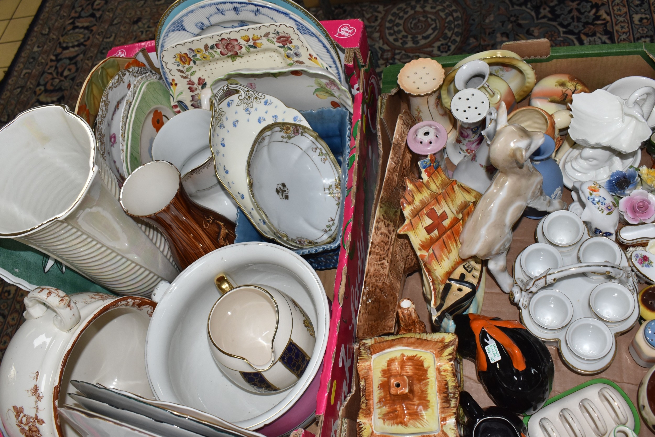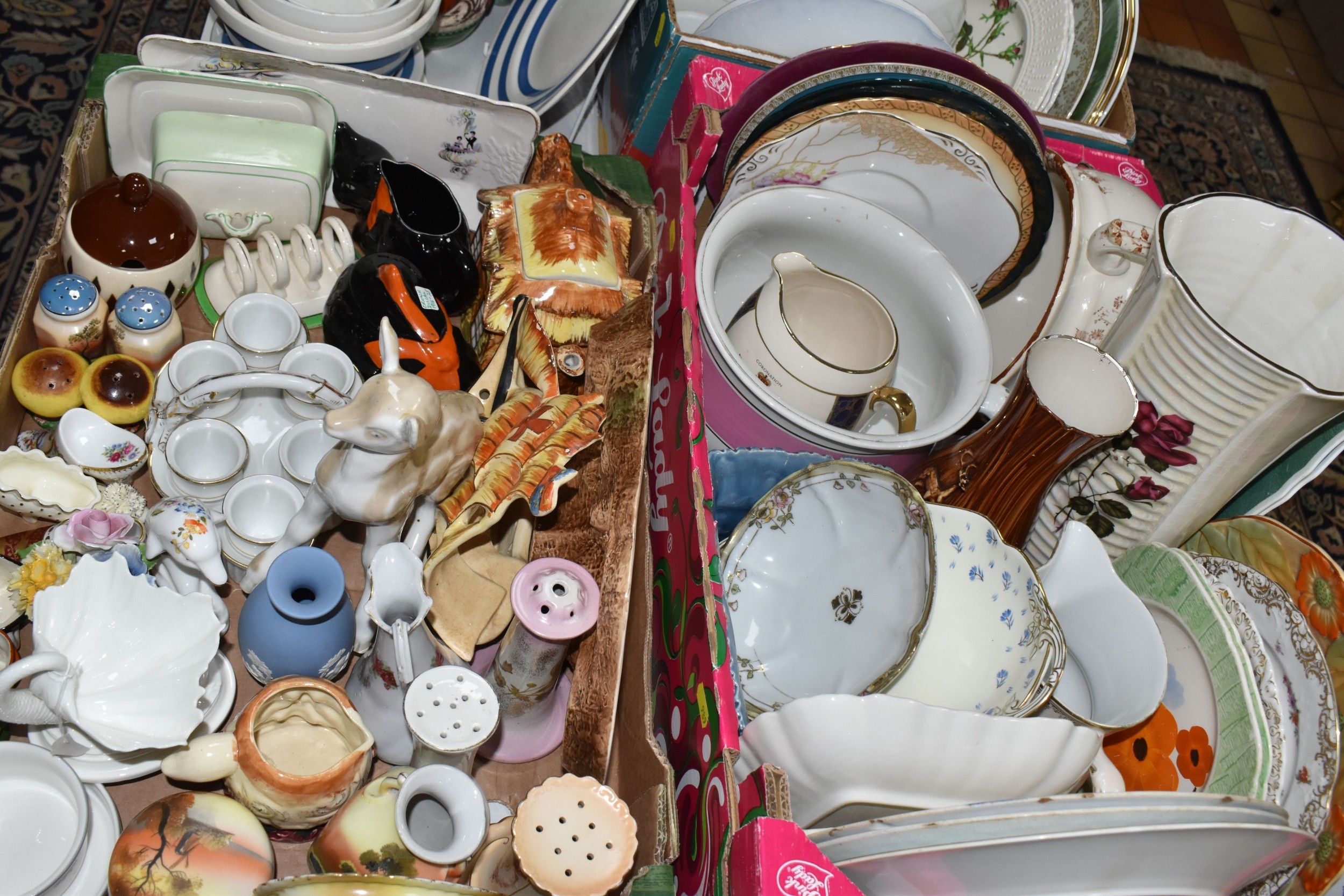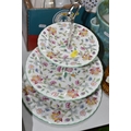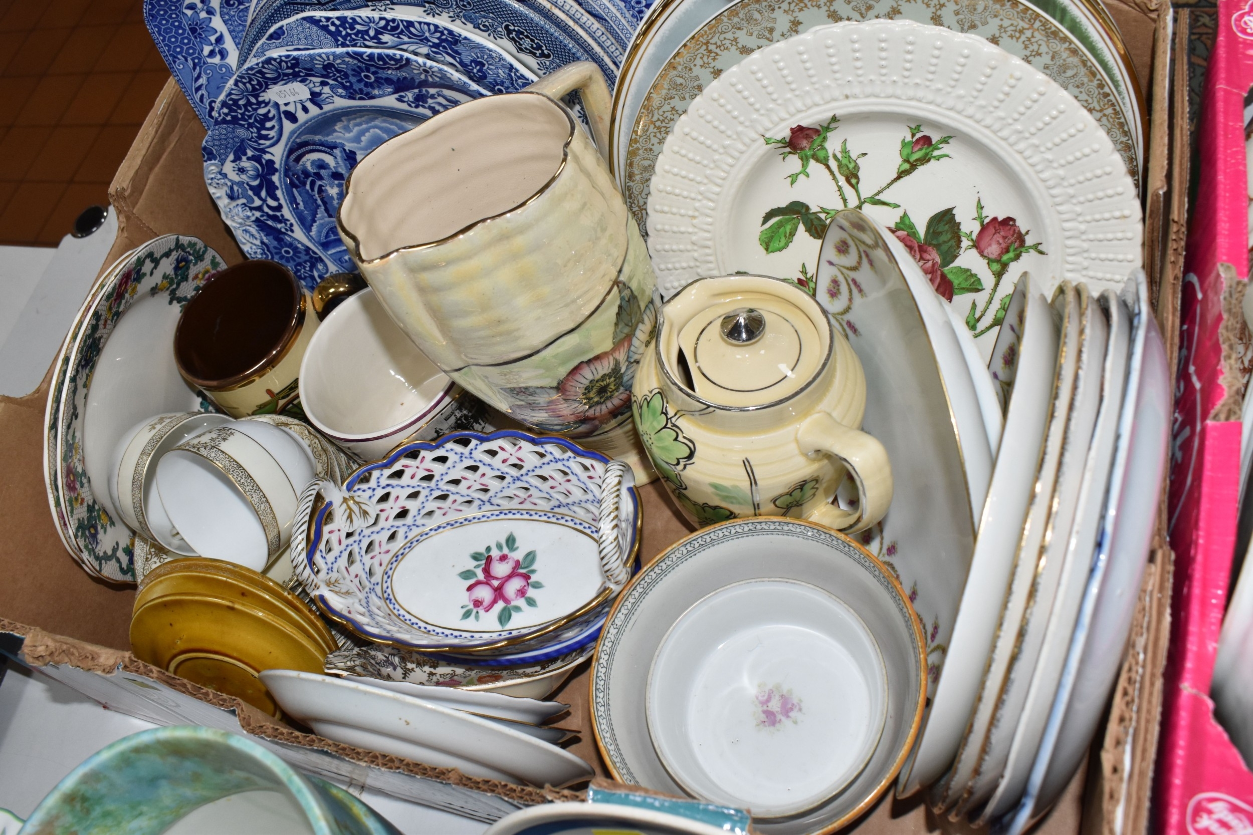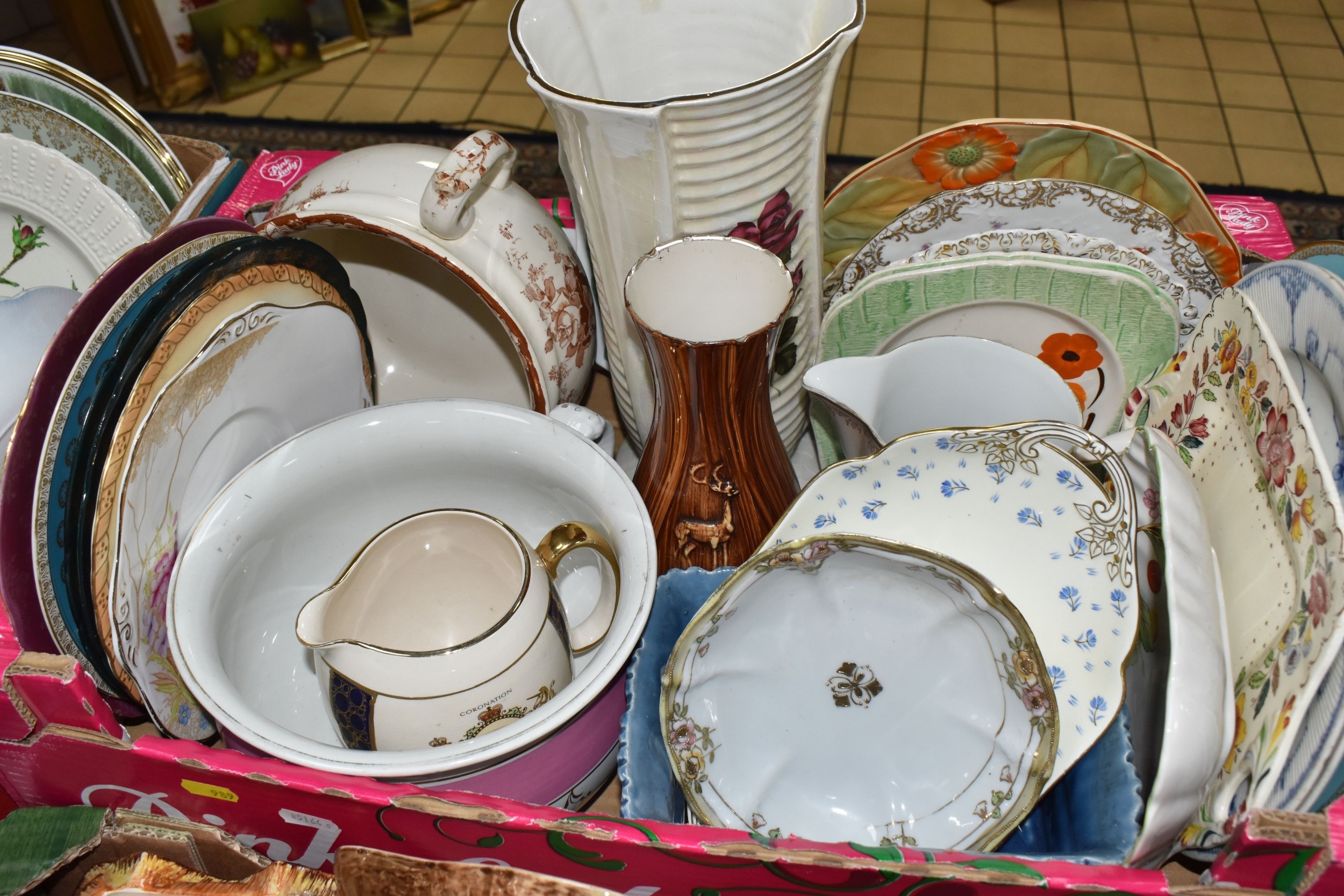 THREE BOXES AND LOOSE CERAMICS, to include three West German vases: a tan Scheurich 268-18 'Alaska' vase, and two Bay vases 94-14 and 94-20, blue and white striped tableware including two TG Green Cornish ware bowls and three pudding basins impressed 'Made in England', a Minton Haddon Hall three tier cake stand, a Beswick Art Deco vase, no 29, height 22.5cm, blue and white dinnerware including Spode's Italian, a Royal Worcester Blanc de Chine bowl in the form of a fish and scallop shell, etc (3 boxes + loose) (sd)