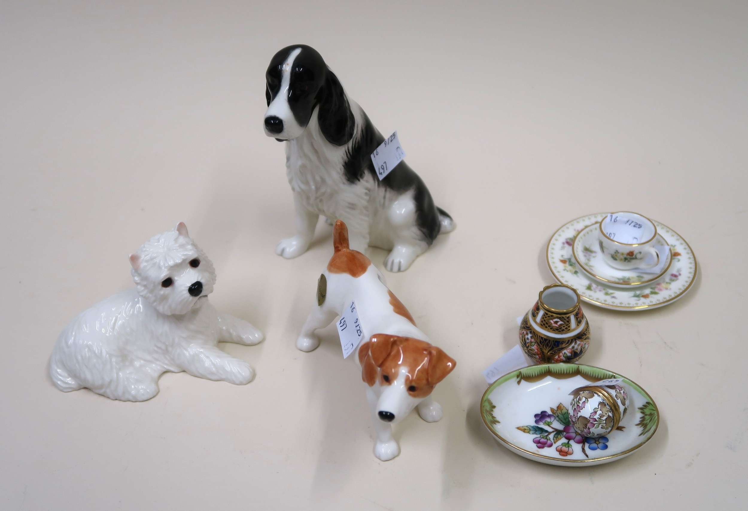 Miniature Royal Crown Derby Imari pattern vase, miniature Wedgwood trio, three modern John Beswick figures and two other items
