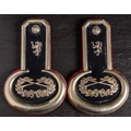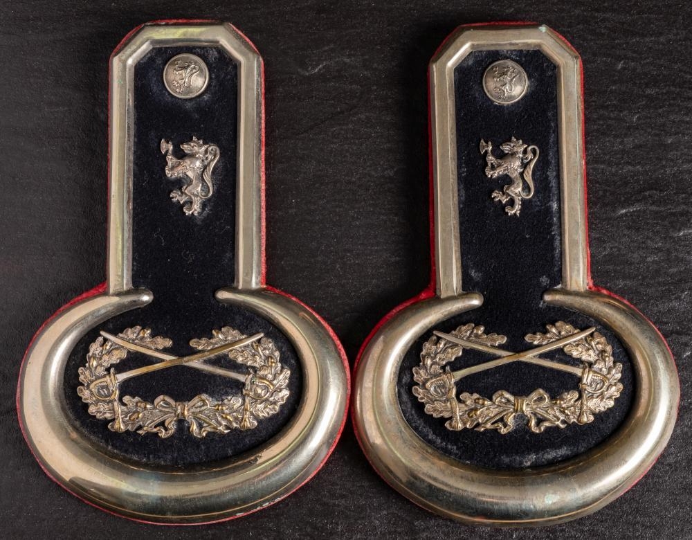 A pair of Scottish silver plated epaulettes by G Larken: lion rampant with axe over crossed swords within a laurel wreath,