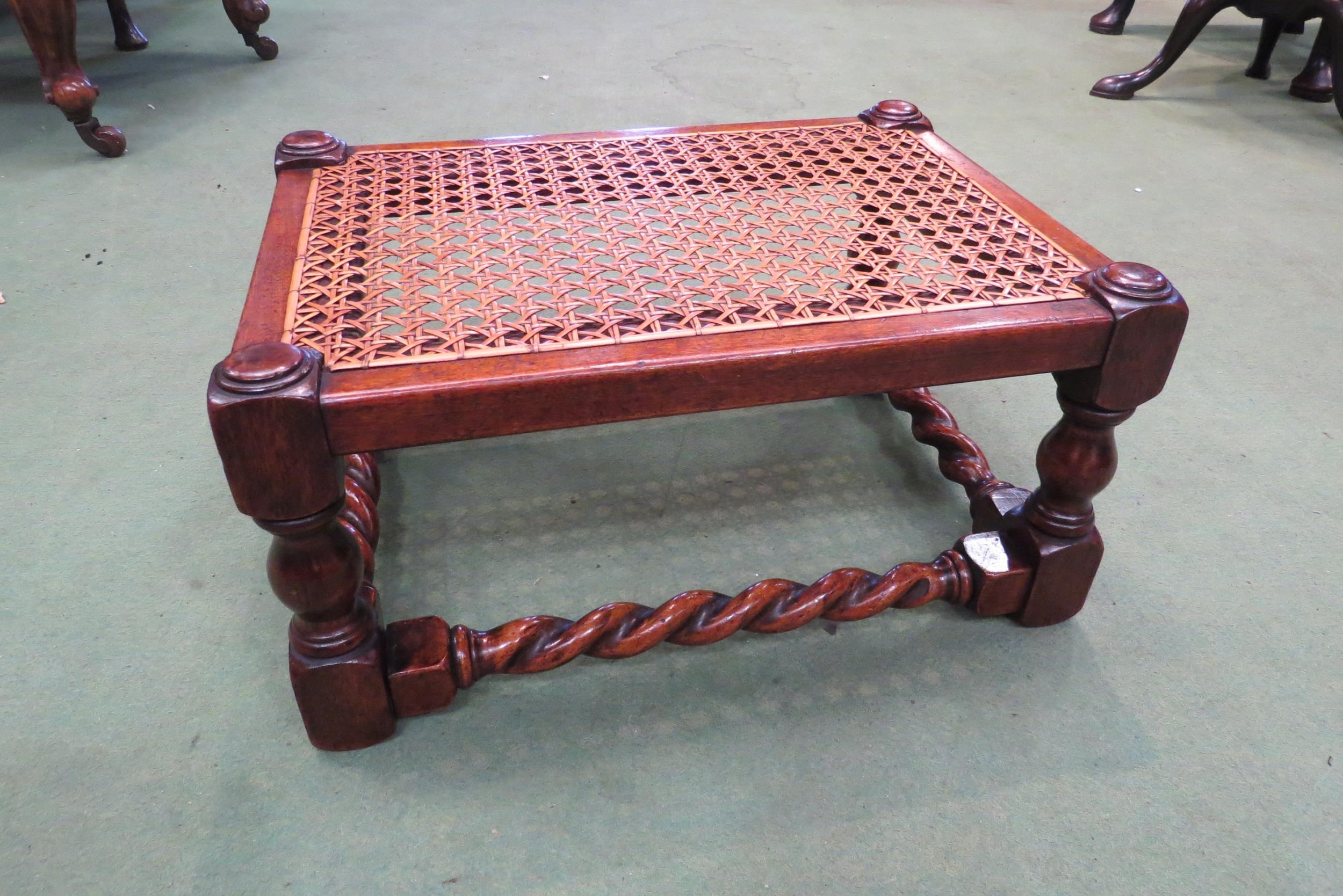 A Victorian walnut stool with cane seat on turned legs united by barley-twist stretchers, 22cm tall x 45cm long x 33cm wide (R) £30