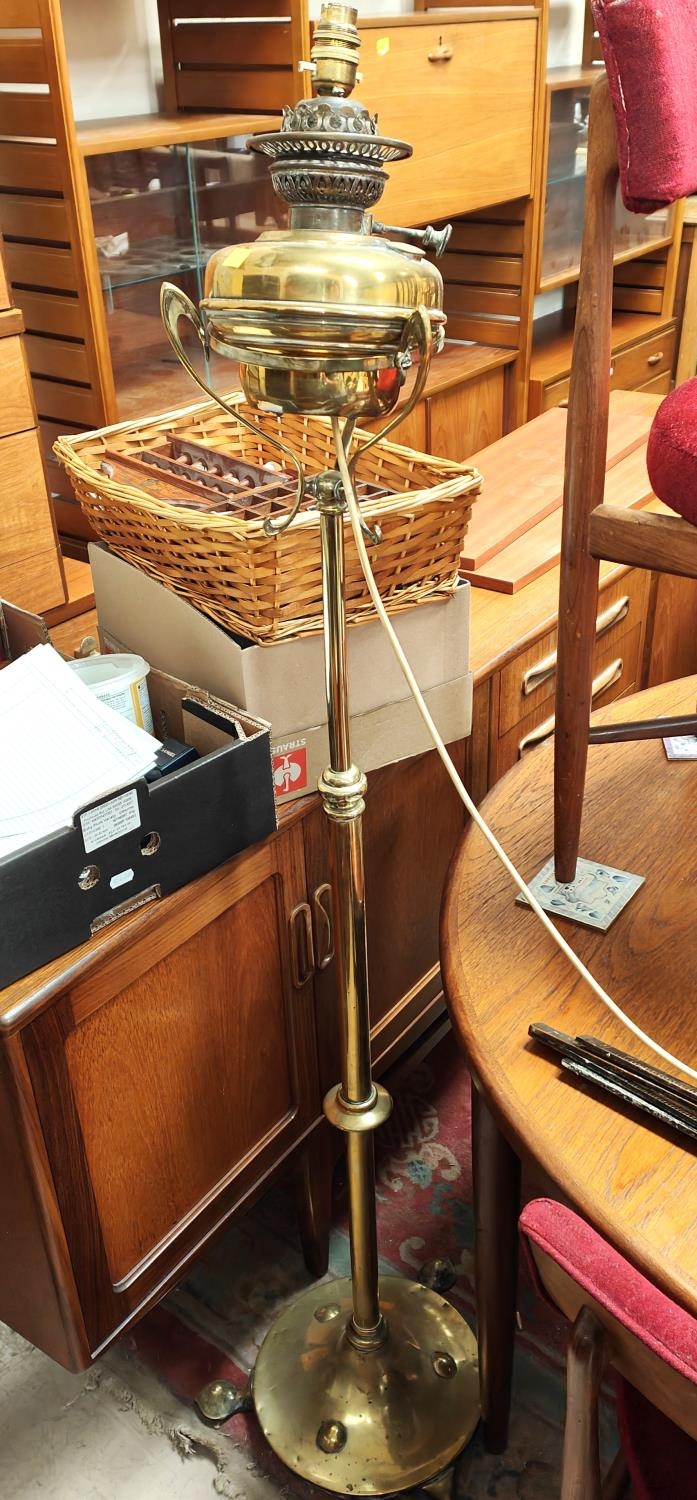 A Victorian standard oil lamp, turned brass in the Art Nouveau style on circular base and triple feet (converted)