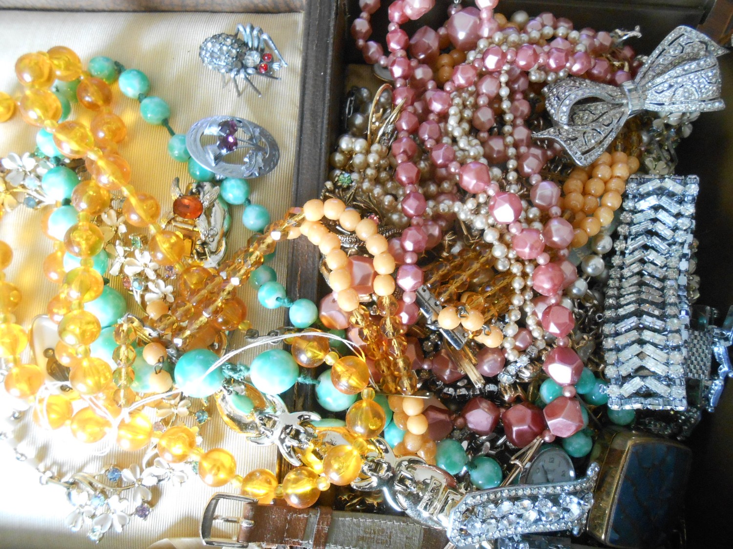 A selection of costume jewellery including bead necklaces, paste set brooch in the form of a spider, fob watches, earrings, cufflinks etc..