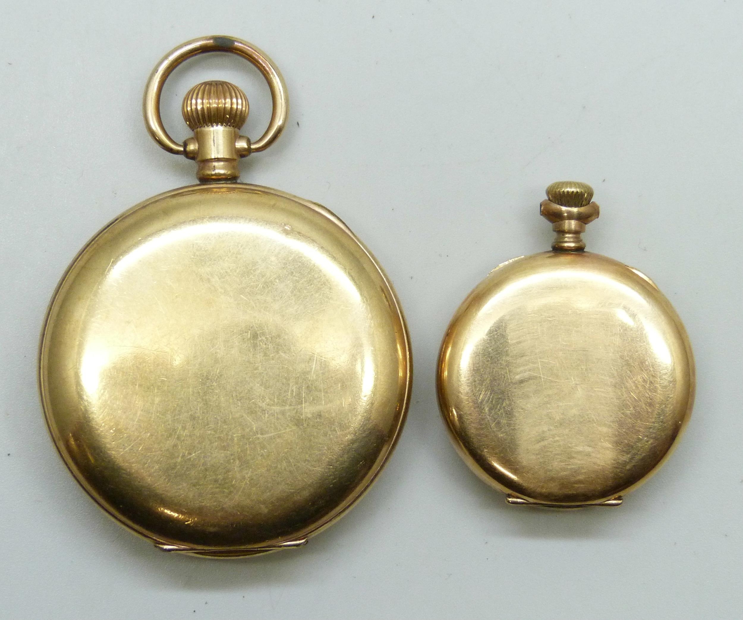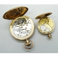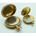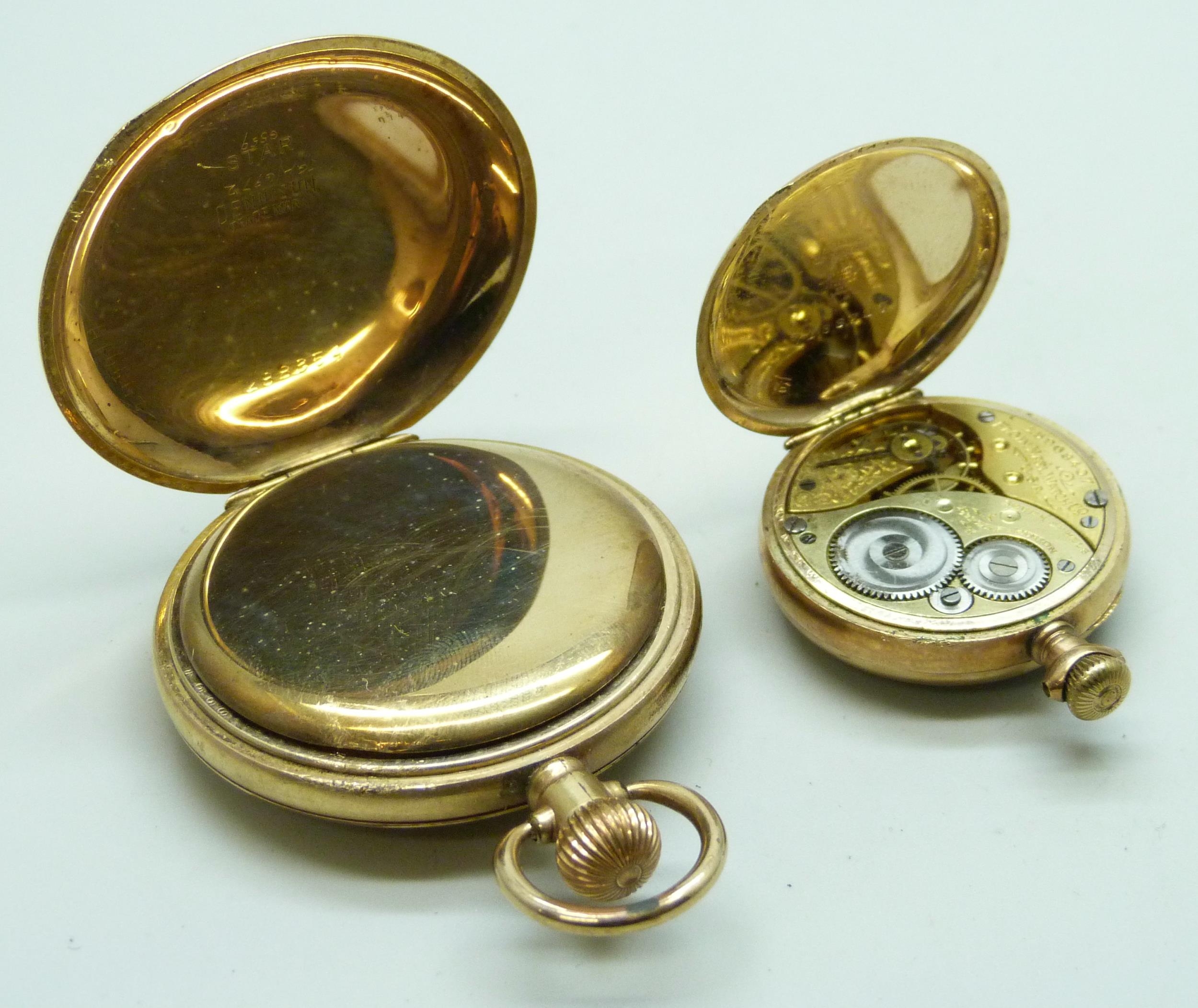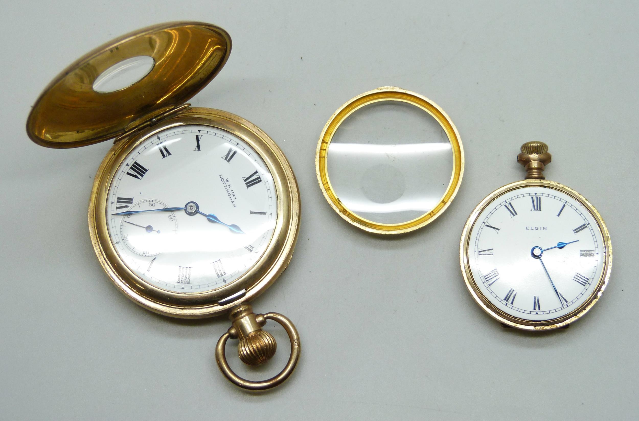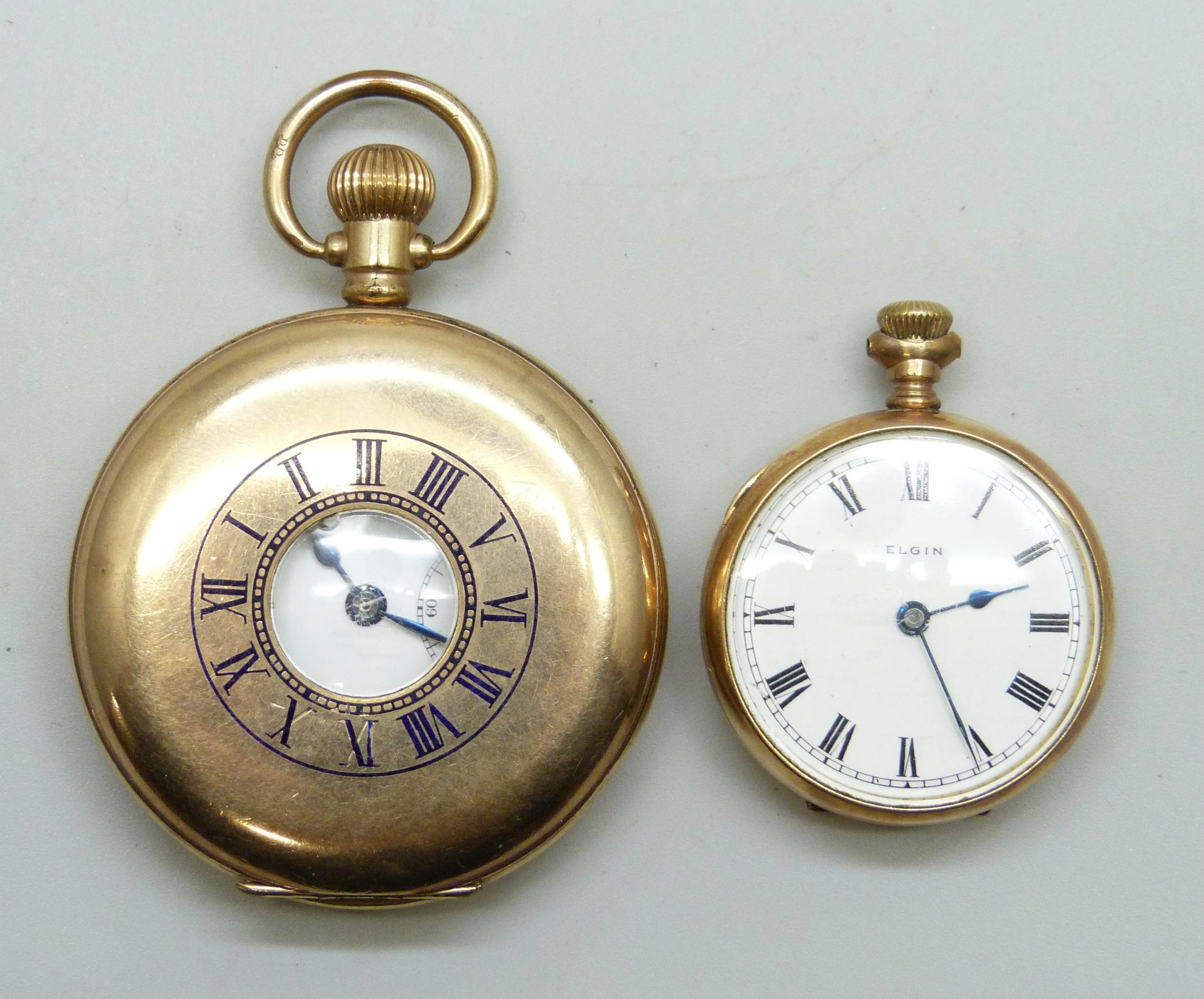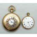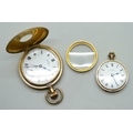 Two gold plated watches, a fob watch, and a half hunter pocket watch with enamel numerals