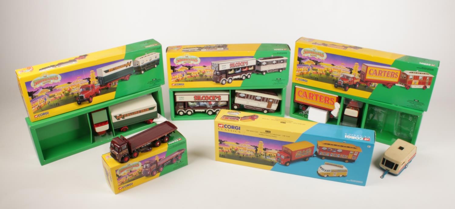 A collection of five Corgi Showmans Range vehicles - comprising of two Scammell Highwayman Ballast with closed pole trailer & caravan sets (16502 & 16501) 1995, Leyland 8 Wheel Rigid Truck Set (24401) 1995, & ERF Box Van, VW Van & Caravan (31702) 1996 etc.